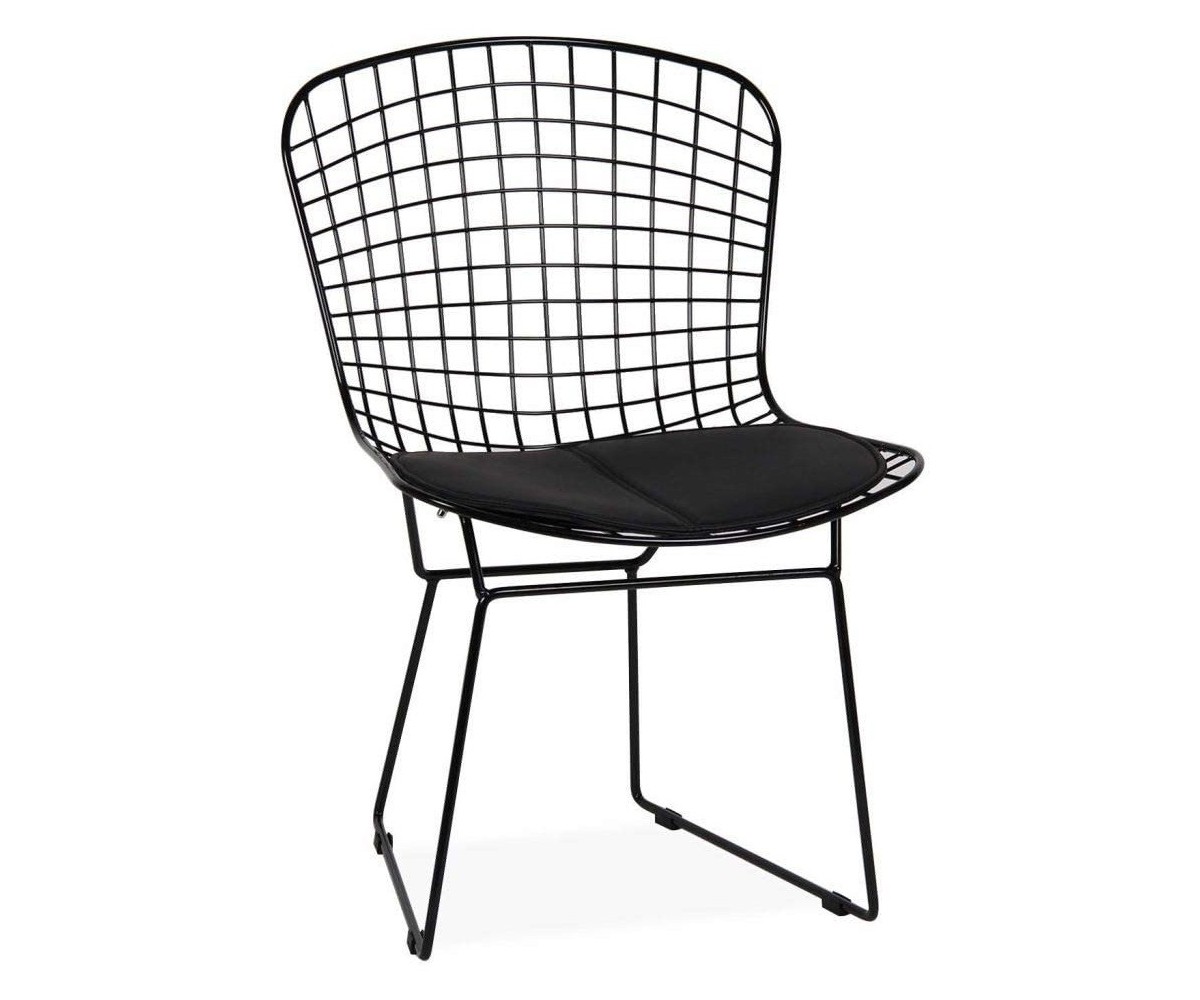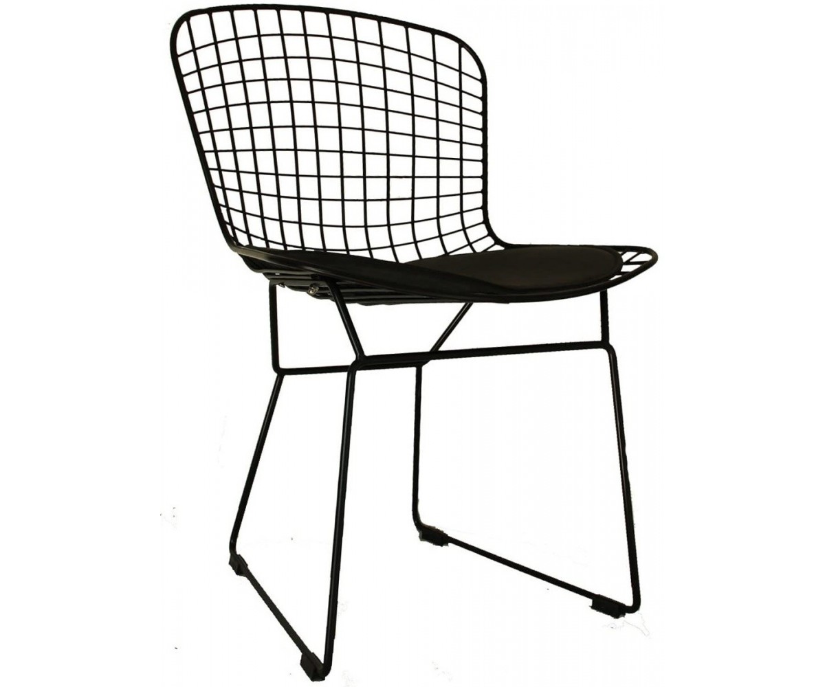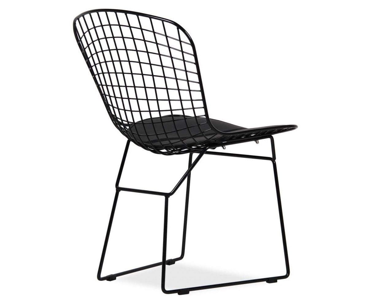 Silla inspirada en un diseño de Harry Bertoia. Estructura fabricada con barillas de acero tubular con triple lacado al horno color negro o blanco. Cojín en piel ecológica color negro o blanco. Réplica exacta con materiales originales de máxima calidad.