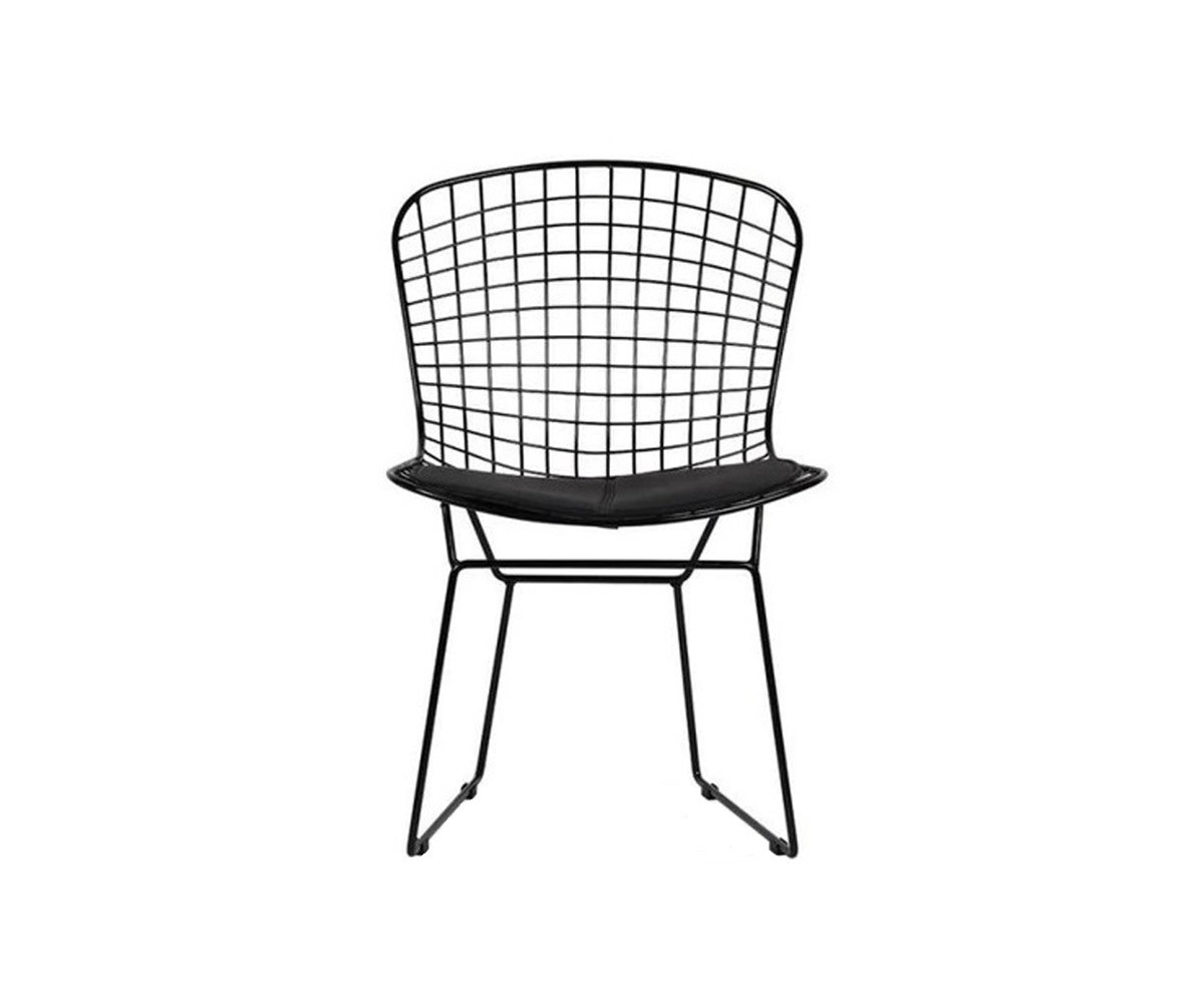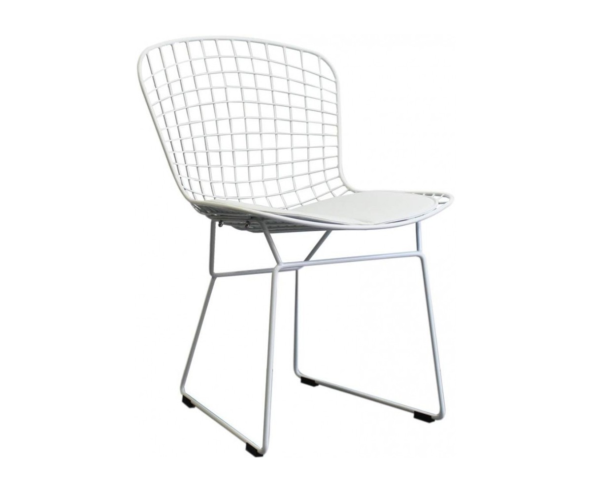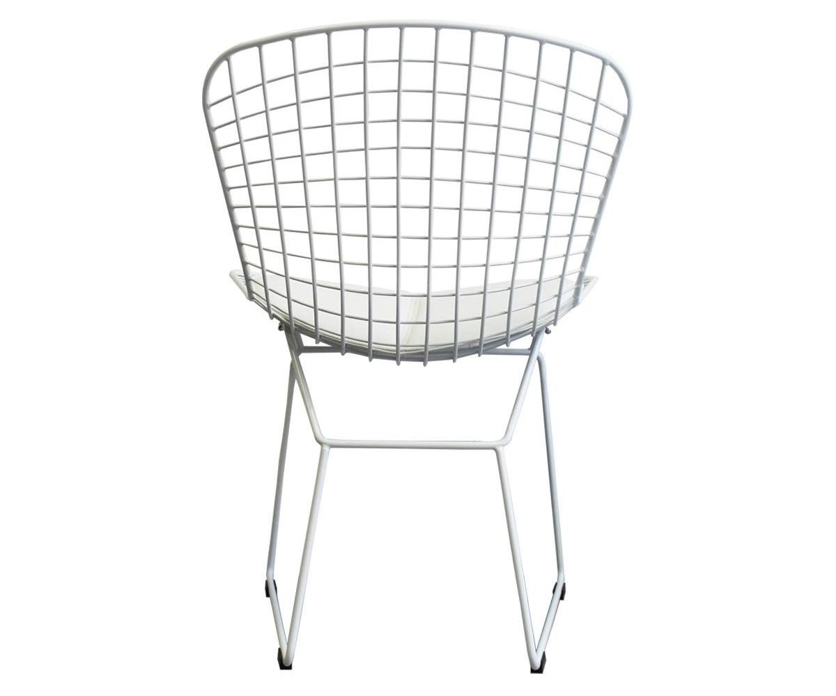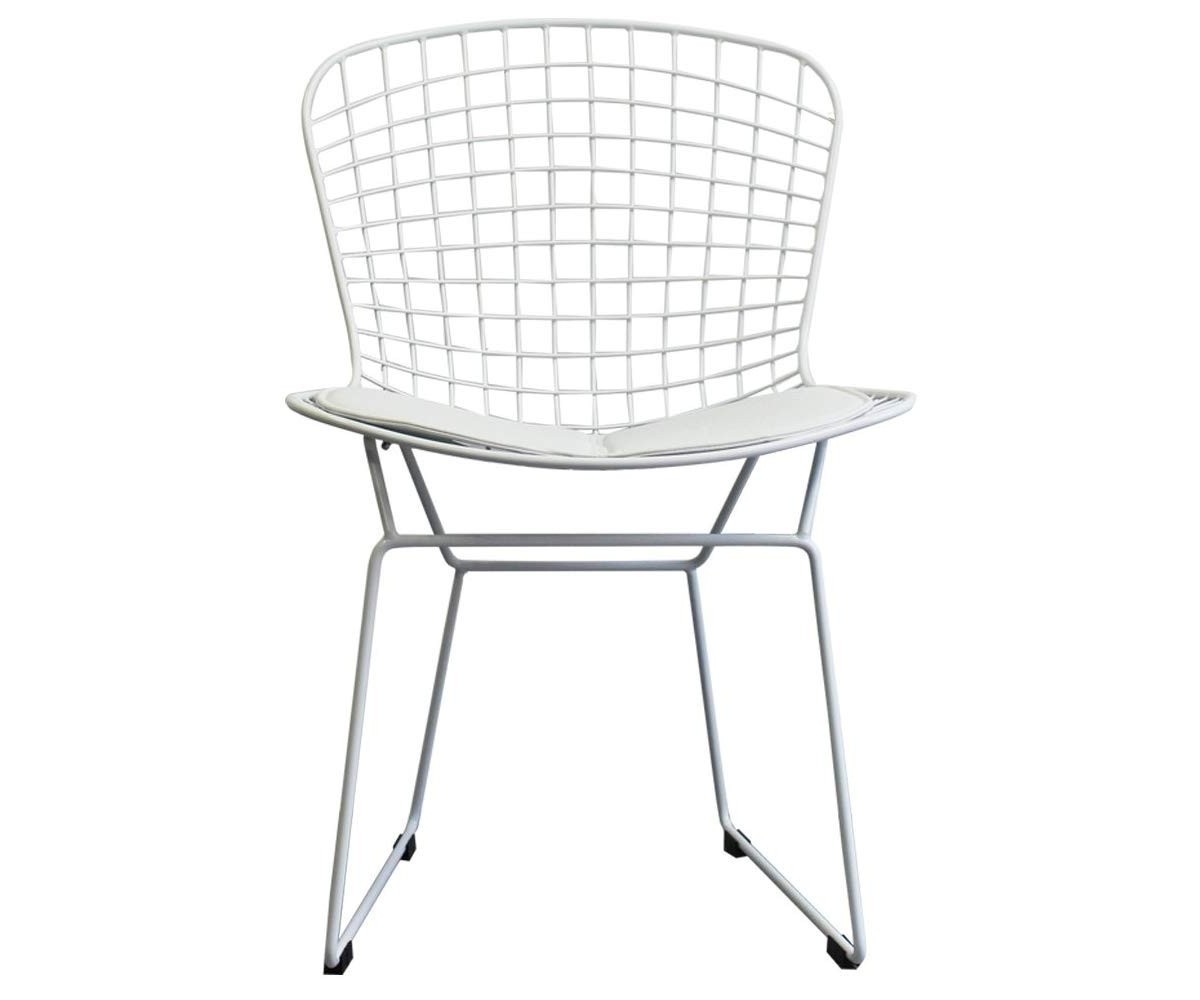 Silla inspirada en un diseño de Harry Bertoia. Estructura fabricada con barillas de acero tubular con triple lacado al horno color negro o blanco. Cojín en piel ecológica color negro o blanco. Réplica exacta con materiales originales de máxima calidad.
