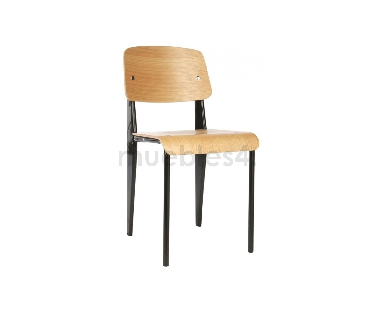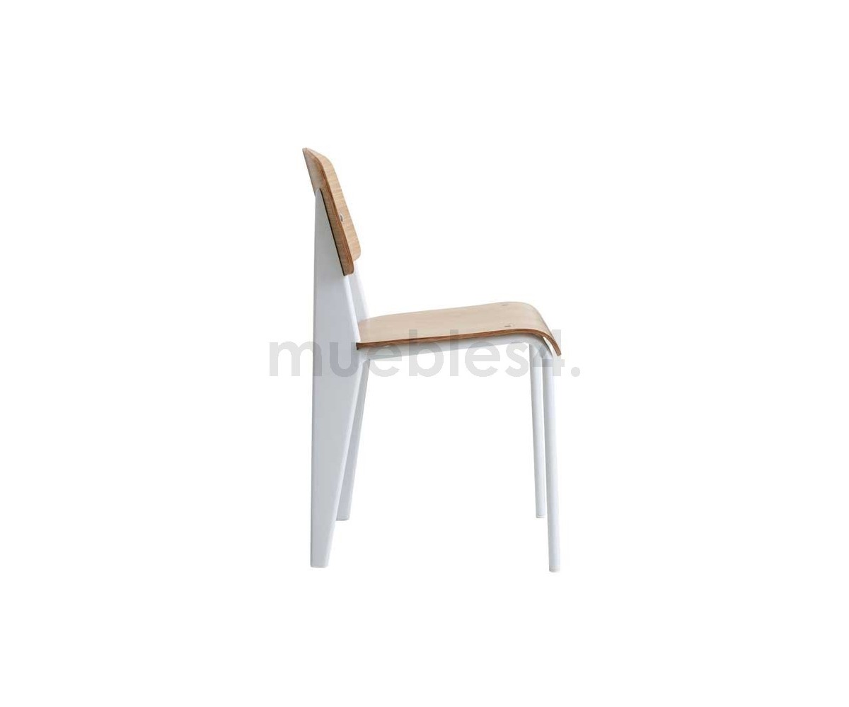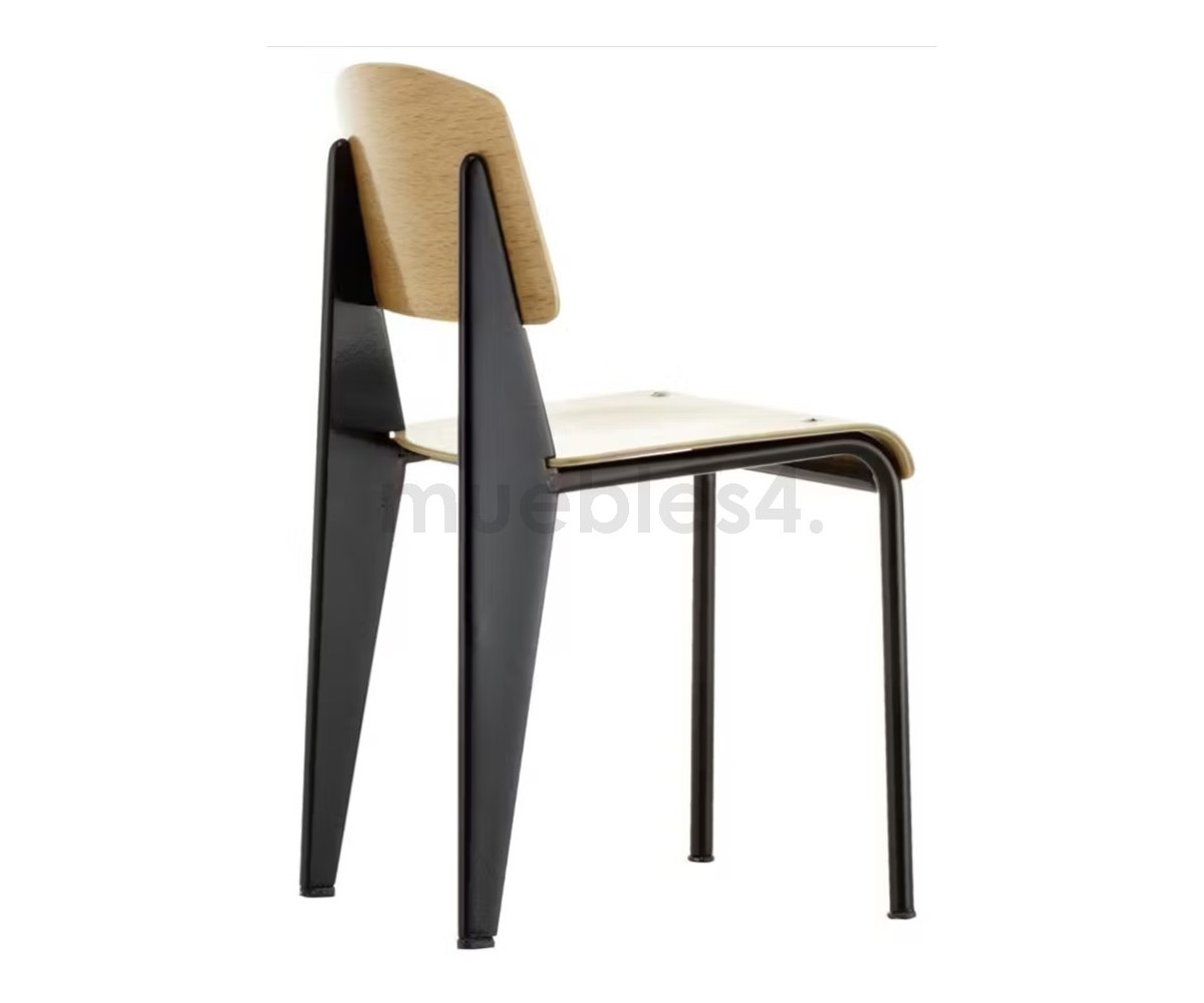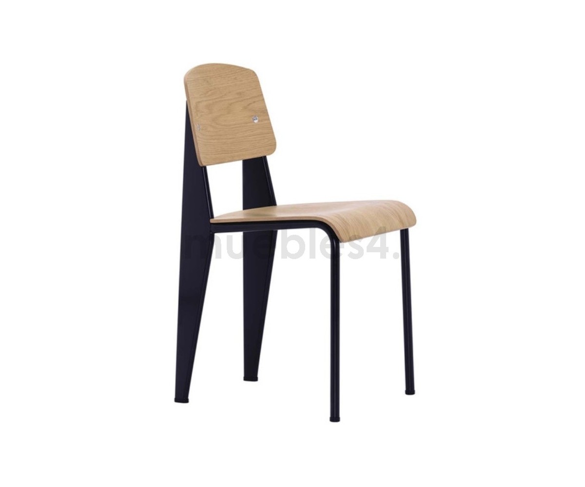 Silla, inspirada en un diseño de Jean Prouvé. La Standard Chair se ha convertido en uno de los clásicos más famosos del diseñador francés. La estructura metálica de esta icónica silla, está disponible en distintos colores. La silla esta pensada y fabricada para soportar mas carga en las patas traseras, donde debe sustentar el peso de la parte superior del cuerpo.