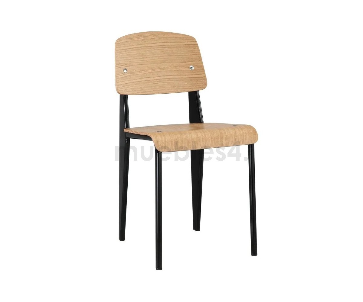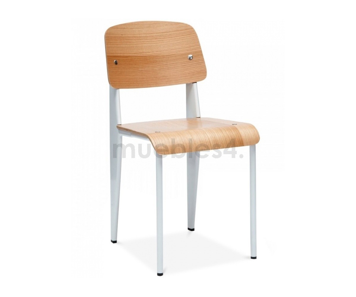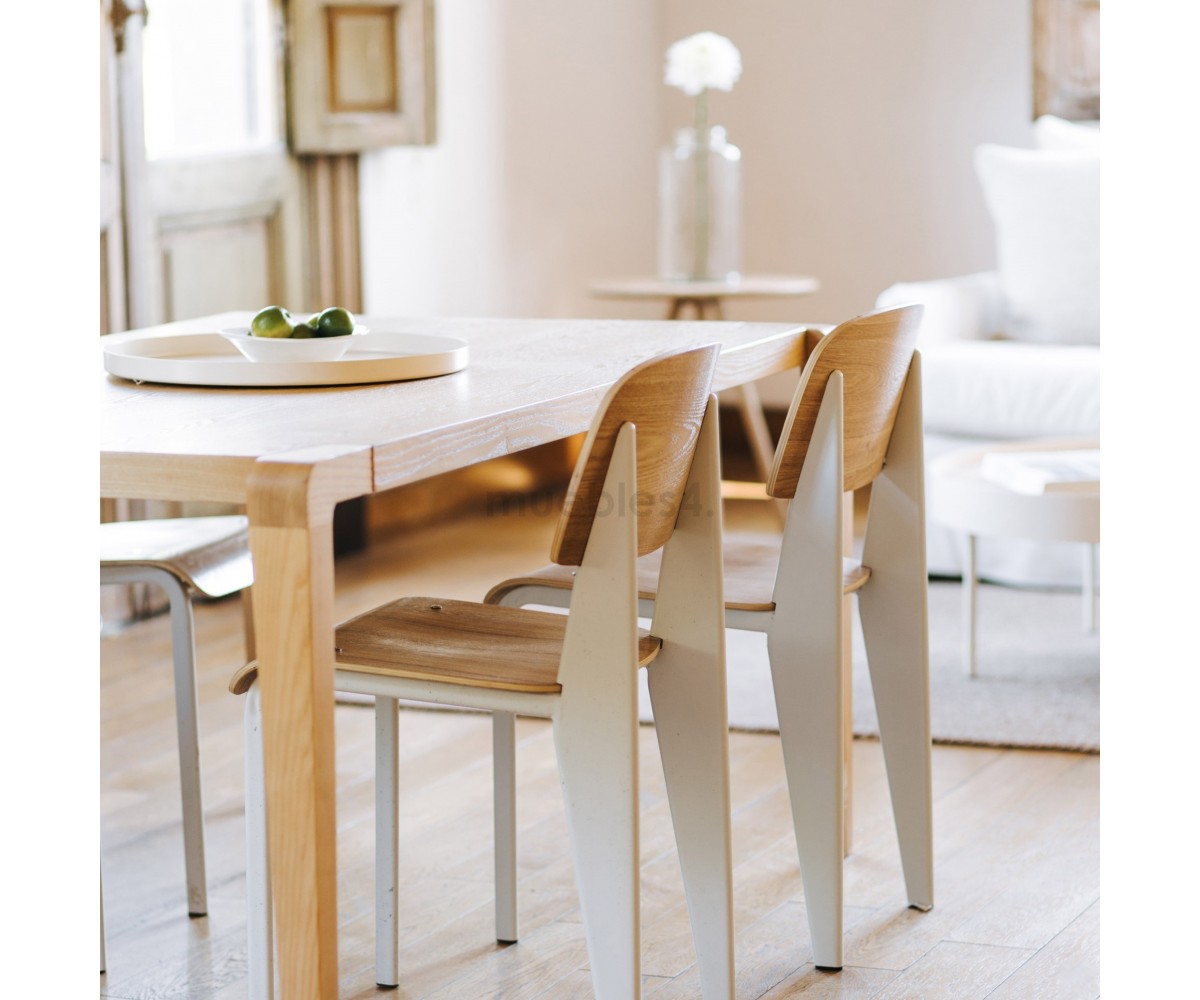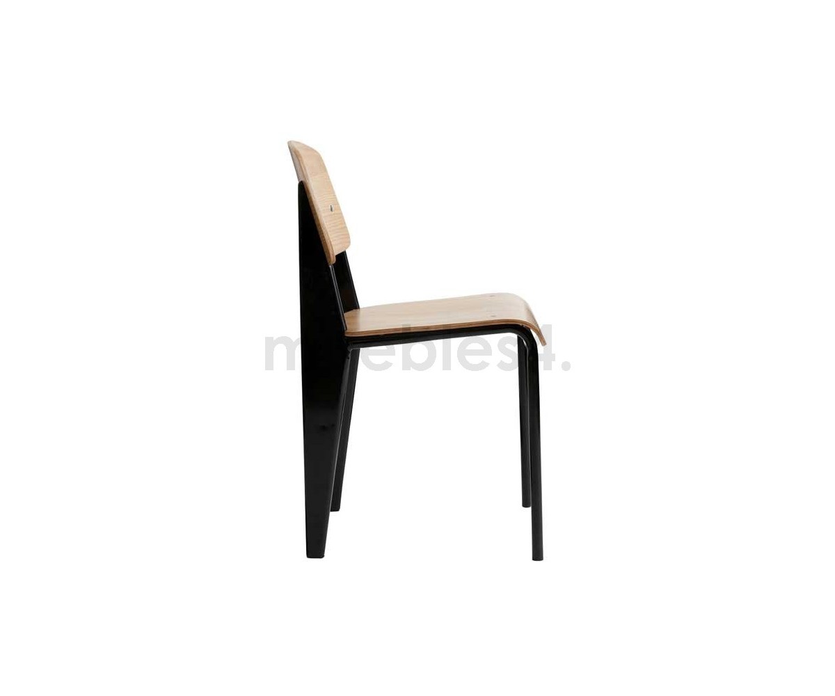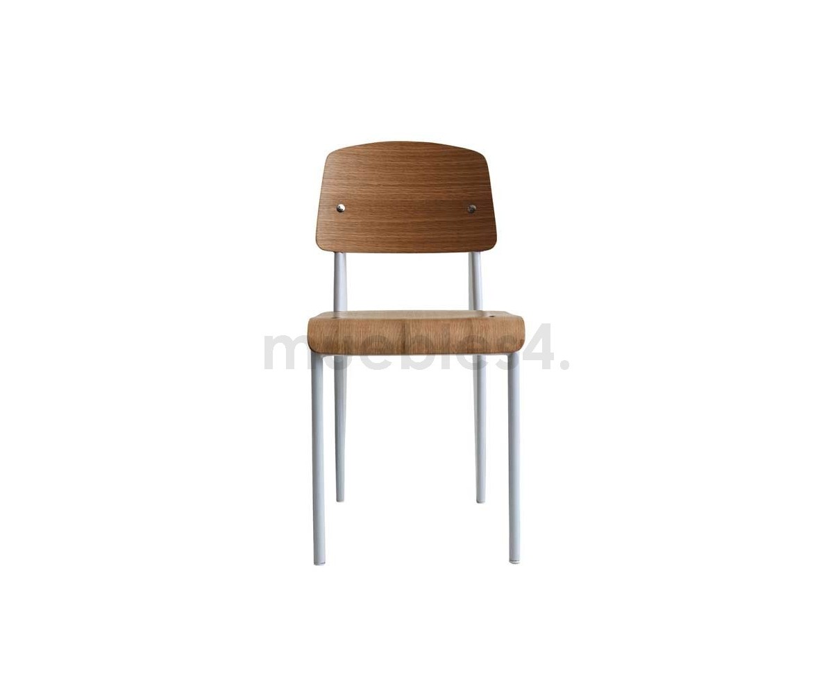 Silla, inspirada en un diseño de Jean Prouvé. La Standard Chair se ha convertido en uno de los clásicos más famosos del diseñador francés. La estructura metálica de esta icónica silla, está disponible en distintos colores. La silla esta pensada y fabricada para soportar mas carga en las patas traseras, donde debe sustentar el peso de la parte superior del cuerpo.