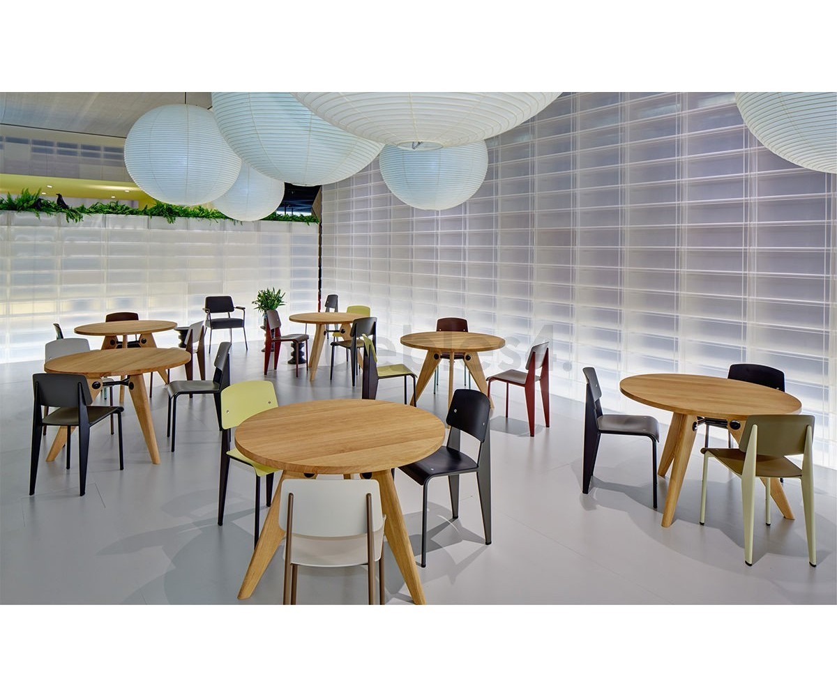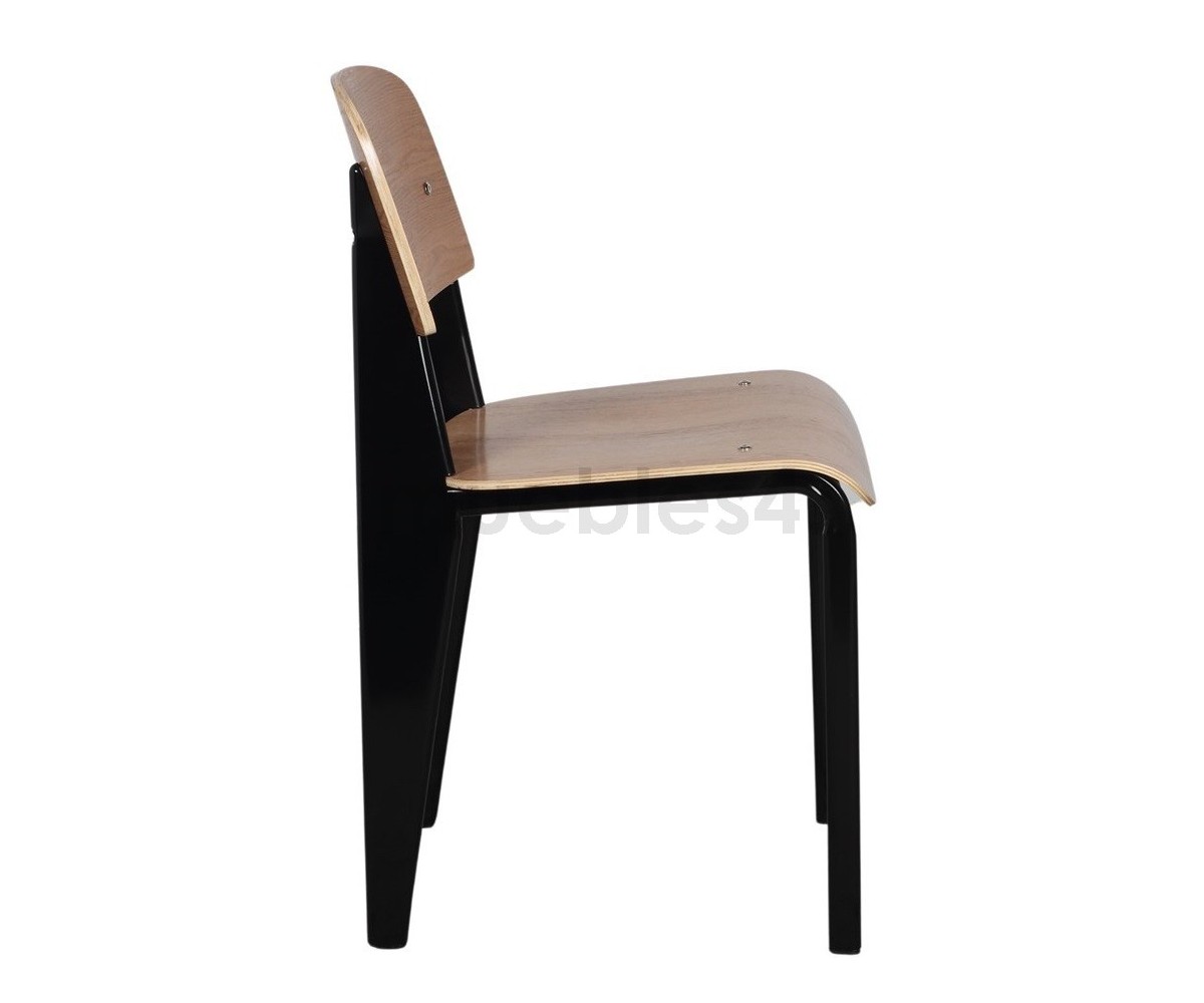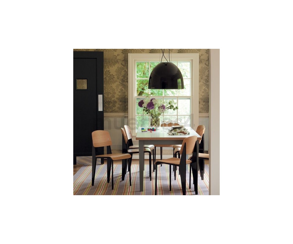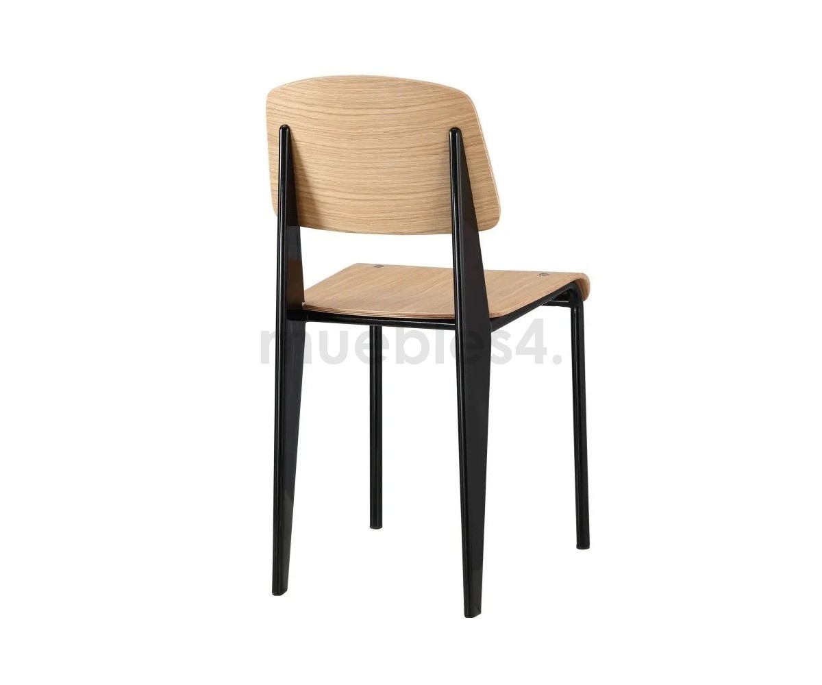 Silla, inspirada en un diseño de Jean Prouvé. La Standard Chair se ha convertido en uno de los clásicos más famosos del diseñador francés. La estructura metálica de esta icónica silla, está disponible en distintos colores. La silla esta pensada y fabricada para soportar mas carga en las patas traseras, donde debe sustentar el peso de la parte superior del cuerpo.