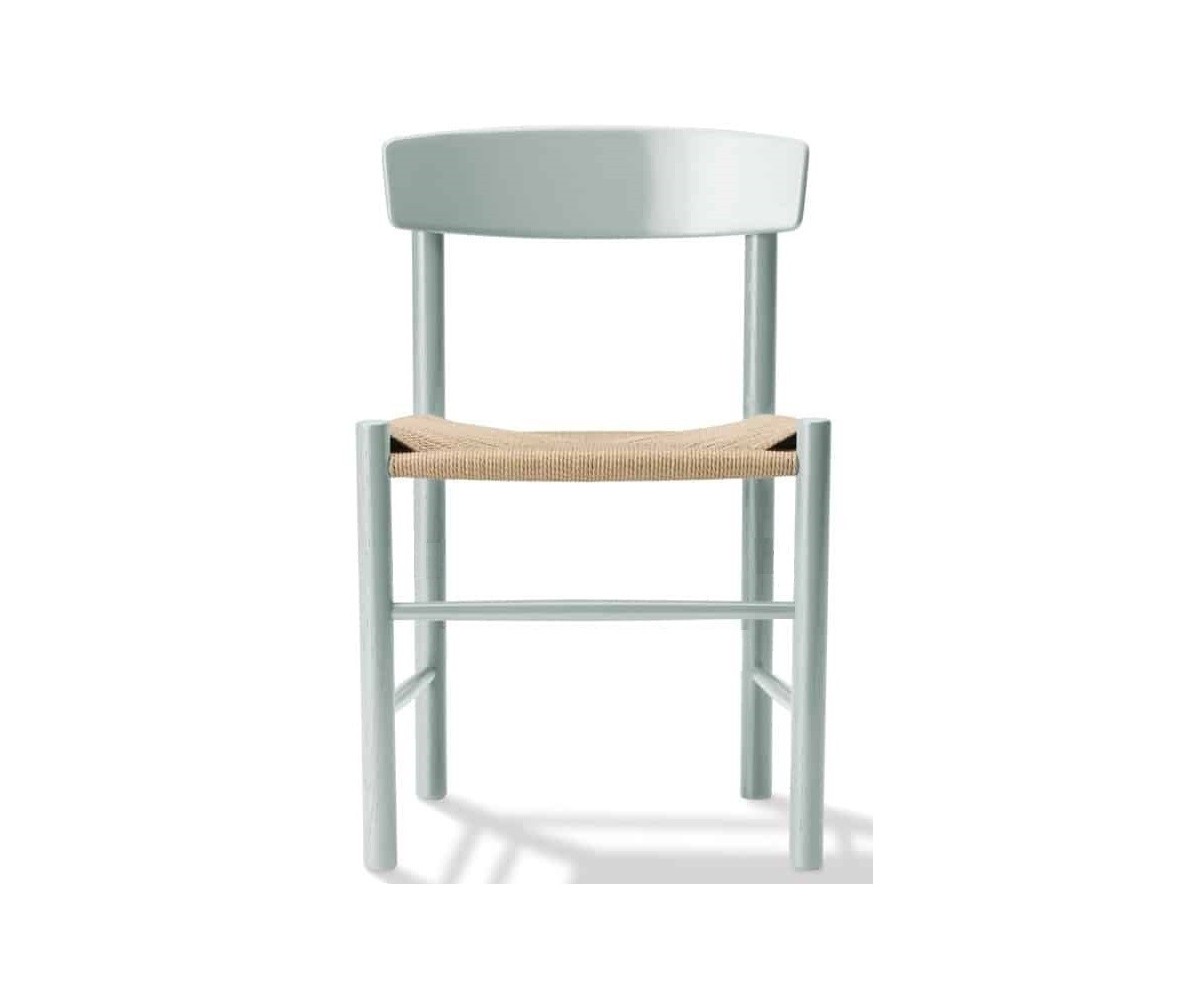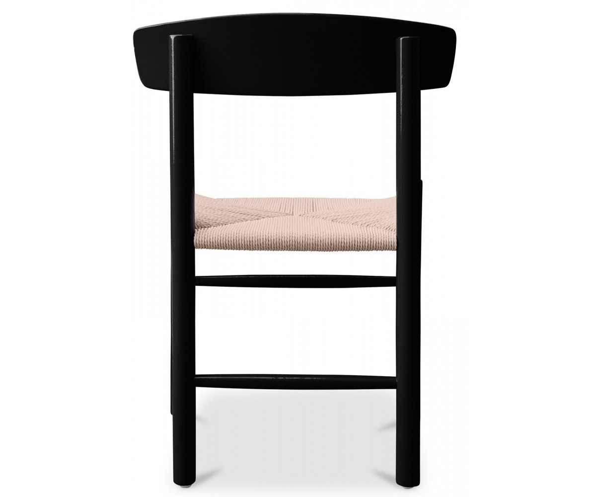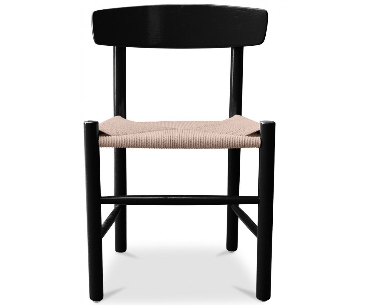 Silla inspirada en un diseño de Børge Mogensen. Estructura fabricada en madera de roble macizo, respaldo curvado, lacada en color negro o blanco. Asiento en cuerda de enea hecha a mano. Réplica exacta con materiales originales de máxima calidad.