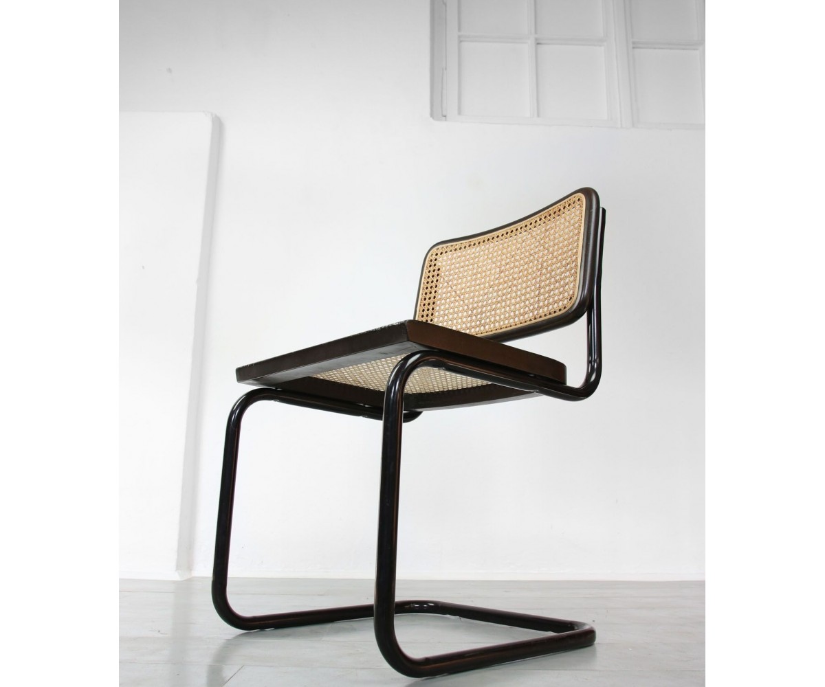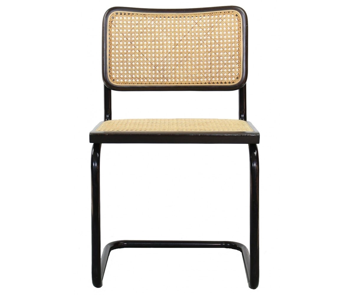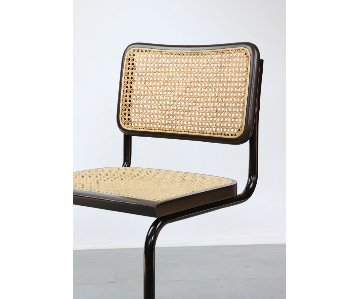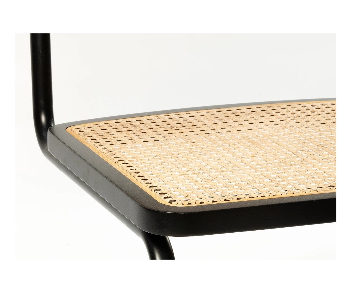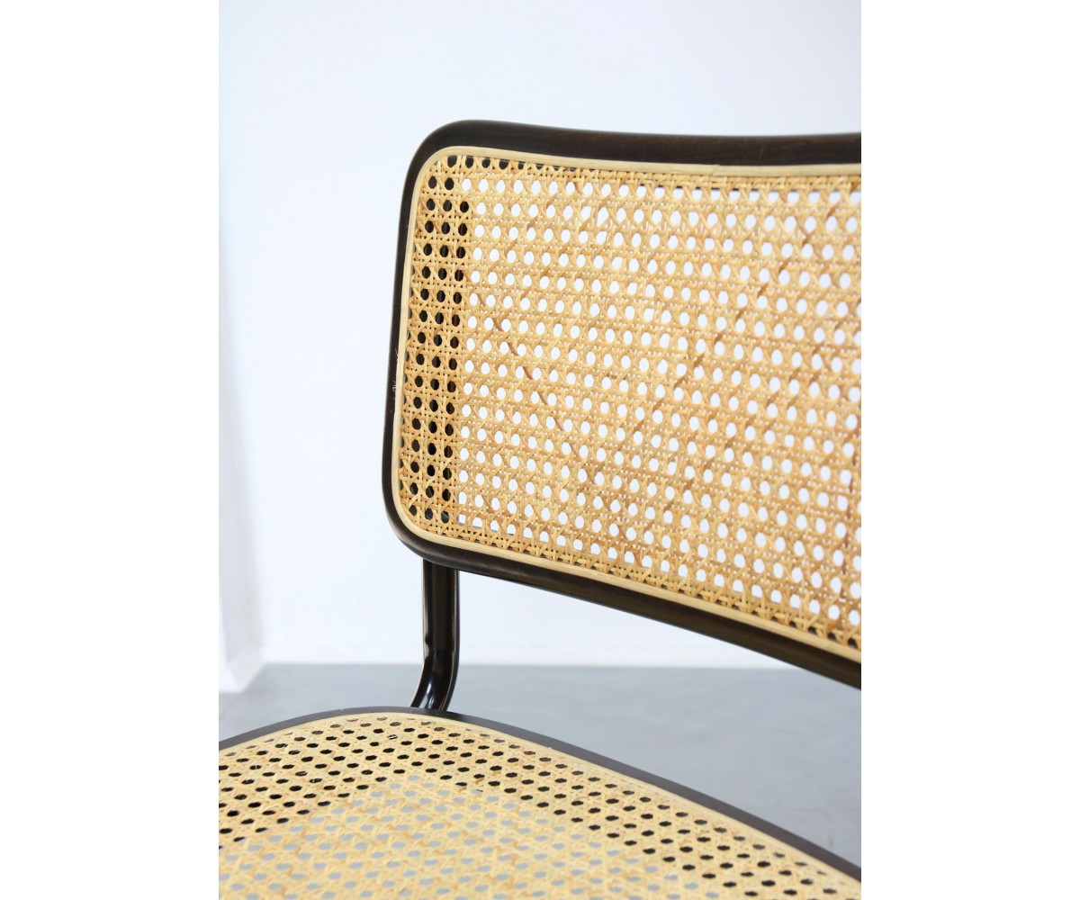Silla sin brazos inspirado en un diseño de Marcel Breuer. Estructura tubular en acero con triple lacado al horno, asiento y respaldo en madera con marco en roble terminación negro, caña natural elaborado a mano. Réplica exacta con materiales originales de máxima calidad.
