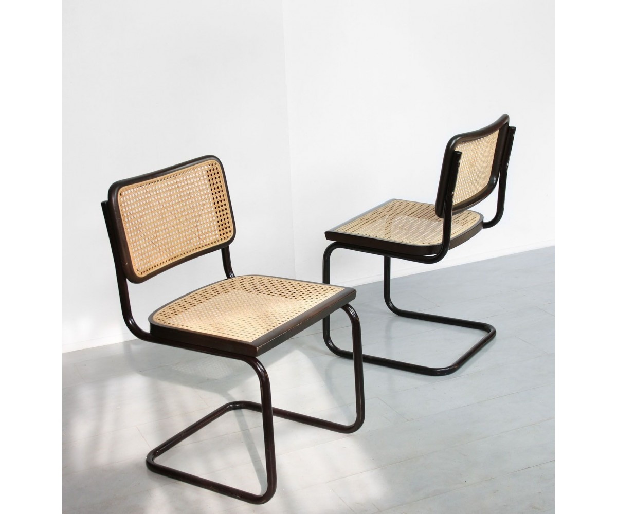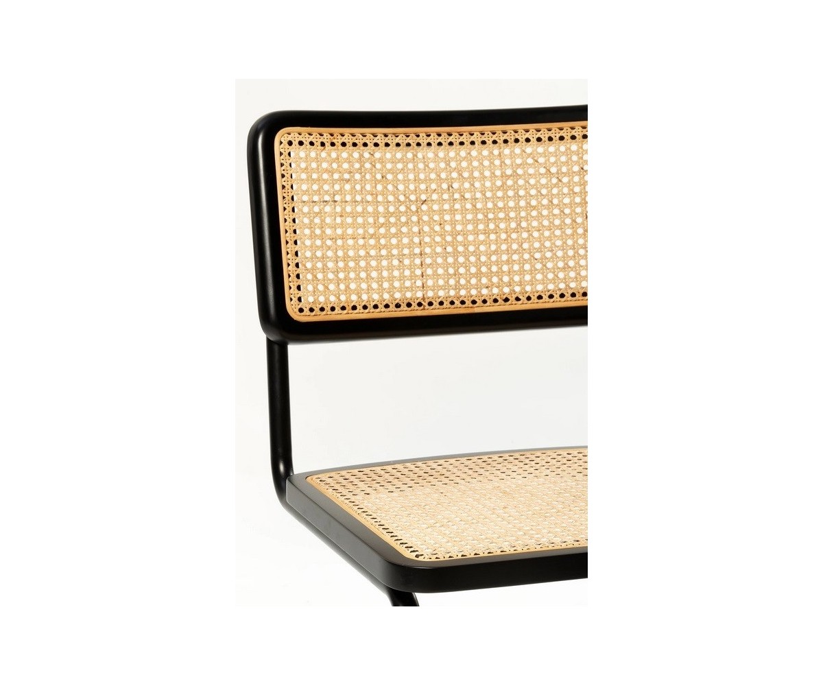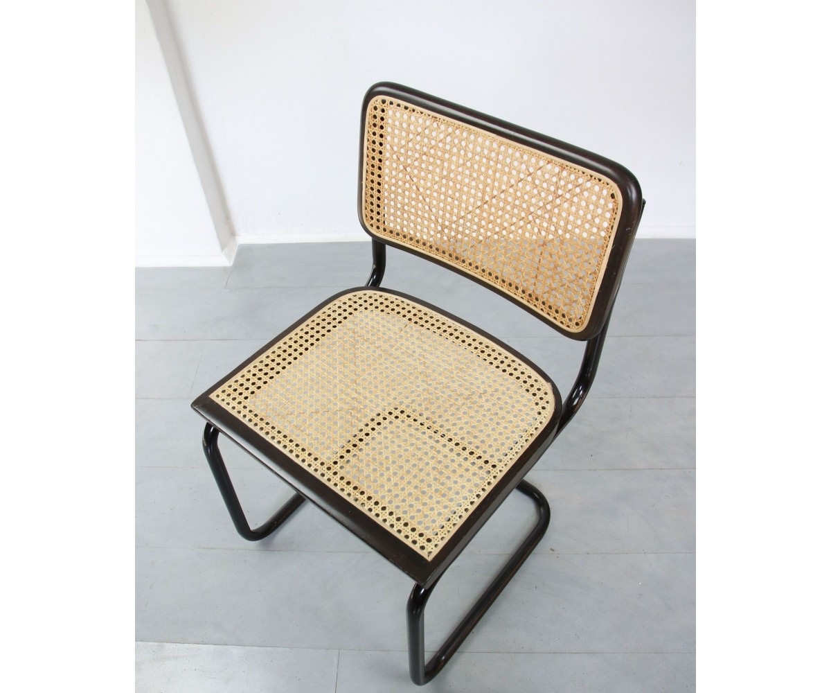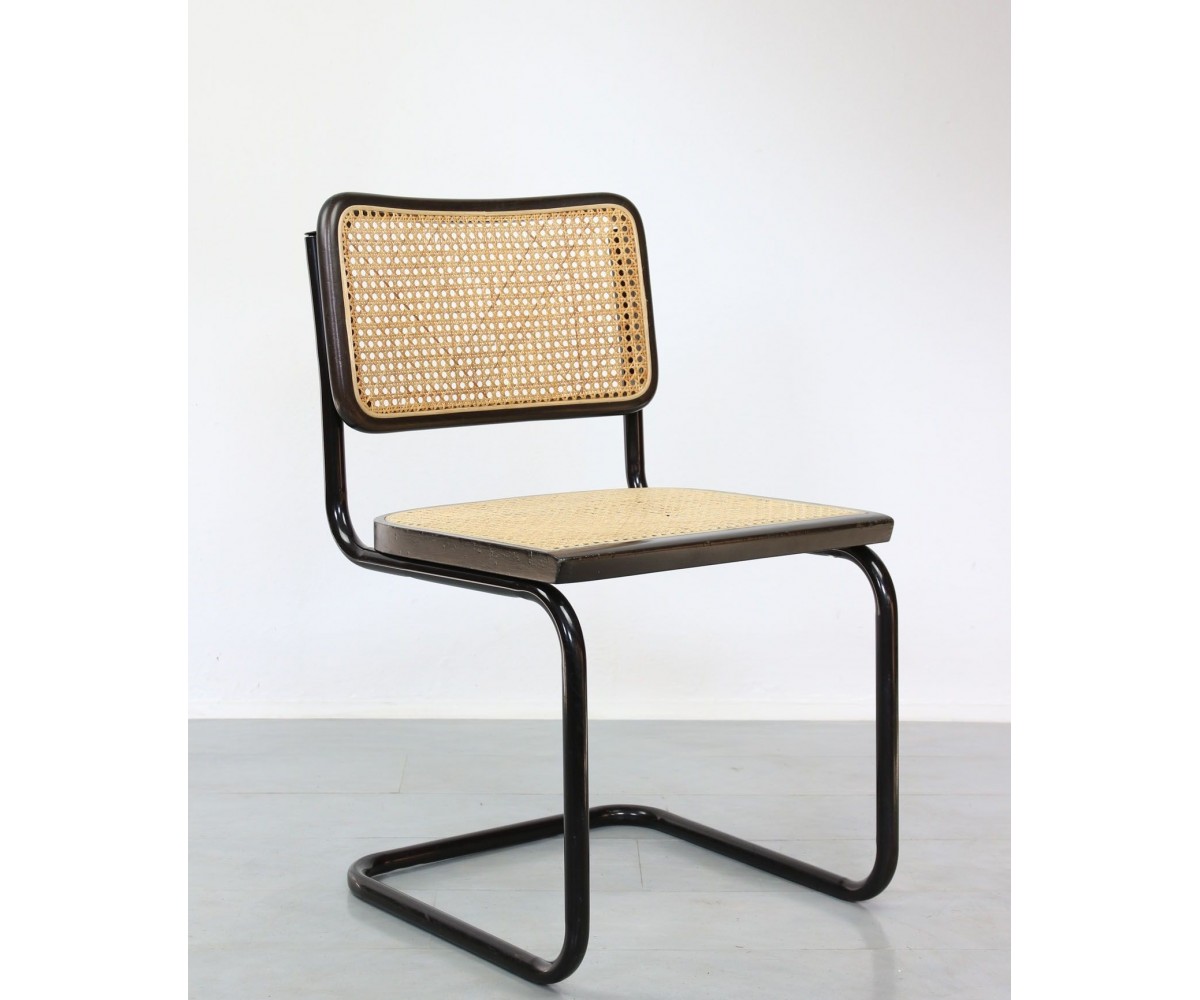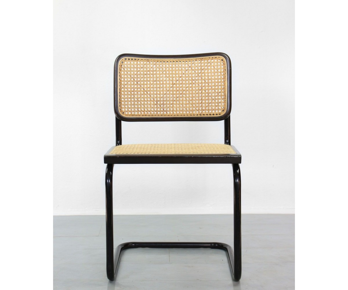 Silla sin brazos inspirado en un diseño de Marcel Breuer. Estructura tubular en acero con triple lacado al horno, asiento y respaldo en madera con marco en roble terminación negro, caña natural elaborado a mano. Réplica exacta con materiales originales de máxima calidad.