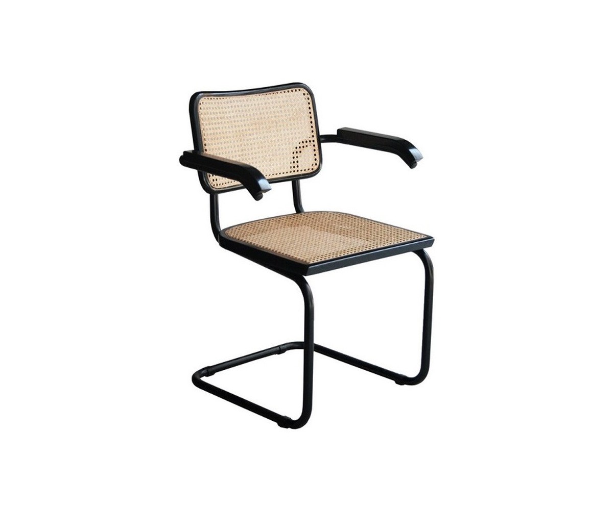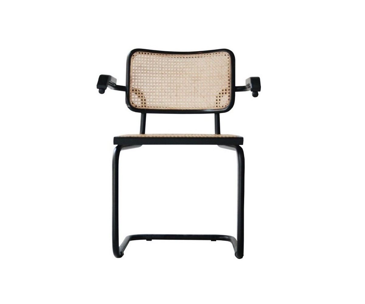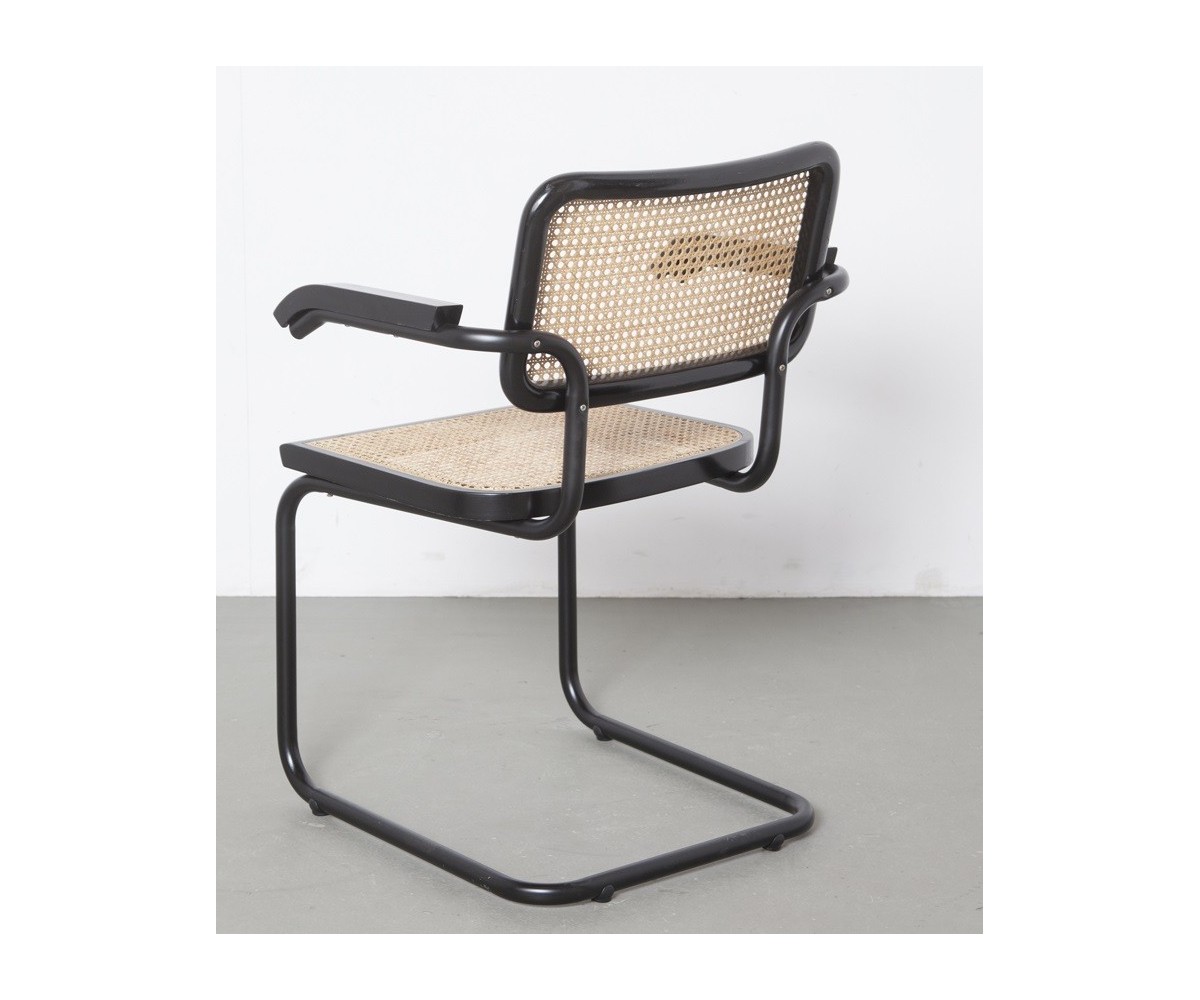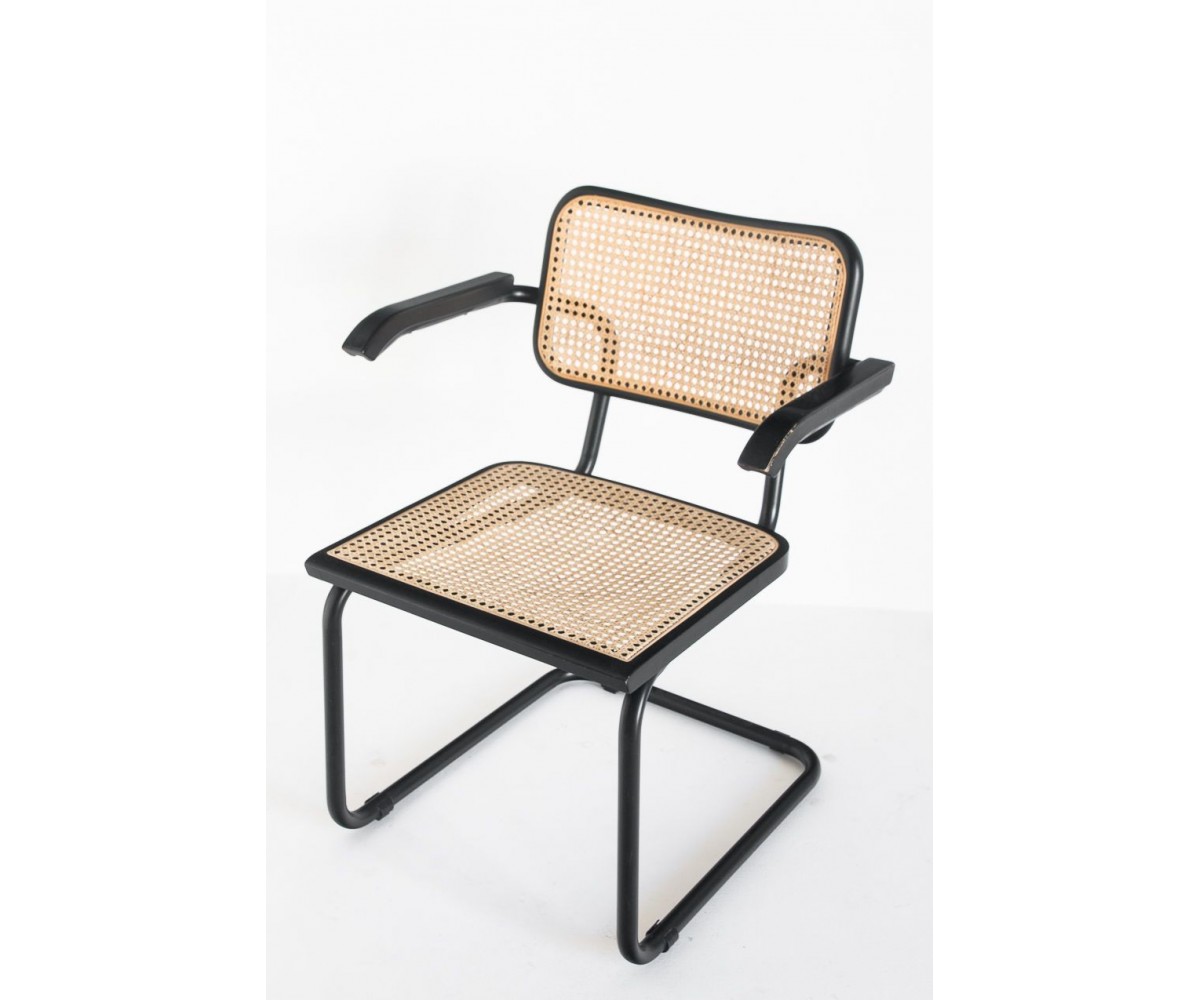 Silla con brazos inspirado en un diseño de Marcel Breuer. Estructura tubular en acero triple lacado negro mate, asiento y respaldo en madera con marco en roble terminación negro, caña natural elaborada a mano. Réplica exacta con materiales originales de máxima calidad.