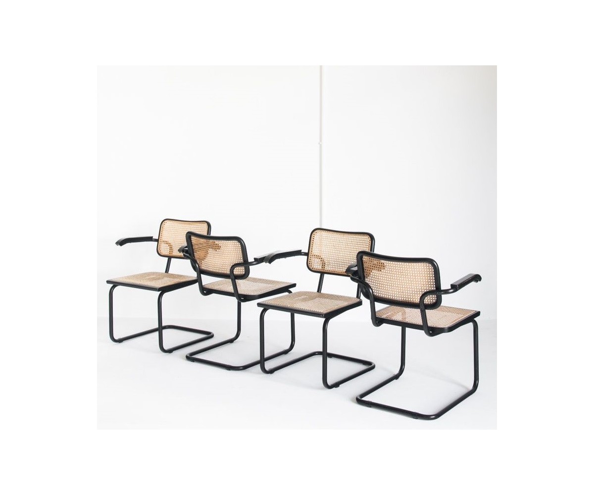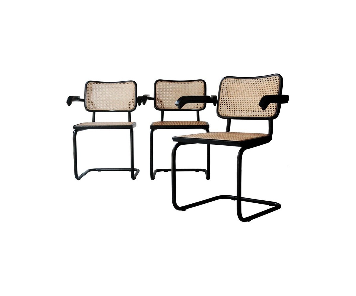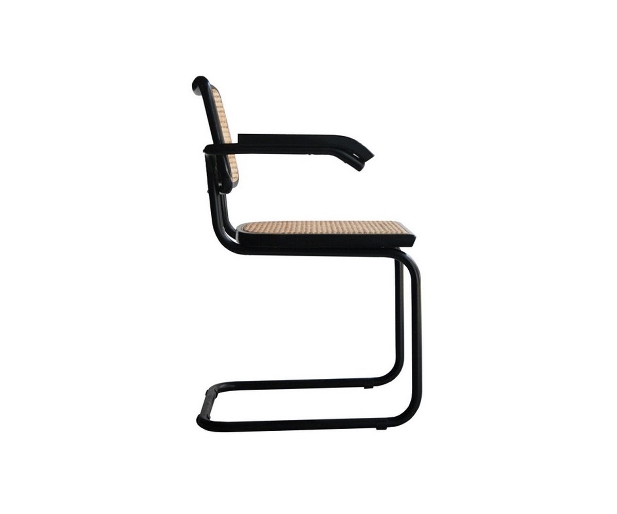 Silla con brazos inspirado en un diseño de Marcel Breuer. Estructura tubular en acero triple lacado negro mate, asiento y respaldo en madera con marco en roble terminación negro, caña natural elaborada a mano. Réplica exacta con materiales originales de máxima calidad.