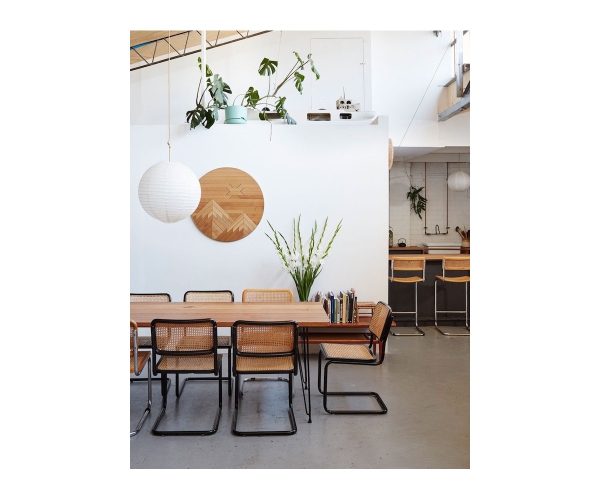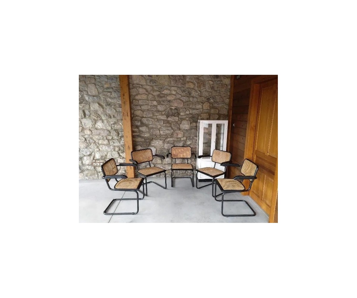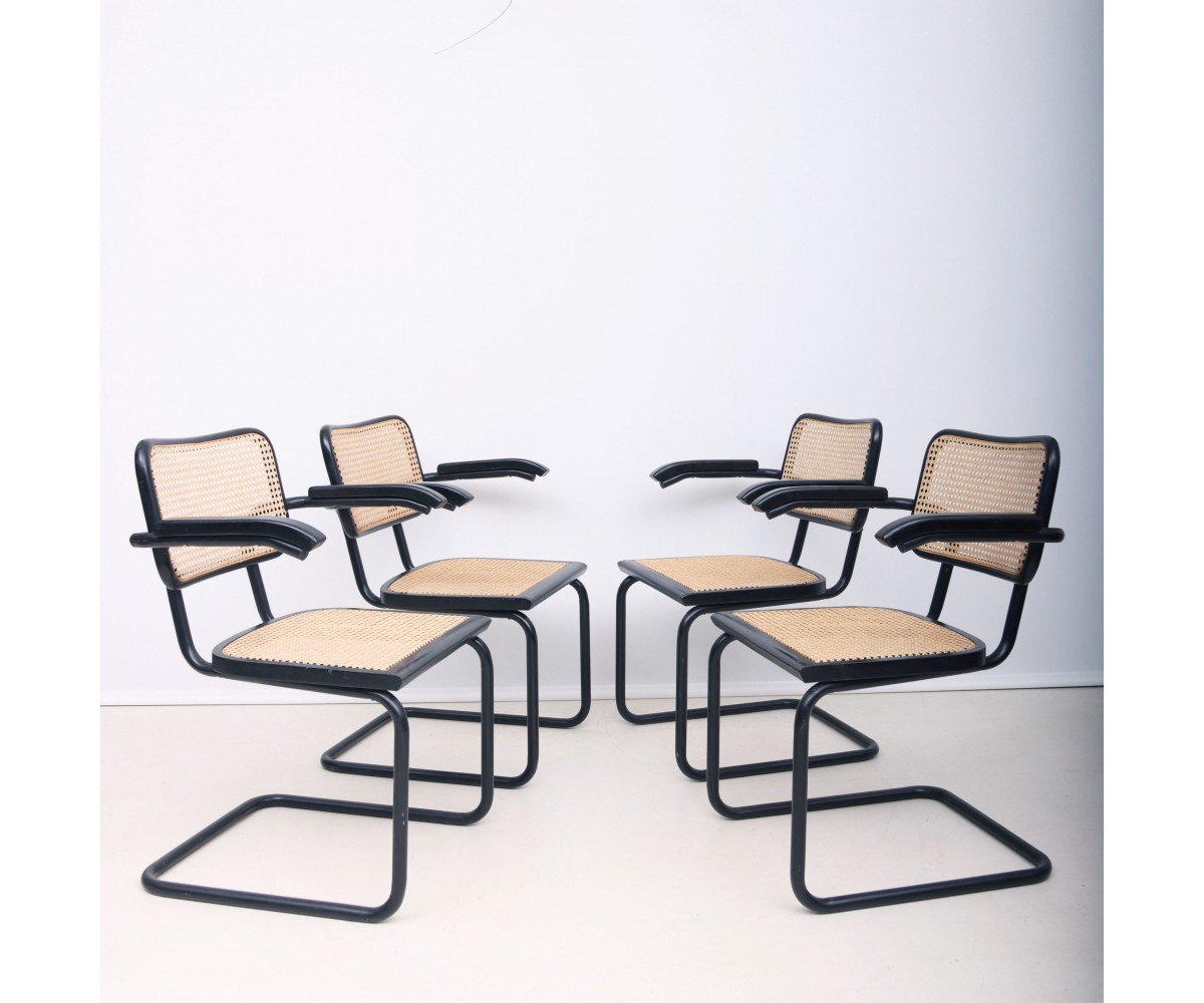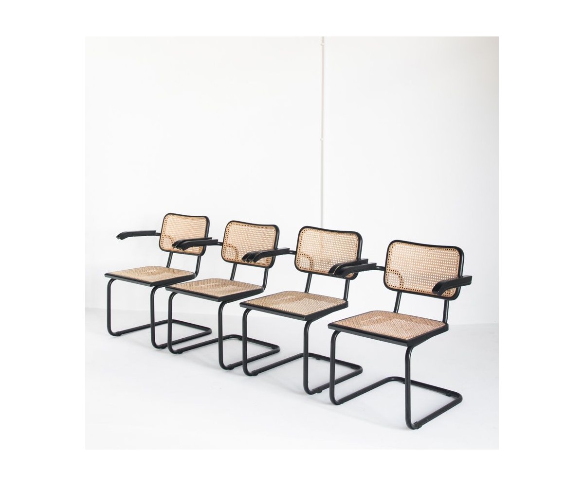 Silla con brazos inspirado en un diseño de Marcel Breuer. Estructura tubular en acero triple lacado negro mate, asiento y respaldo en madera con marco en roble terminación negro, caña natural elaborada a mano. Réplica exacta con materiales originales de máxima calidad.