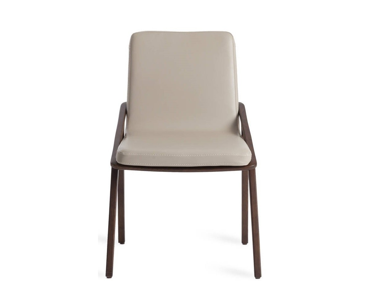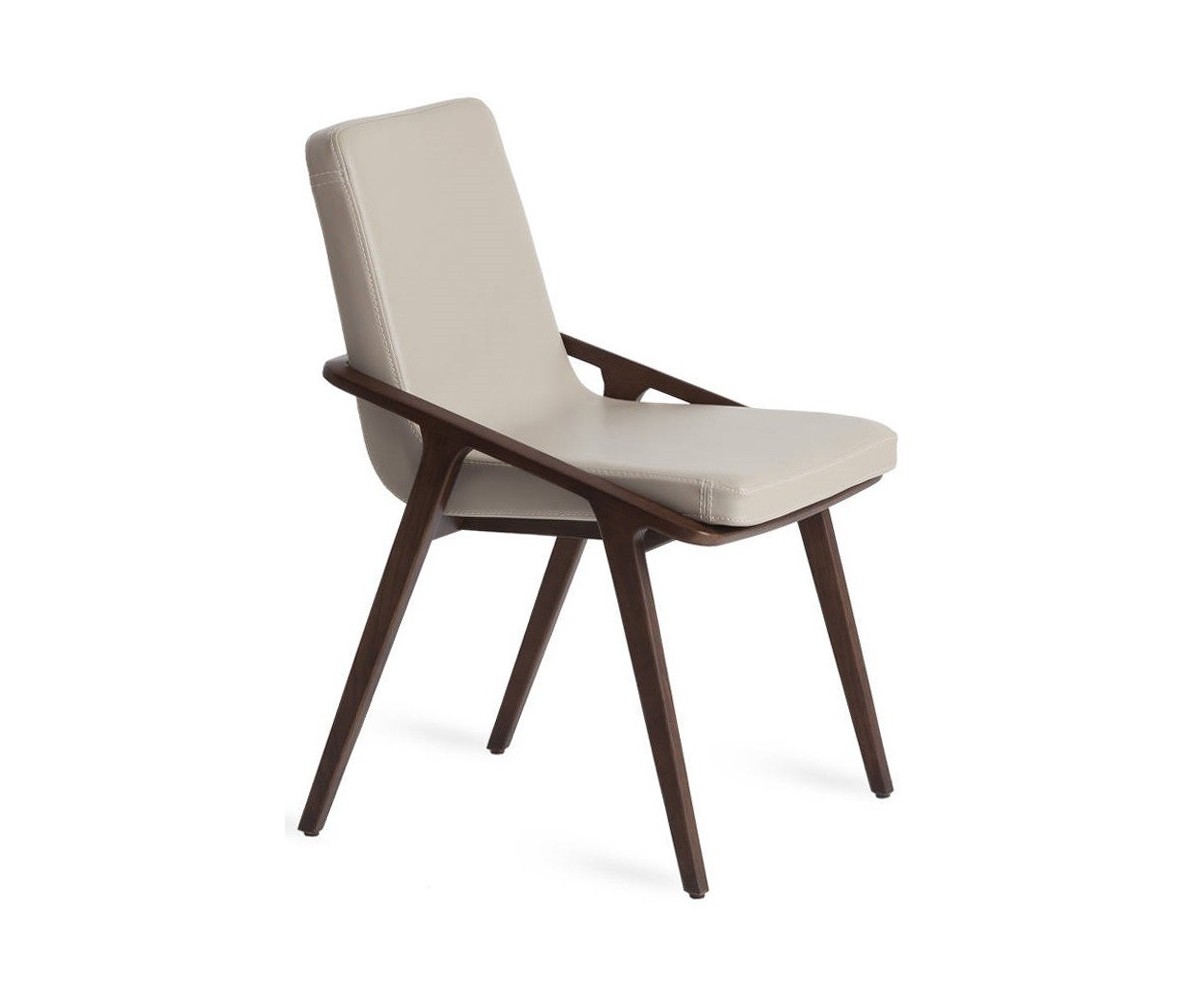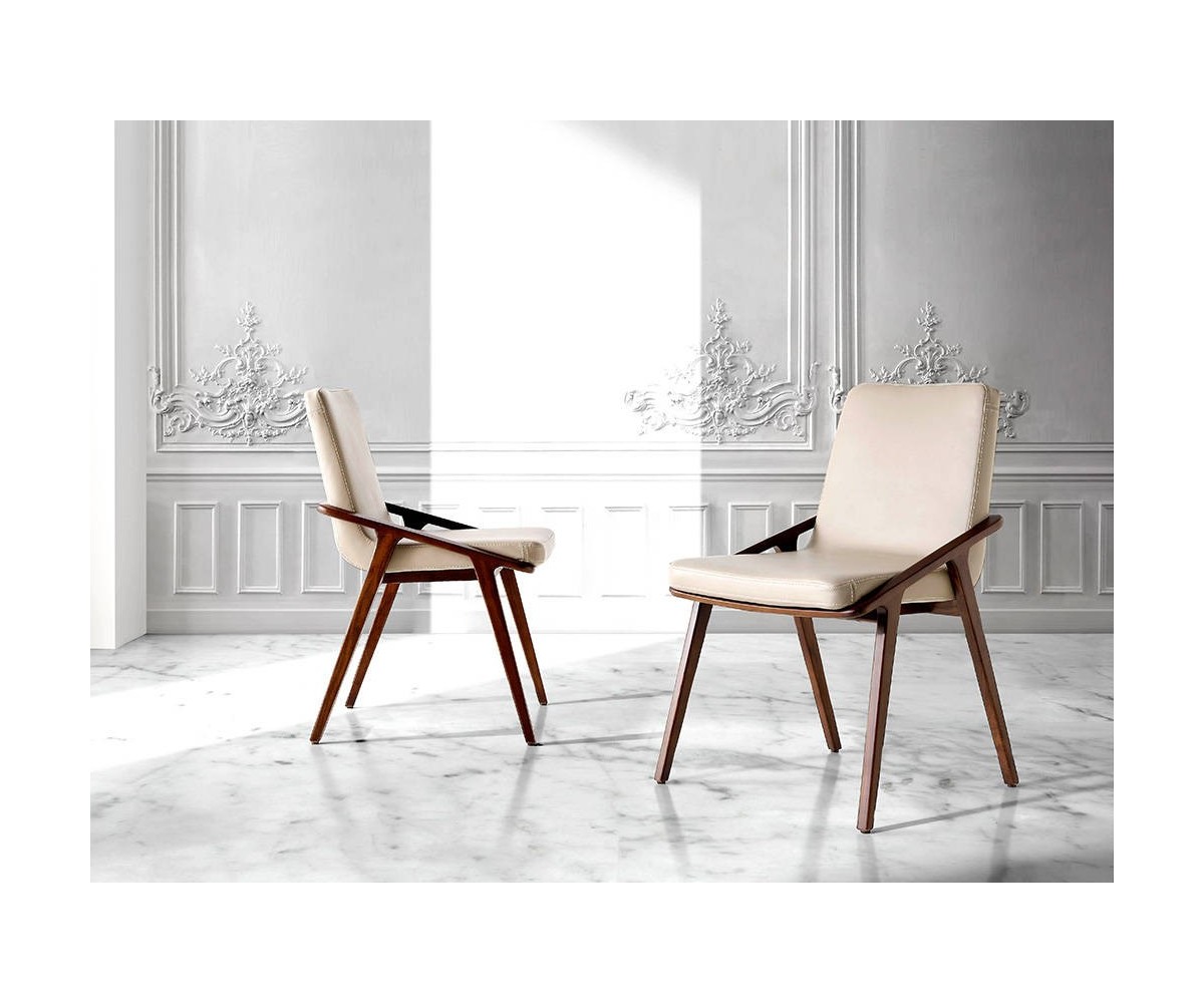 Silla contemporanea inspirada en un diseño de Emmanuel Gallina para Porada. Estructura fabricada en madera de nogal macizo, asiento en piel color visón. Tiene la opción de elegir el asiento en tejido o otro color de piel, dispone de 80 acabados, y la estructura de madera en otro color, dispones de 56 acabados distintos, estos cambios bajo pedido. Réplica exacta con materiales originales de máxima calidad.