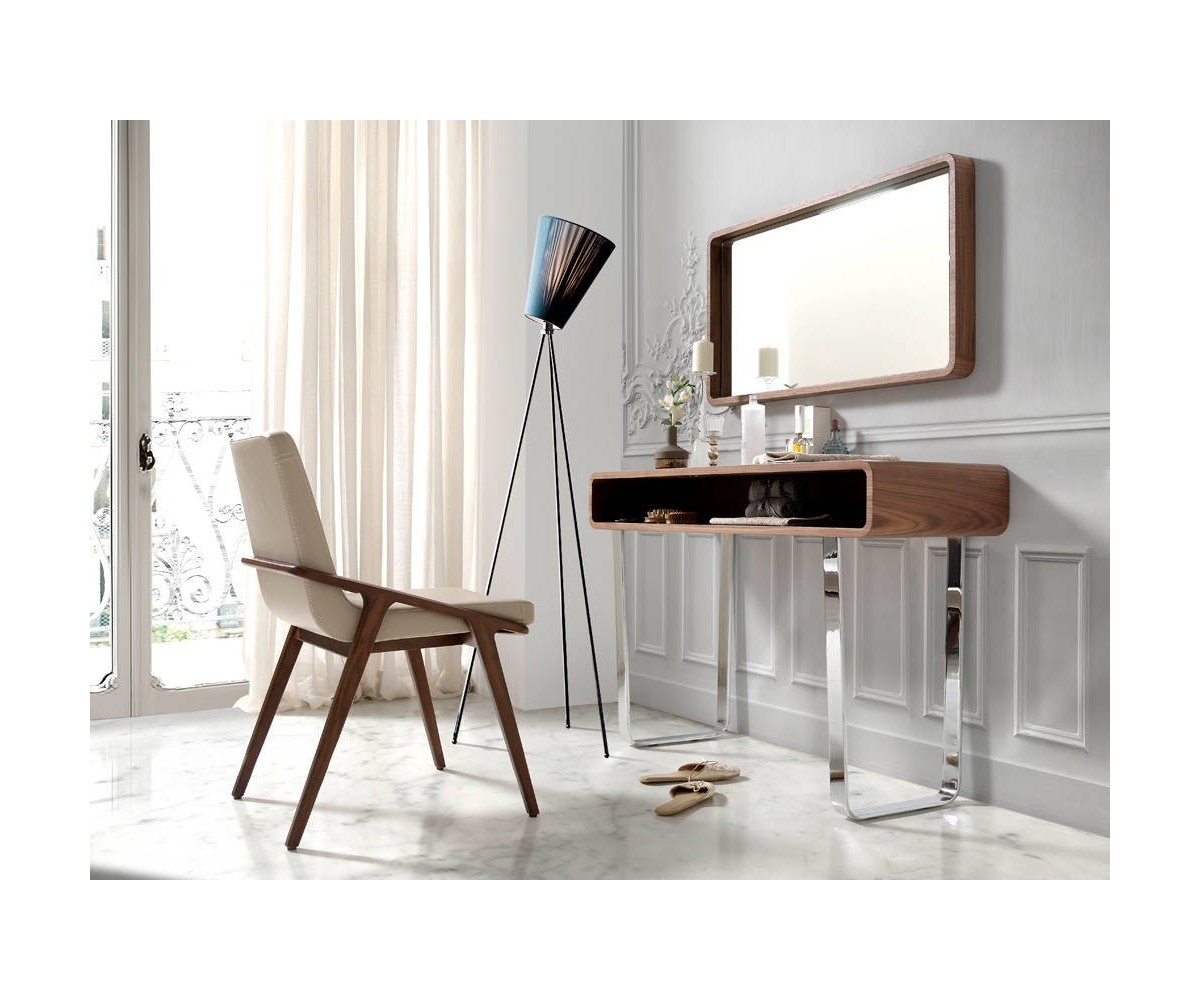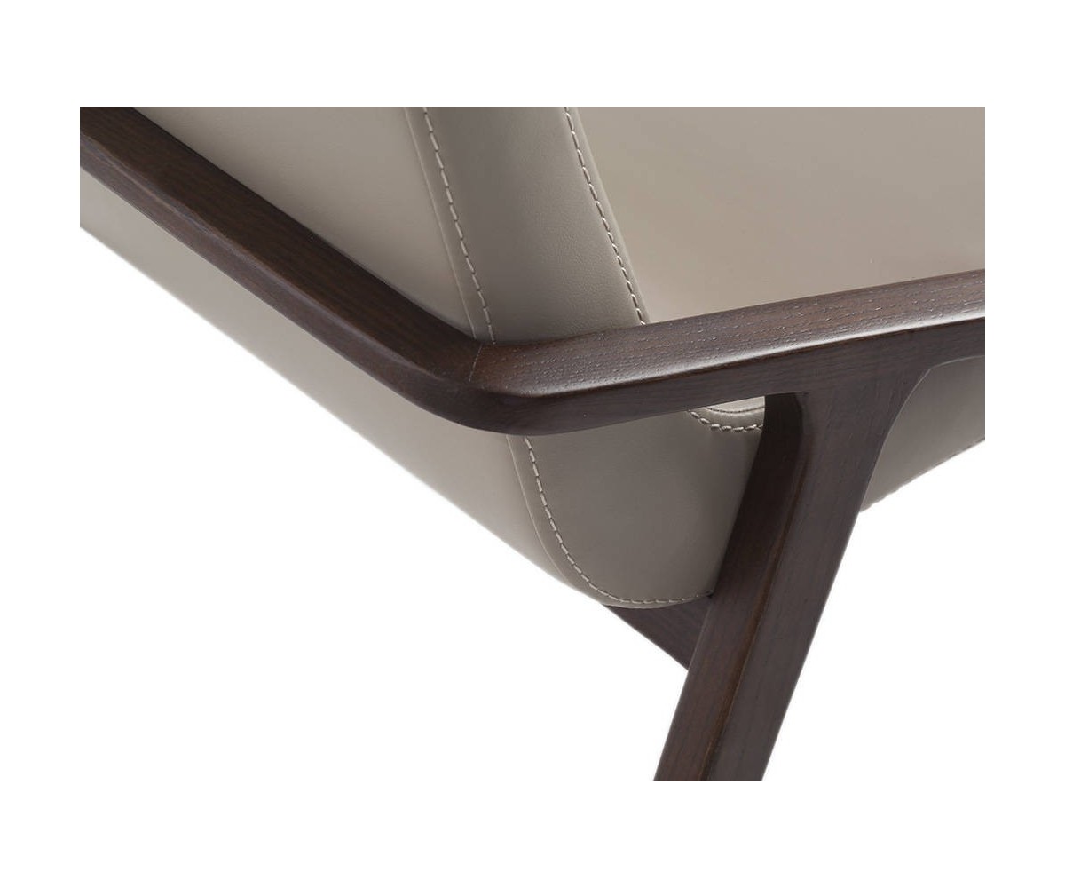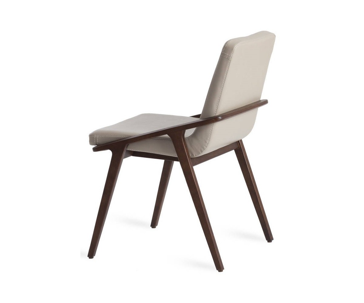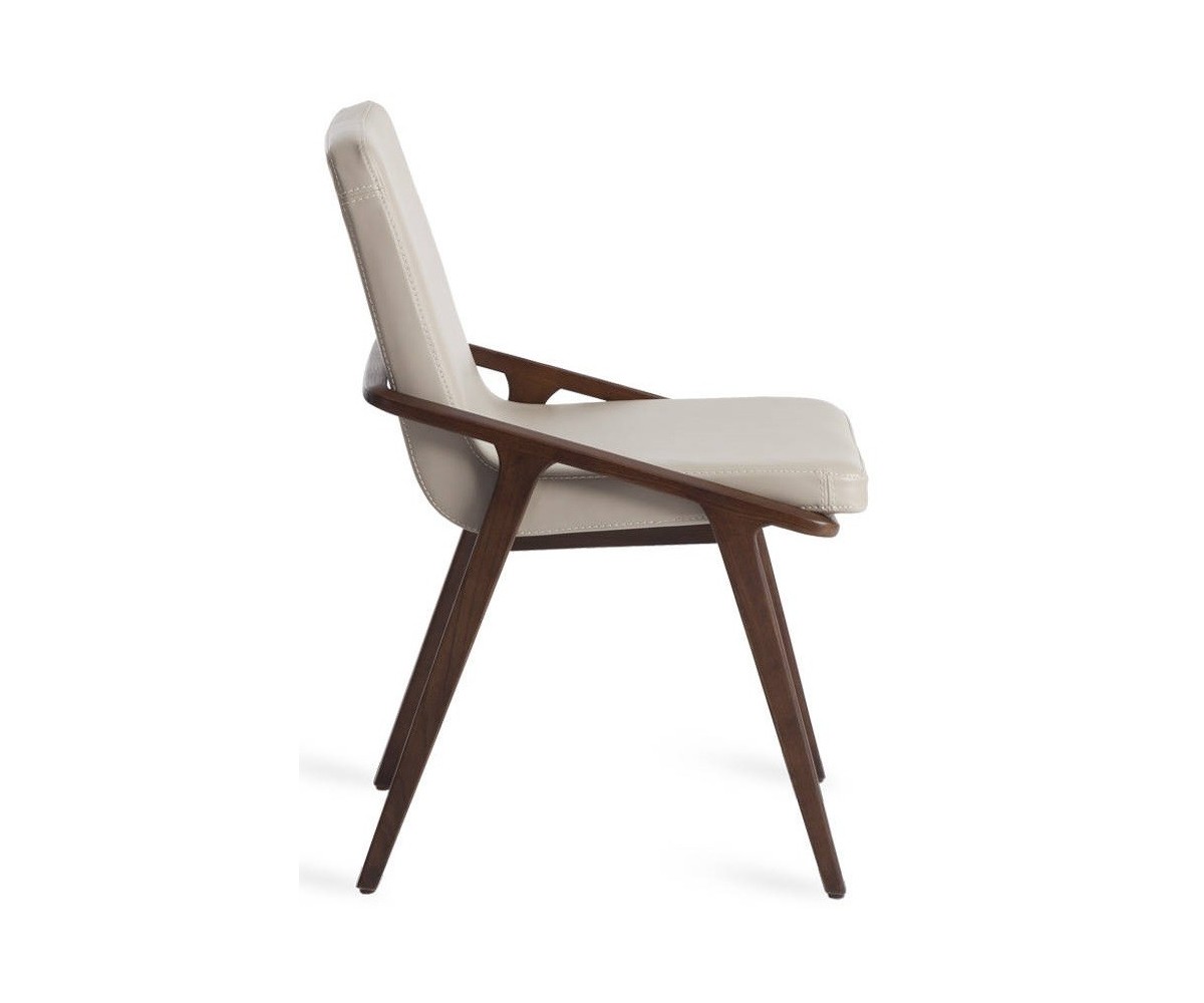Silla contemporanea inspirada en un diseño de Emmanuel Gallina para Porada. Estructura fabricada en madera de nogal macizo, asiento en piel color visón. Tiene la opción de elegir el asiento en tejido o otro color de piel, dispone de 80 acabados, y la estructura de madera en otro color, dispones de 56 acabados distintos, estos cambios bajo pedido. Réplica exacta con materiales originales de máxima calidad.