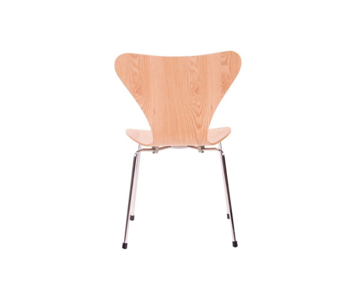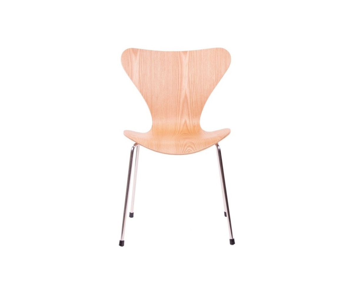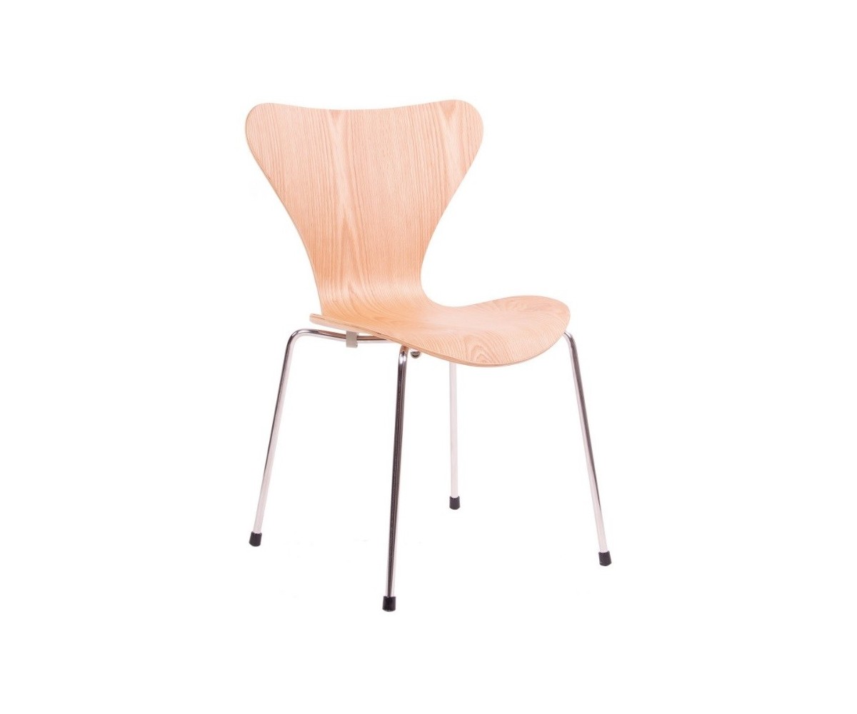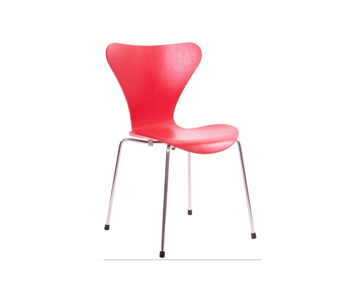 Silla inspirada en un diseño de Arne Jacobsen para FRITZ HANSEN. Estructura tubular en acero inox, terminación brillo antióxido, con taco en las patas antideslizante. Carcasa curvada monoblock de madera maciza de roble. Terminación haya, nogal, negro, azul, verde, rosa, rojo, blanco y amarillo. Réplica exacta con materiales originales de máxima calidad.