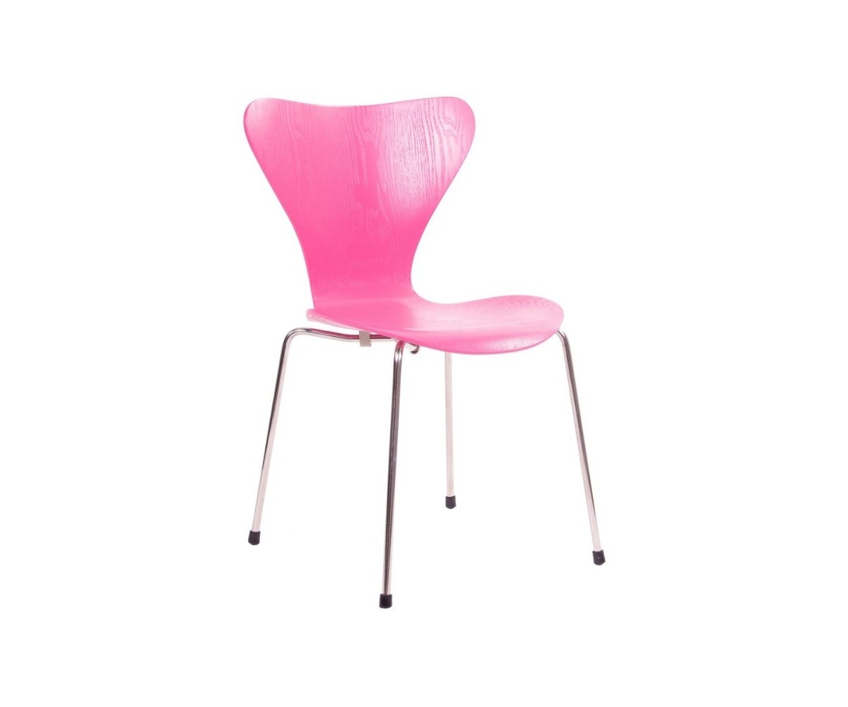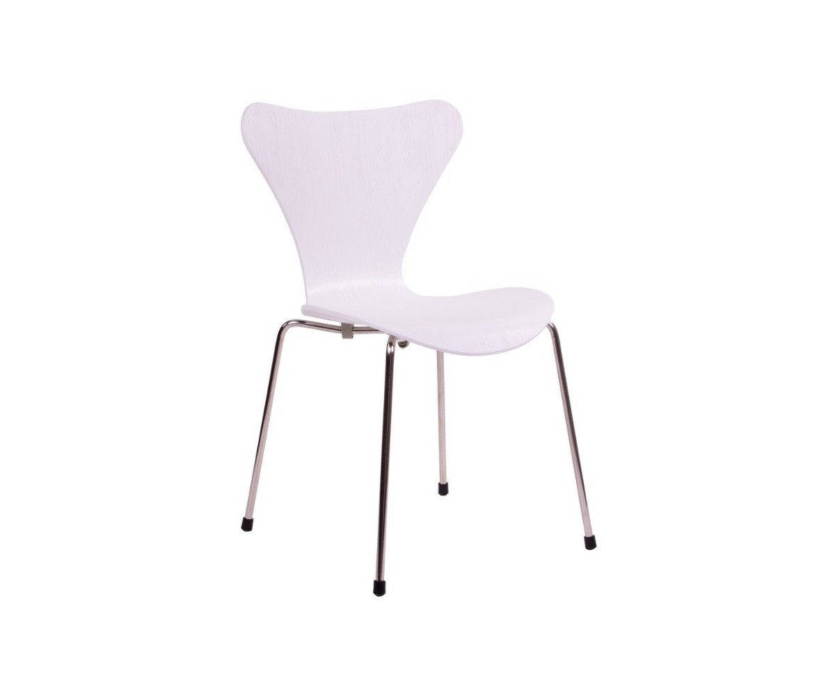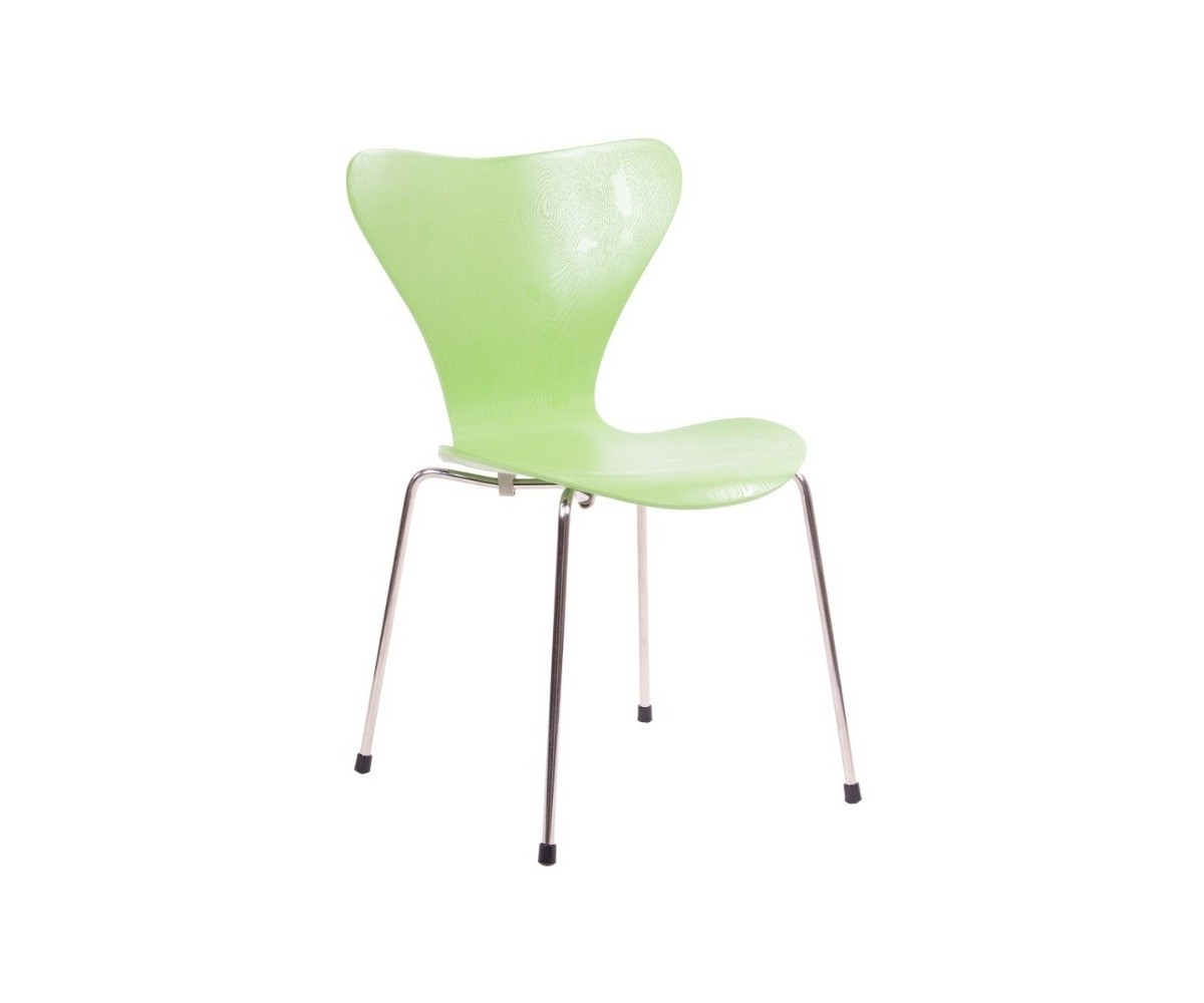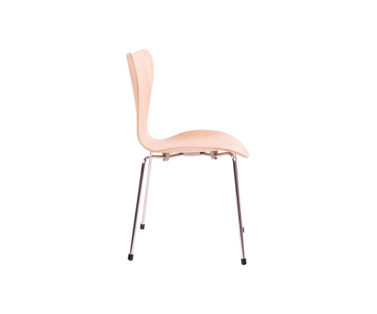 Silla inspirada en un diseño de Arne Jacobsen para FRITZ HANSEN. Estructura tubular en acero inox, terminación brillo antióxido, con taco en las patas antideslizante. Carcasa curvada monoblock de madera maciza de roble. Terminación haya, nogal, negro, azul, verde, rosa, rojo, blanco y amarillo. Réplica exacta con materiales originales de máxima calidad.