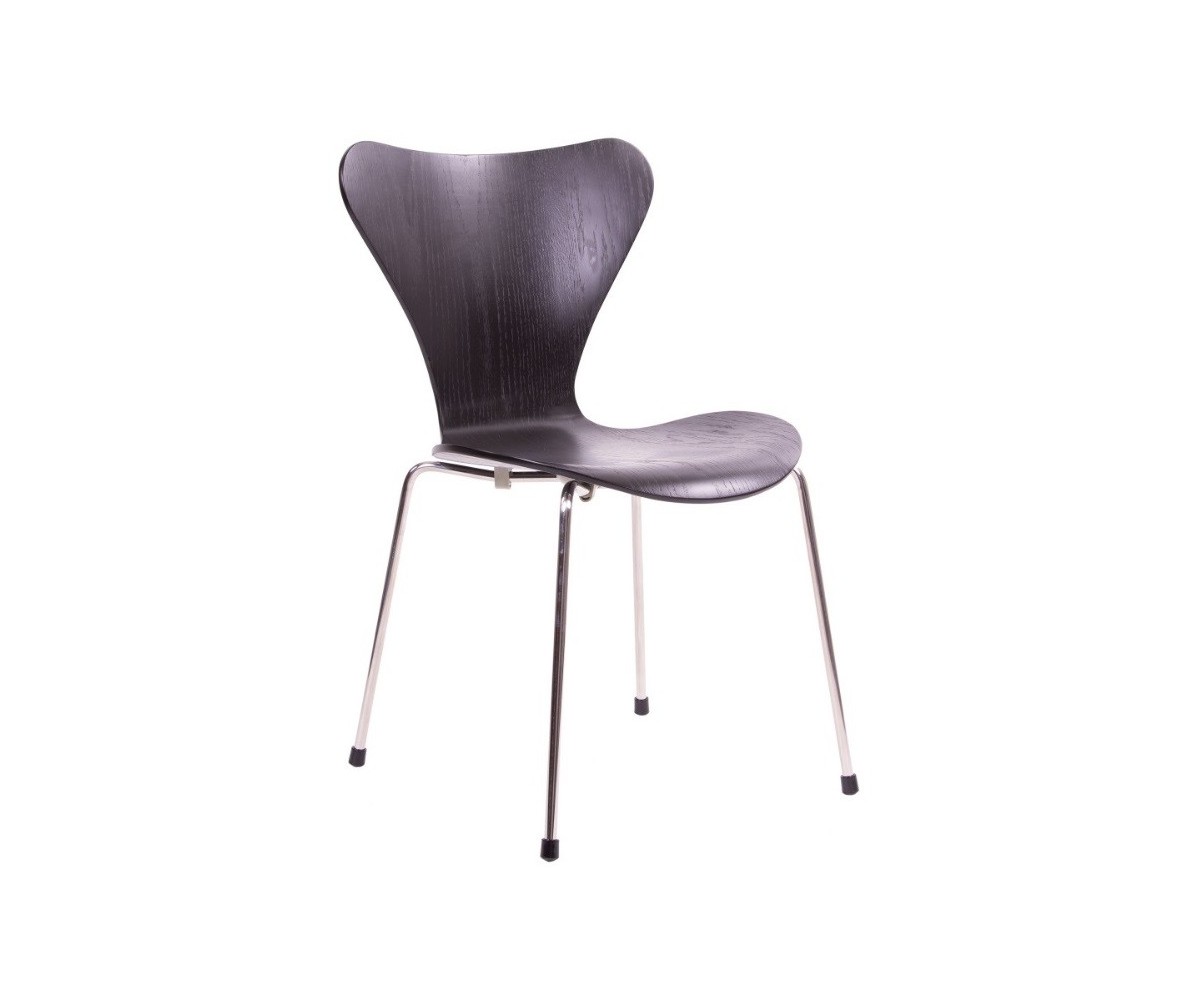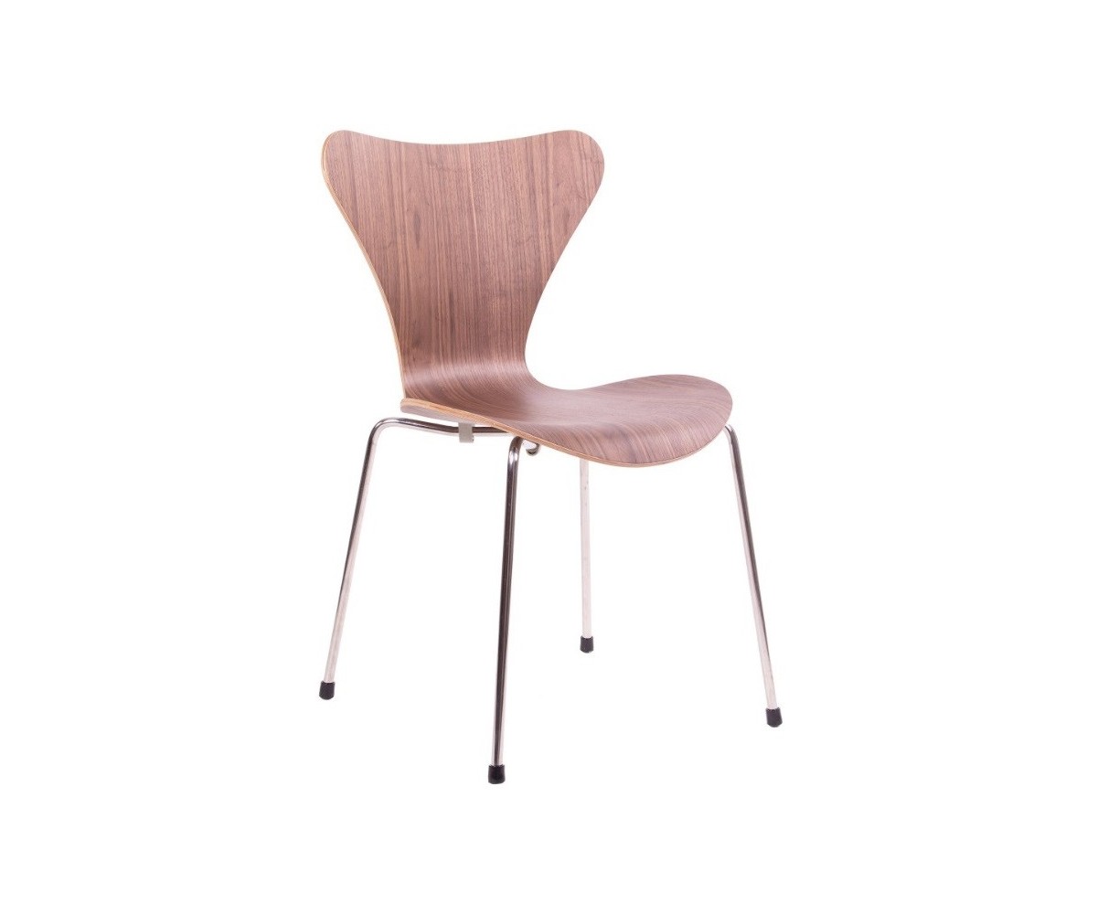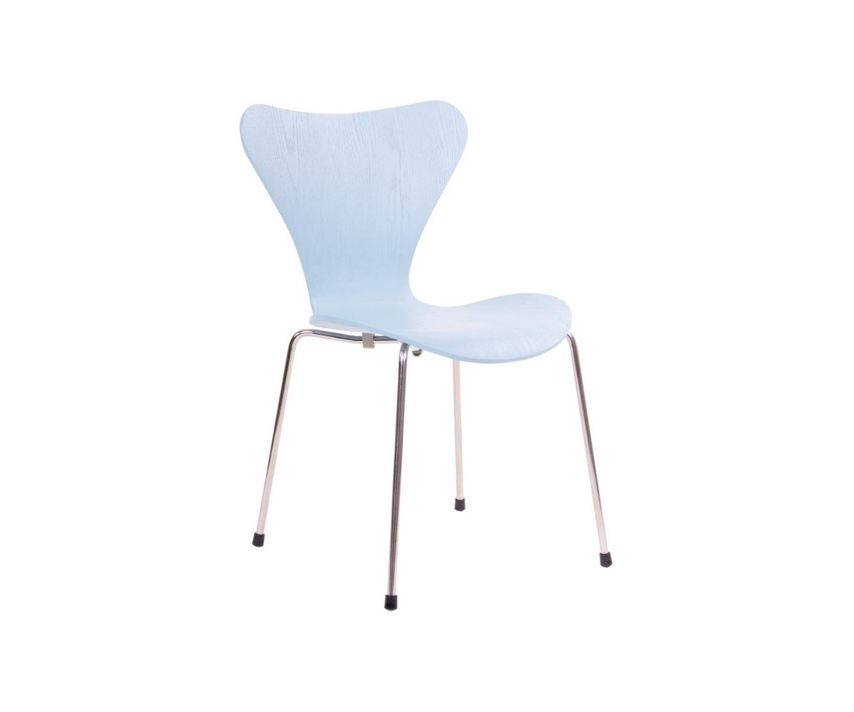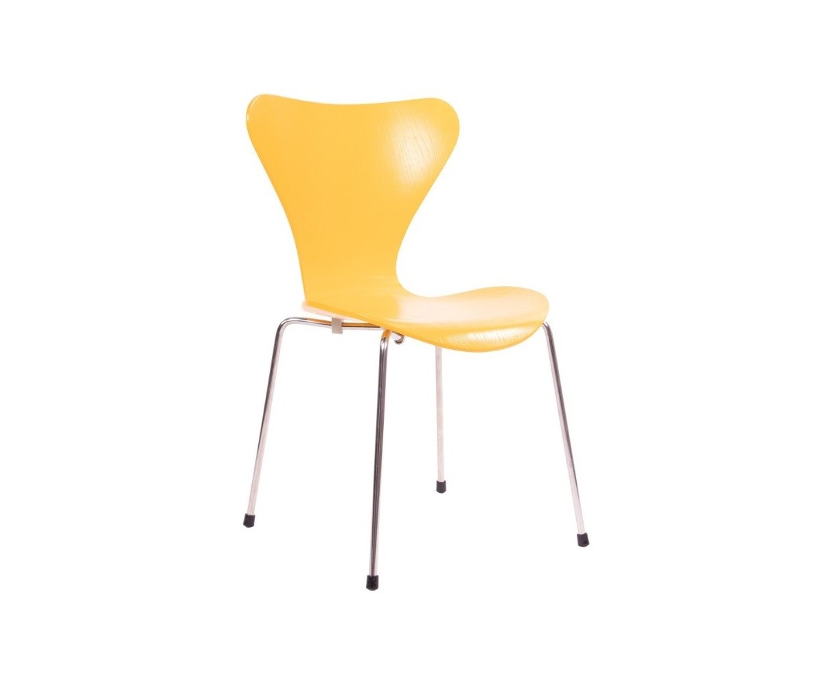 Silla inspirada en un diseño de Arne Jacobsen para FRITZ HANSEN. Estructura tubular en acero inox, terminación brillo antióxido, con taco en las patas antideslizante. Carcasa curvada monoblock de madera maciza de roble. Terminación haya, nogal, negro, azul, verde, rosa, rojo, blanco y amarillo. Réplica exacta con materiales originales de máxima calidad.