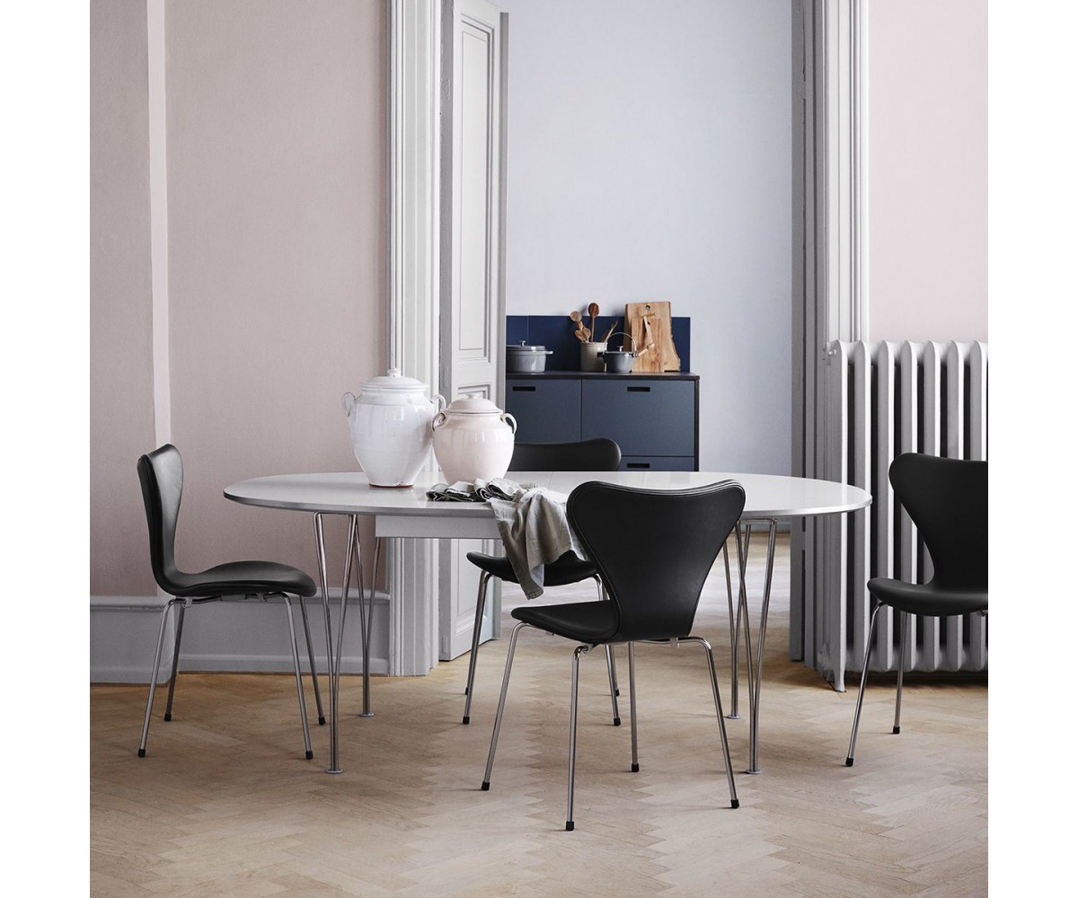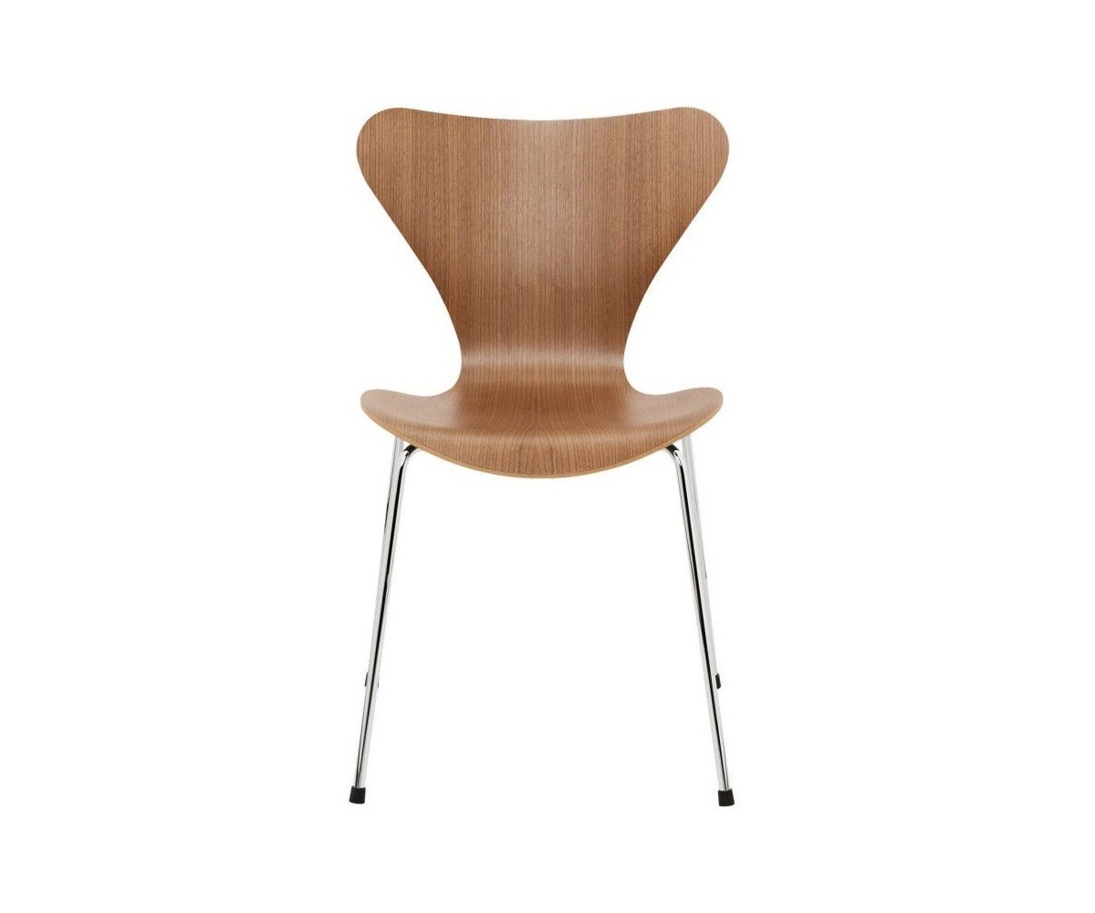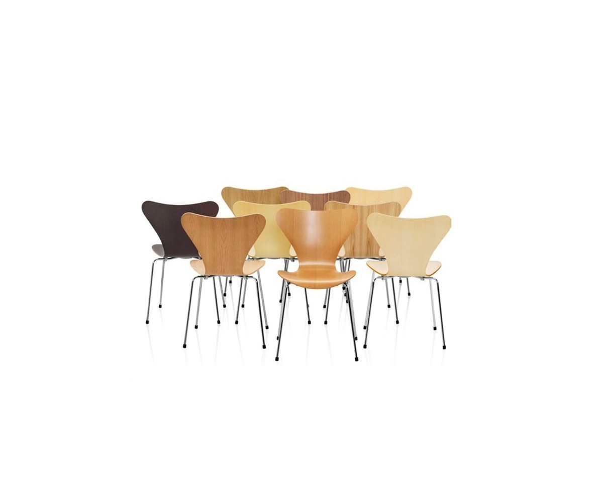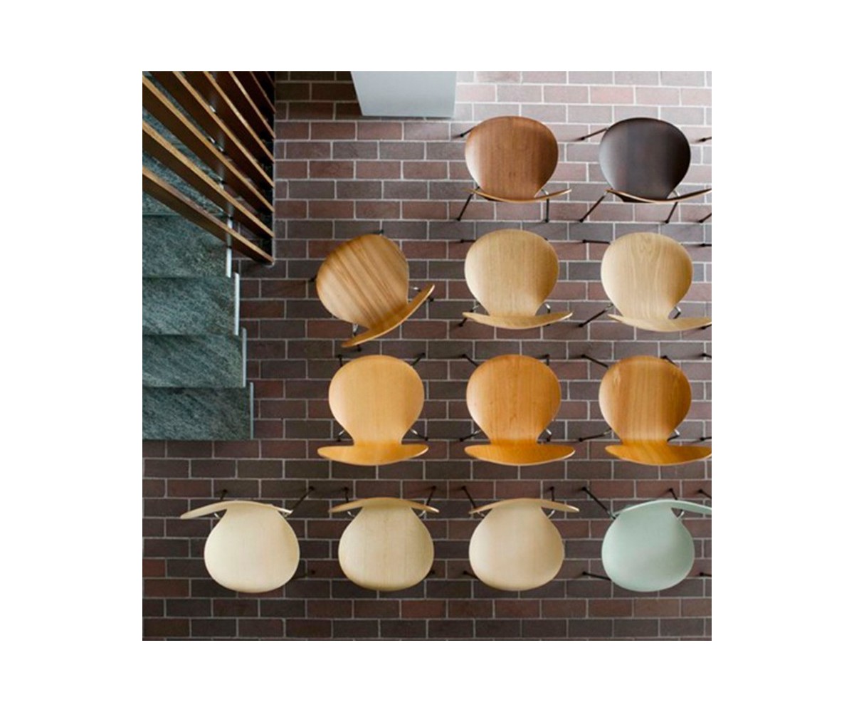 Silla inspirada en un diseño de Arne Jacobsen para FRITZ HANSEN. Estructura tubular en acero inox, terminación brillo antióxido, con taco en las patas antideslizante. Carcasa curvada monoblock de madera maciza de roble. Terminación haya, nogal, negro, azul, verde, rosa, rojo, blanco y amarillo. Réplica exacta con materiales originales de máxima calidad.