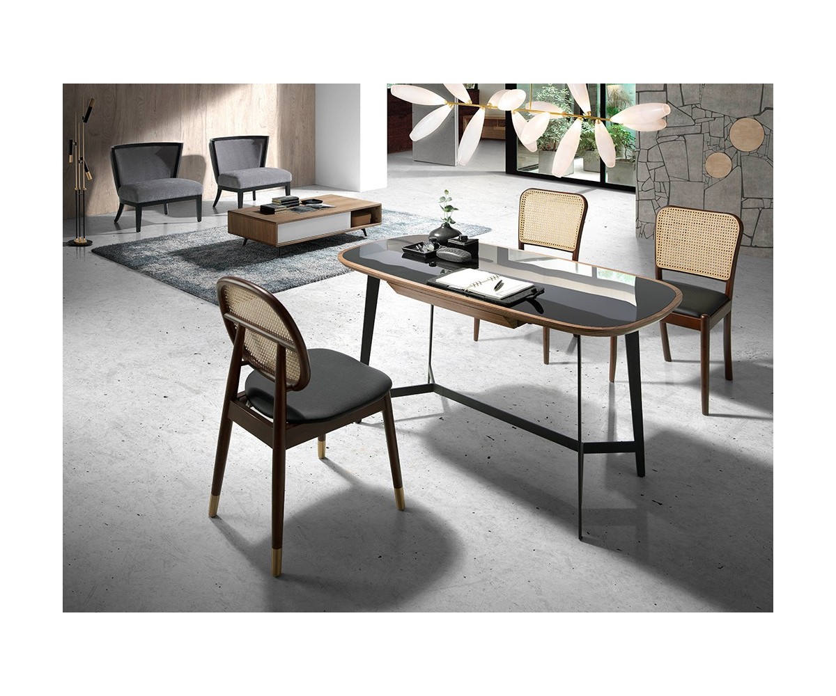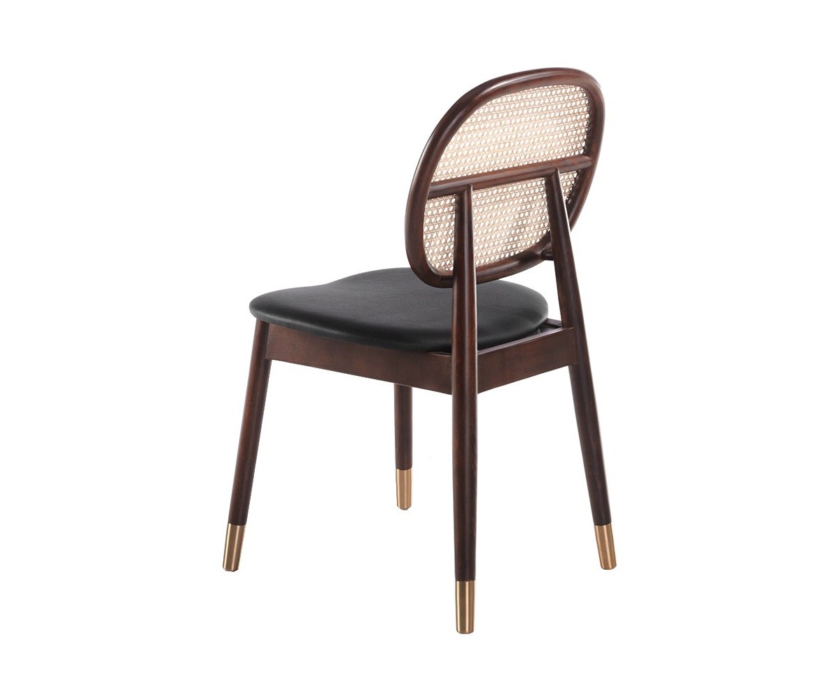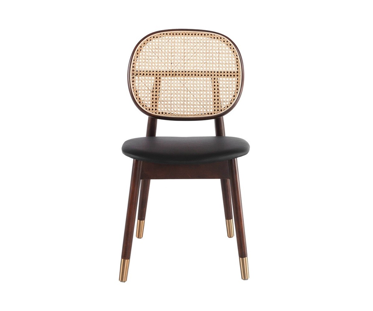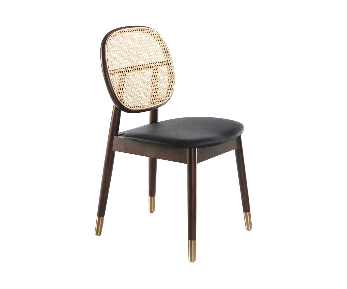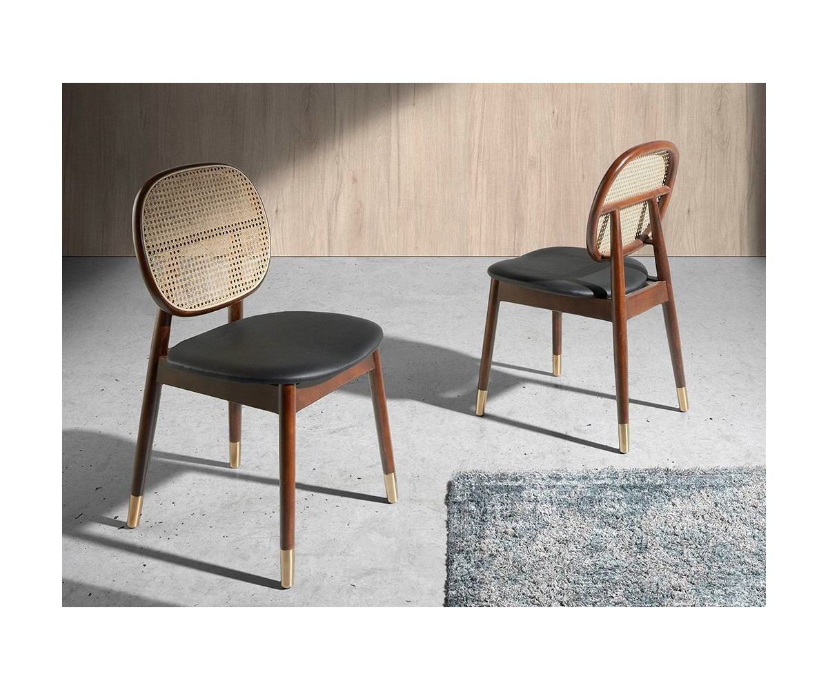 Silla contemporanea inspirada en un diseño de Marcel Gascoin. Estructura fabricada en madera de nogal macizo, asiento en piel color negro y respaldo en rejilla de rattan. Asiento relleno de espuma inyectada de polieter de 25kg/m3 de densidad. Detalle patas en acero color dorado. Si desea otros acabado de estructura o tapizado de asiento contacte con nosotros. Réplica exacta con materiales originales de máxima calidad.