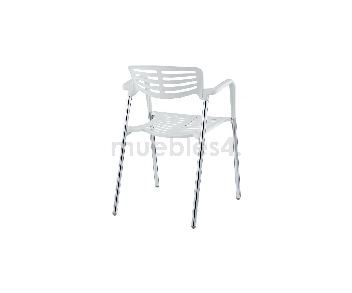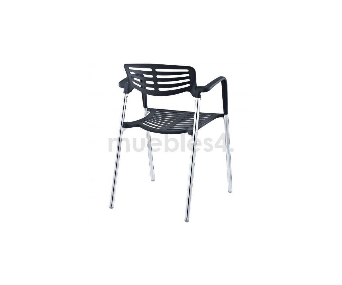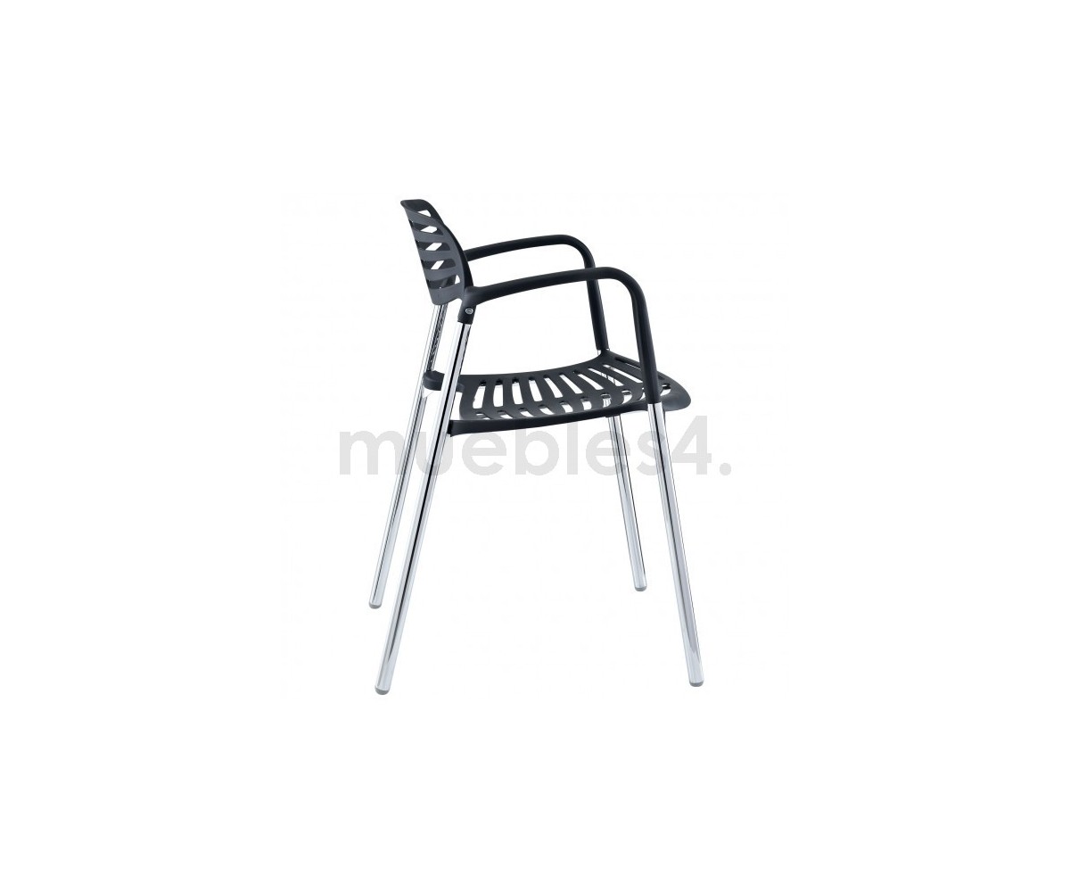 Silla apilable, inspirada en un diseño de Jorge Pensi. Armazón realizado en acero tubular cromado, asiento y respaldo polipropileno color banco o negro. Silla diseñada para exterior e interior. Réplica exacta con materiales originales de máxima calidad.