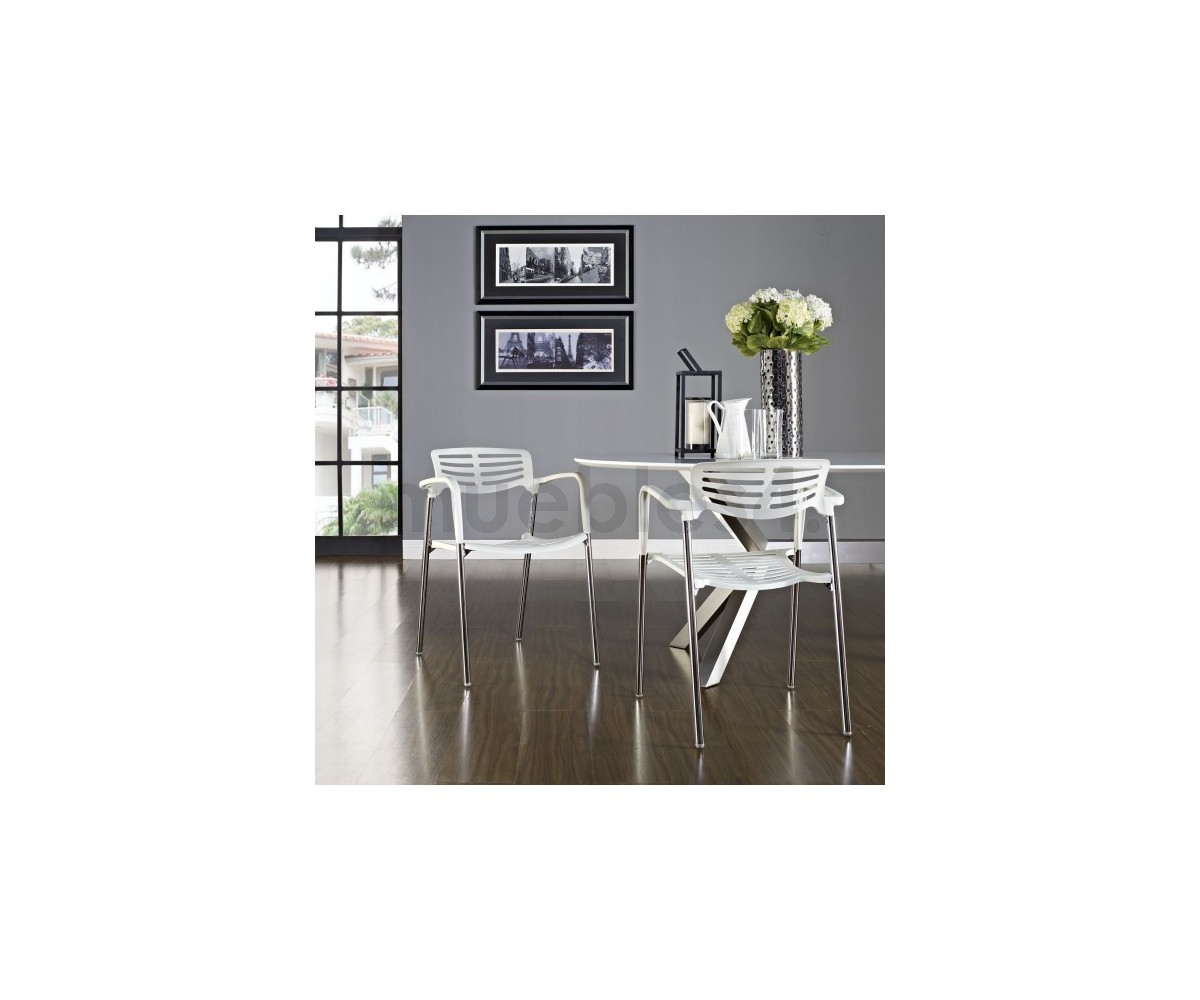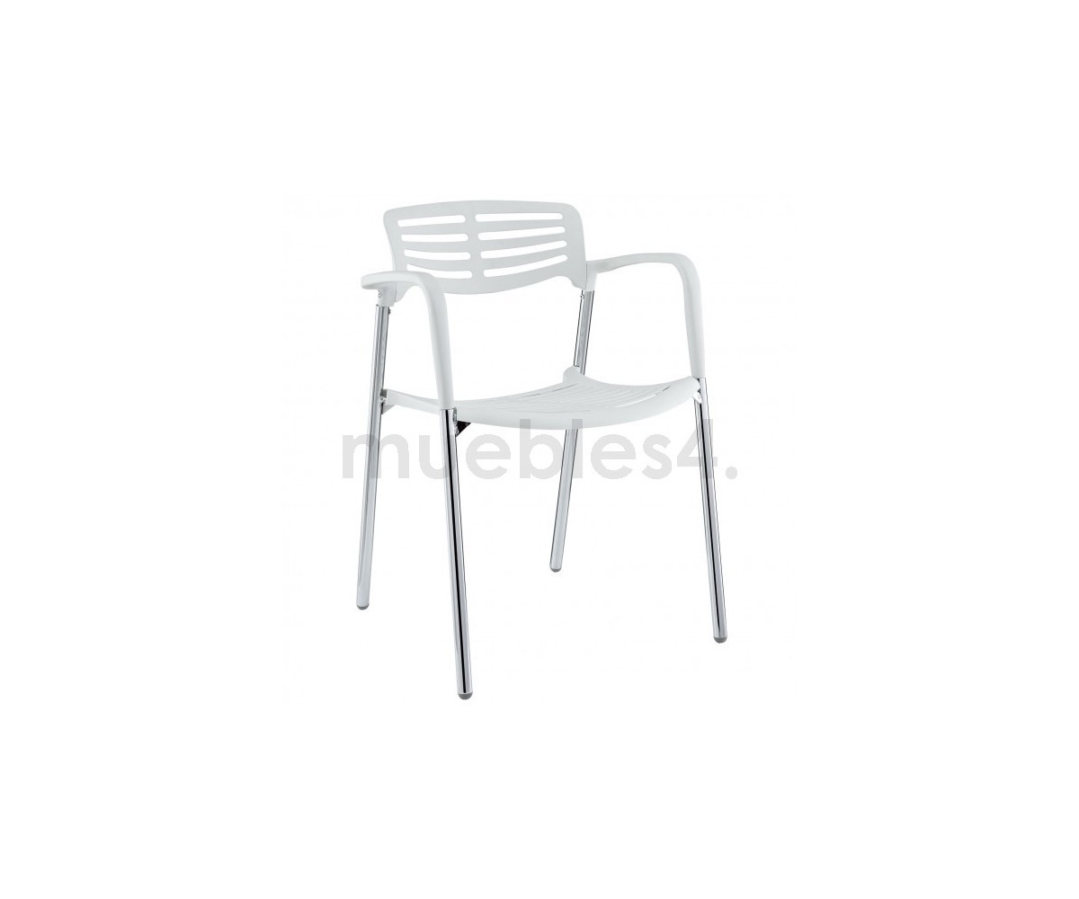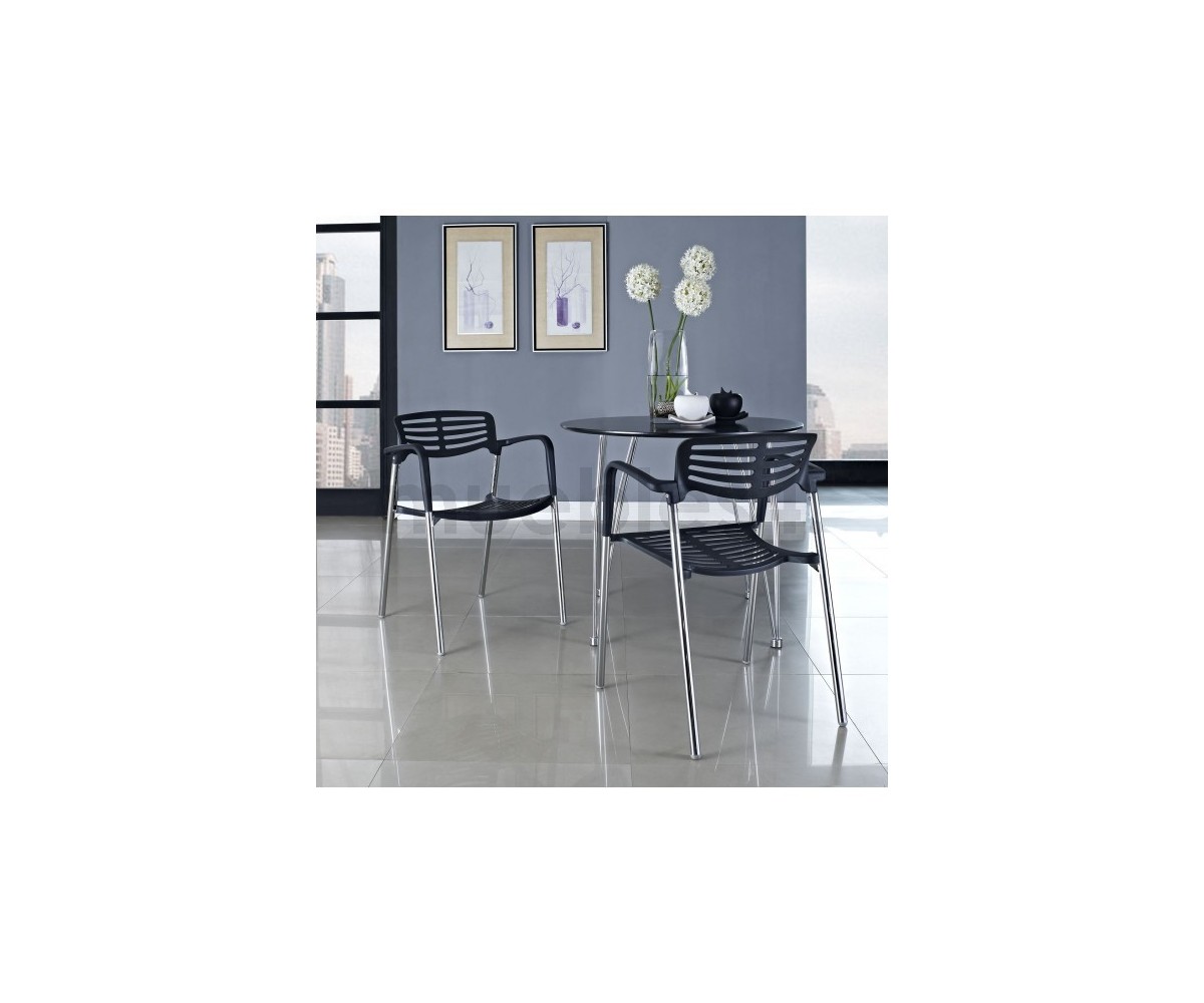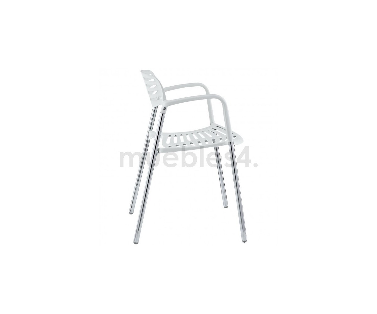 Silla apilable, inspirada en un diseño de Jorge Pensi. Armazón realizado en acero tubular cromado, asiento y respaldo polipropileno color banco o negro. Silla diseñada para exterior e interior. Réplica exacta con materiales originales de máxima calidad.