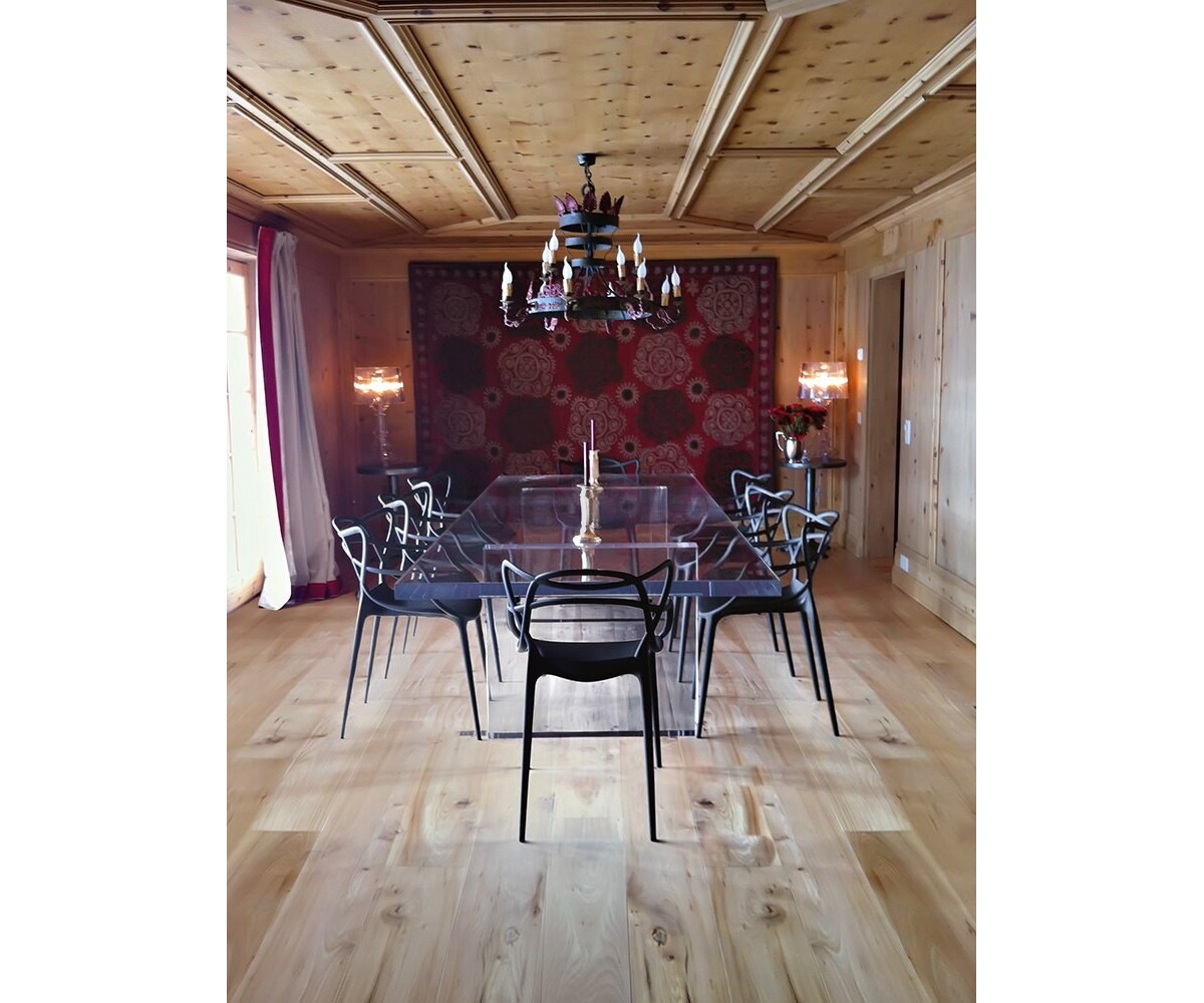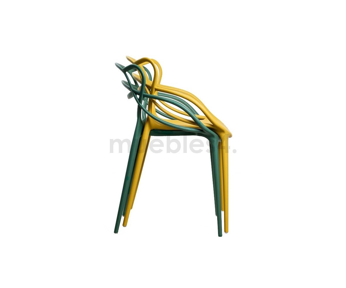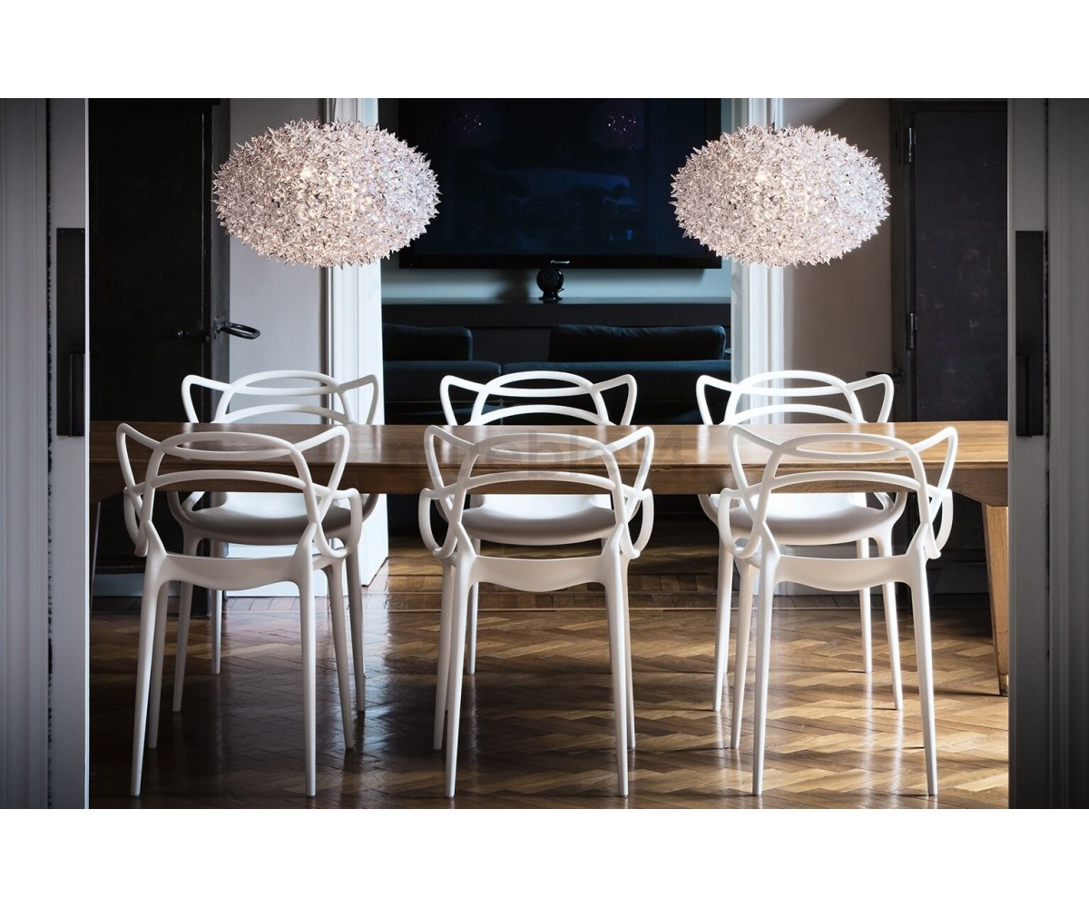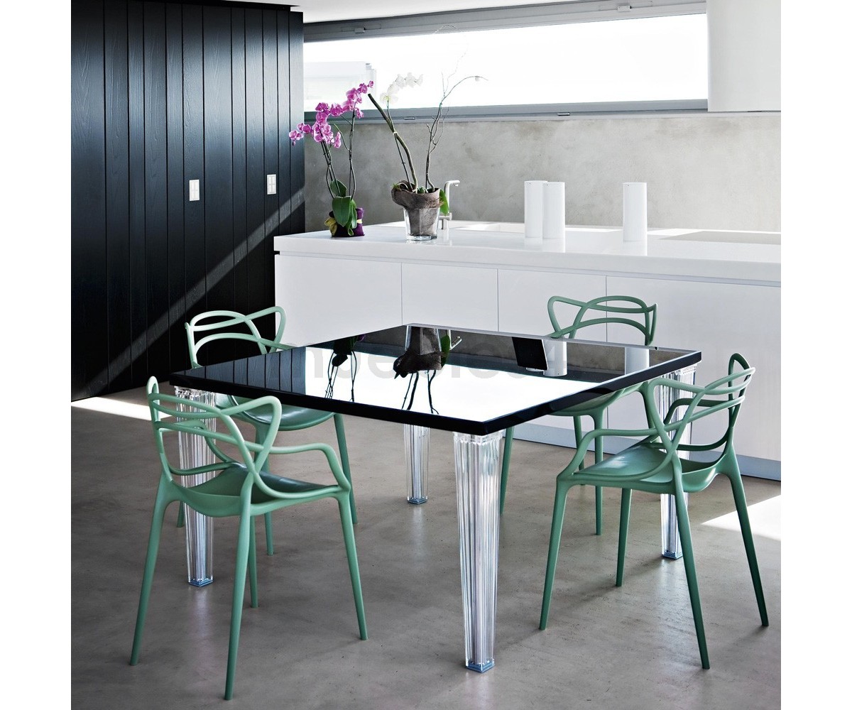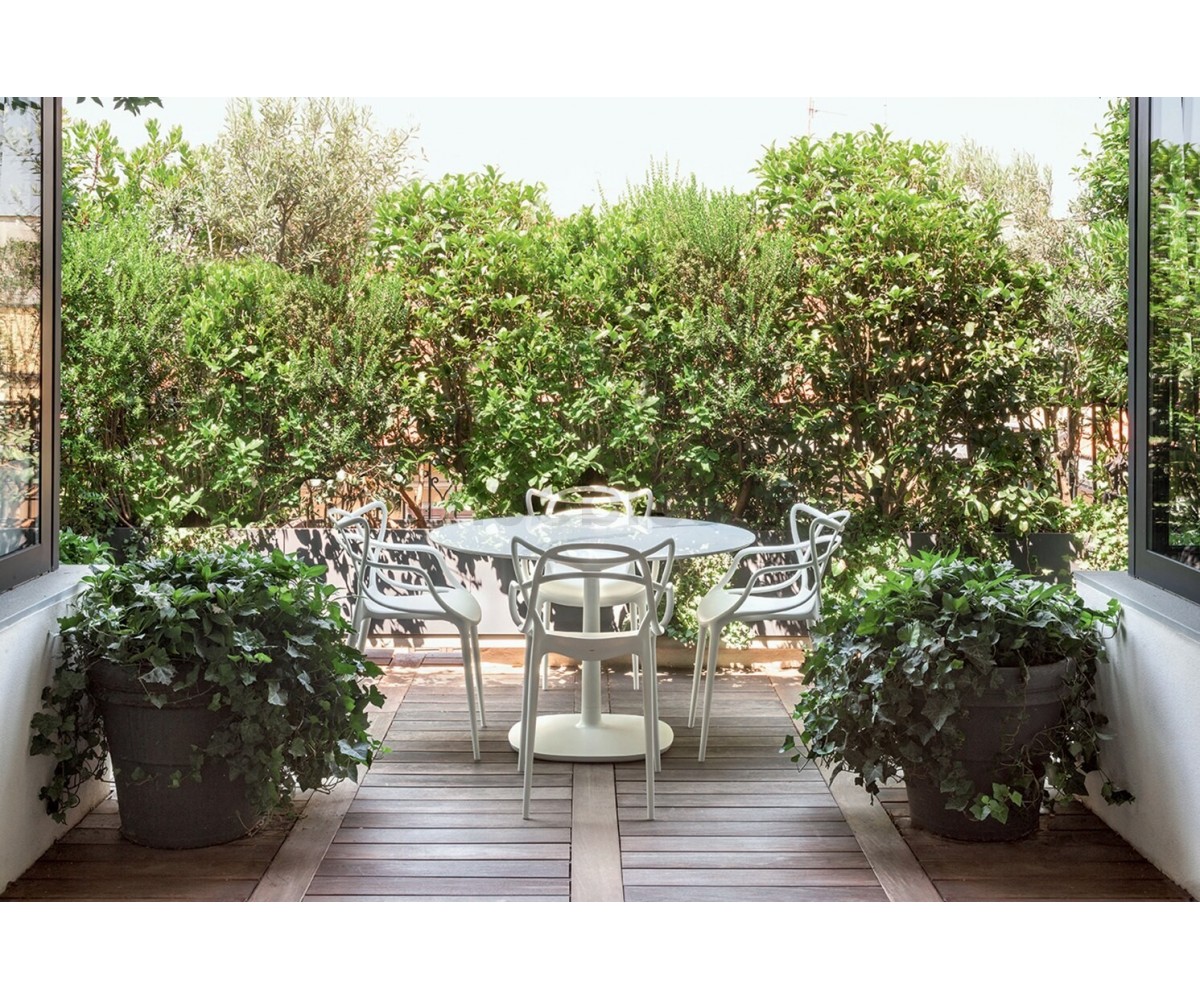 Silla apilables, inspirada en un diseño de Philippe Starck. La silla Masters es un escultórico diseño apilable que rinde homenaje a 3 icónicas piezas del diseño: La silla Tulip de Eero Saarinen, la Serie 7 de Arne Jacobsen y la Plastic Chair con base metálica Eiffel de Charles y Ray Eames. La fusión de las 3 obras forma la silla Masters. Apoyada sobre cuatro finas patas, el asiento de la silla Masters es amplio y cómodo. La particularidad de la silla es por lógica el respaldo, y todo su conjunto tiene un acabado especial con un aspecto atractivo, dando vida a una fusión de diferentes estilos.