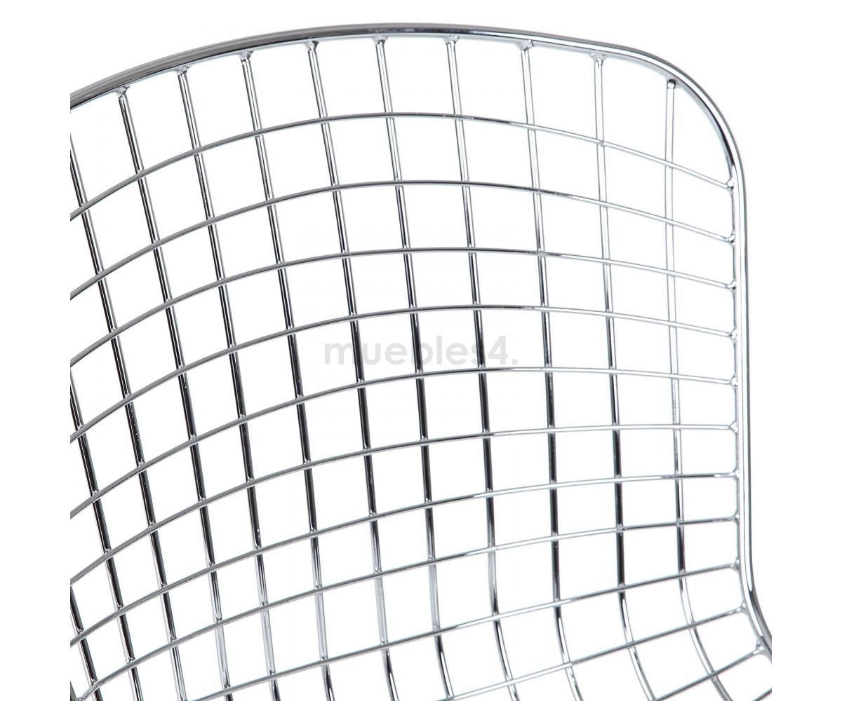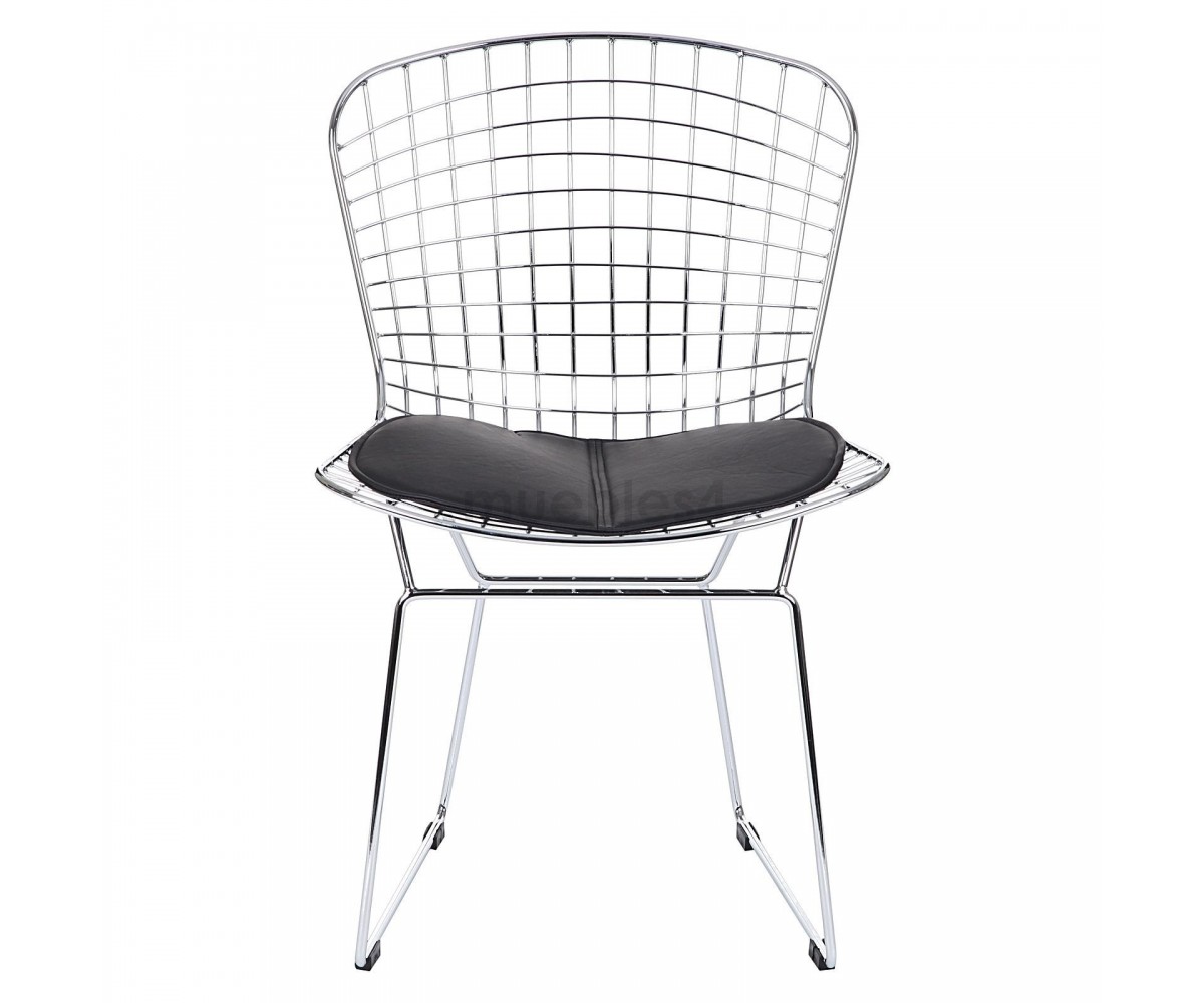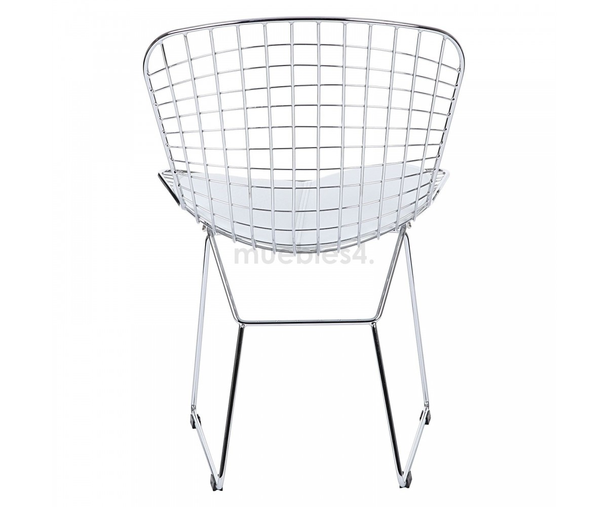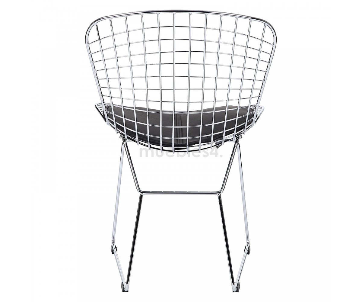 Silla inspirada en un diseño de Harry Bertoia. Estructura fabricada con barillas de acero tubular cromado inoxidable, terminación brillo. Cojín en piel ecológica color negro o blanco. Réplica exacta con materiales originales de máxima calidad.