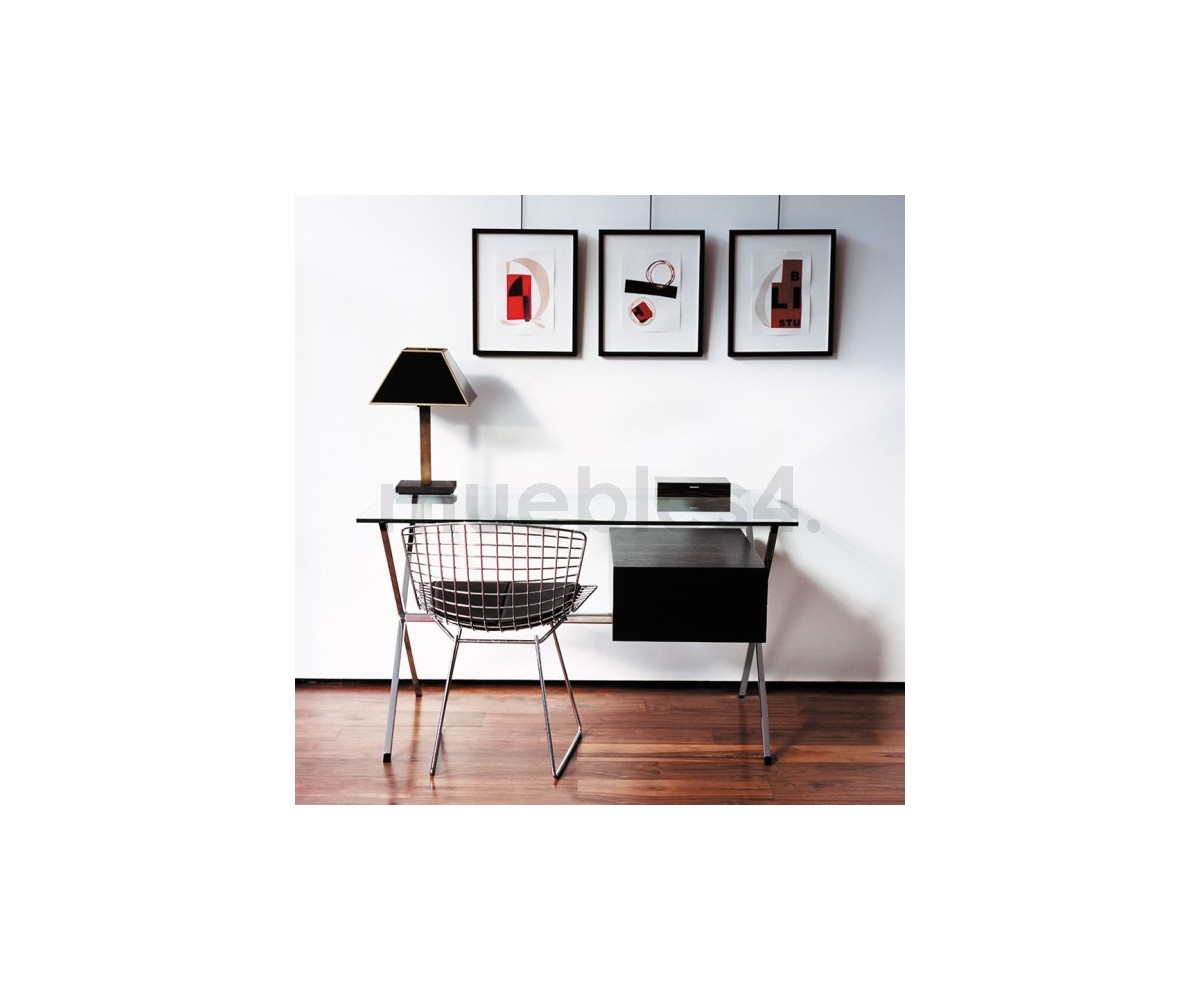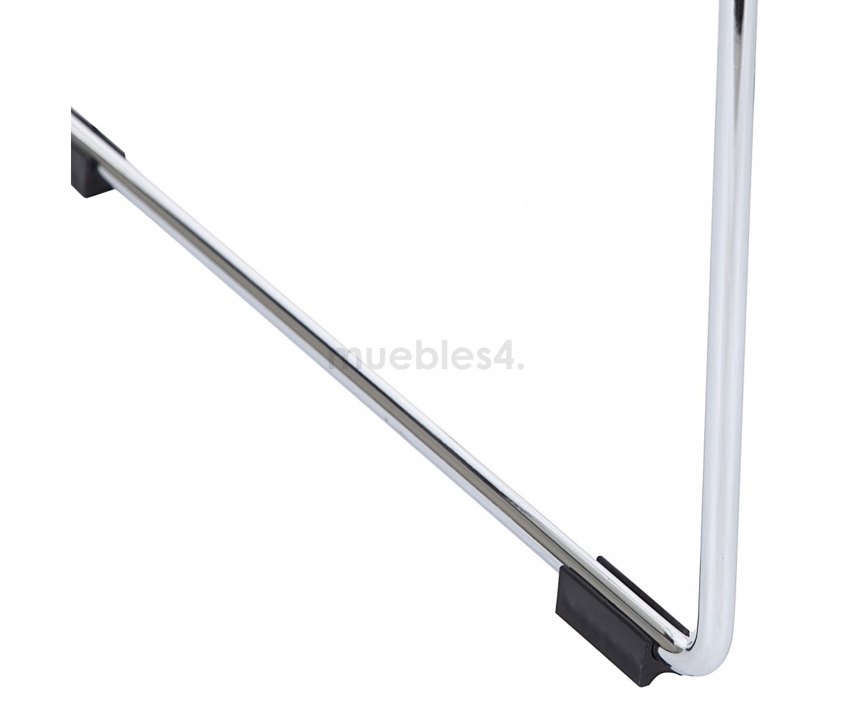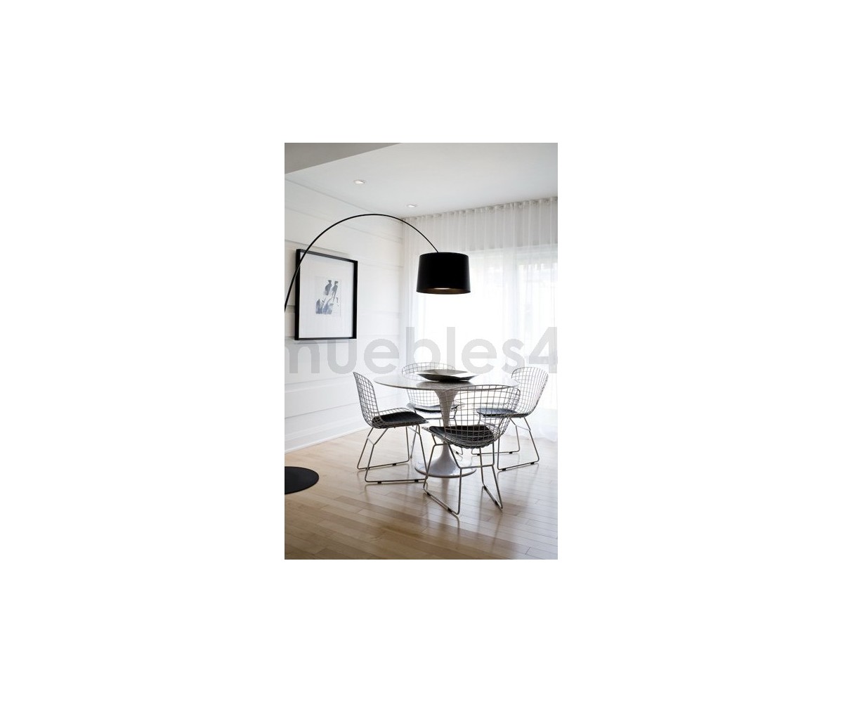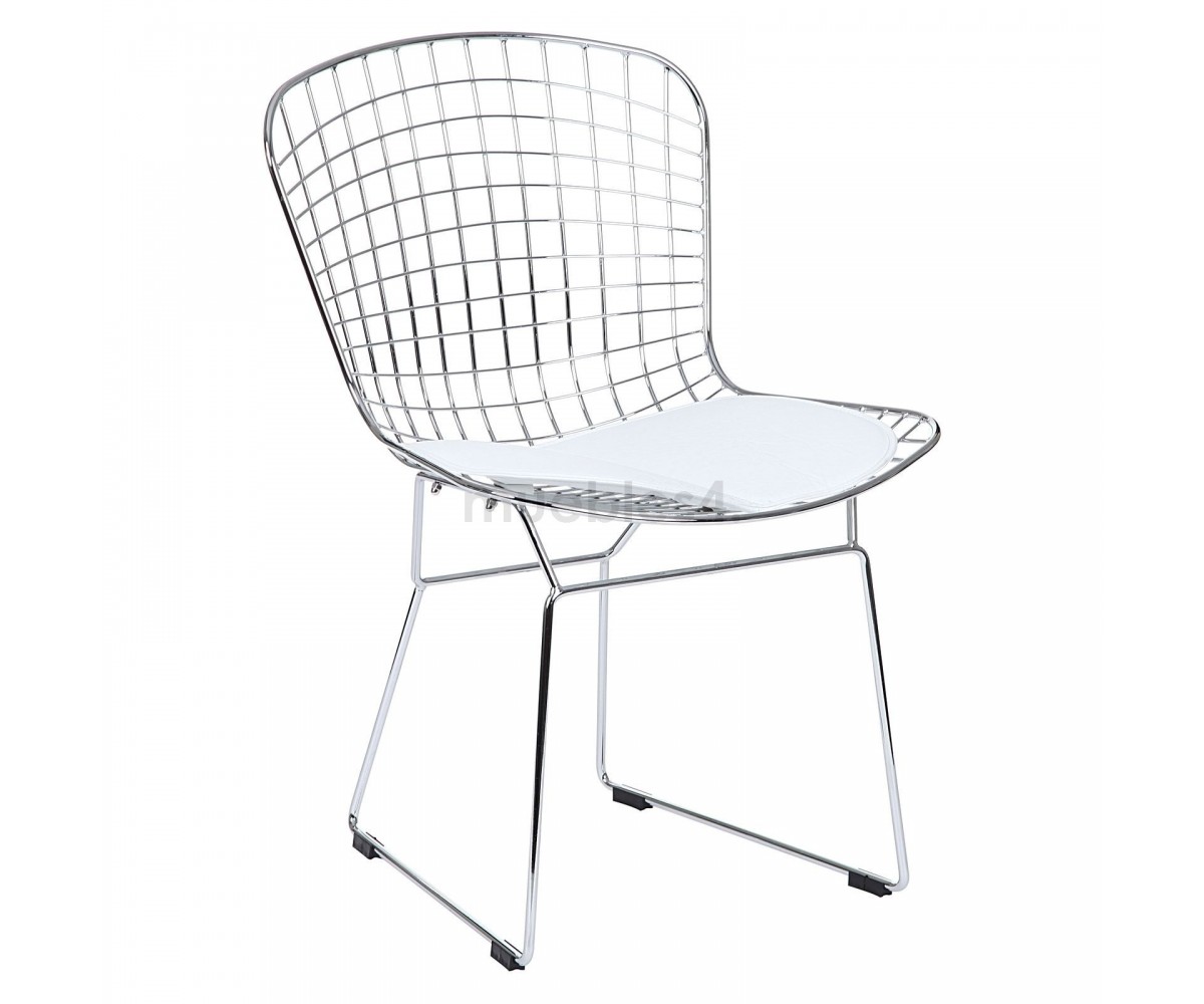 Silla inspirada en un diseño de Harry Bertoia. Estructura fabricada con barillas de acero tubular cromado inoxidable, terminación brillo. Cojín en piel ecológica color negro o blanco. Réplica exacta con materiales originales de máxima calidad.