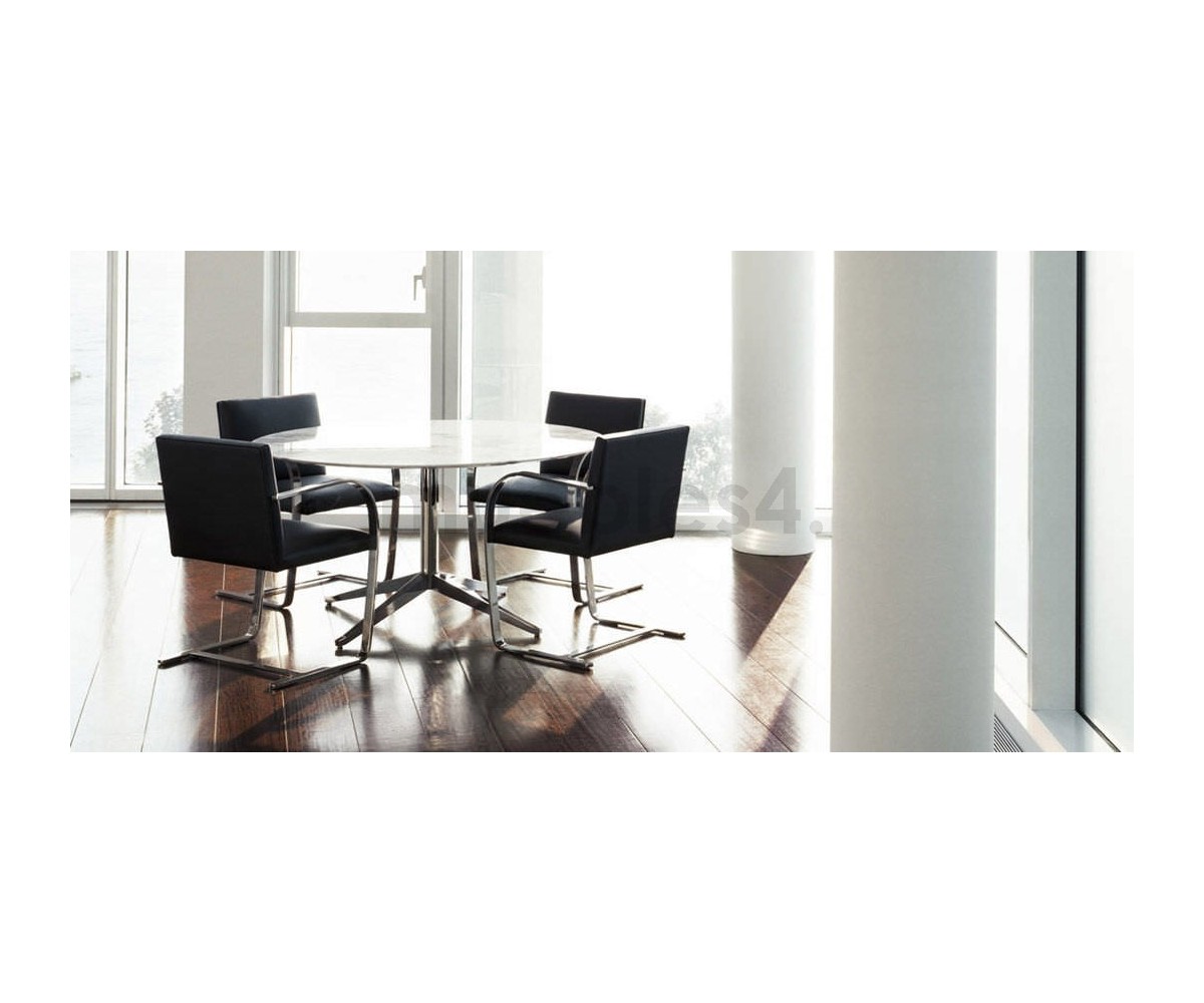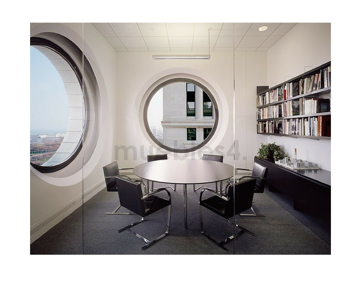 Silla inspirada en un diseño de Mies Van der Rohe. Estructura fabricada en pletina de acero cromado terminación brillo, asiento y respaldo en piel italiana de máxima calidad, color negro. Réplica exacta con materiales originales de máxima calidad.