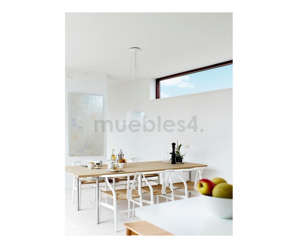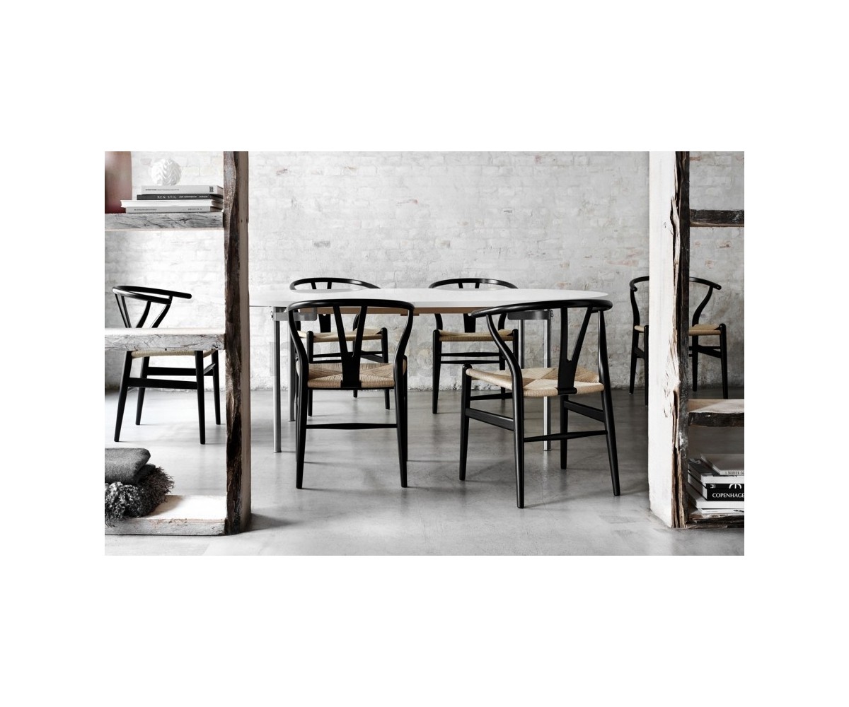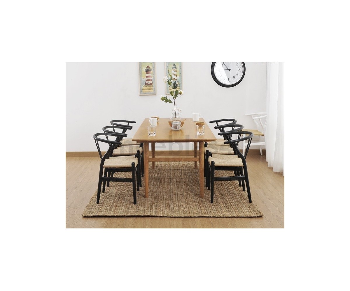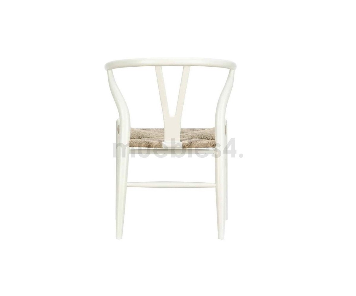Silla inspirada en un diseño de Hans J. Wegner. Estructura fabricada en madera de haya lacado color negro o blanco, asiento trenzada en enea color natural. Réplica exacta con materiales originales de máxima calidad.