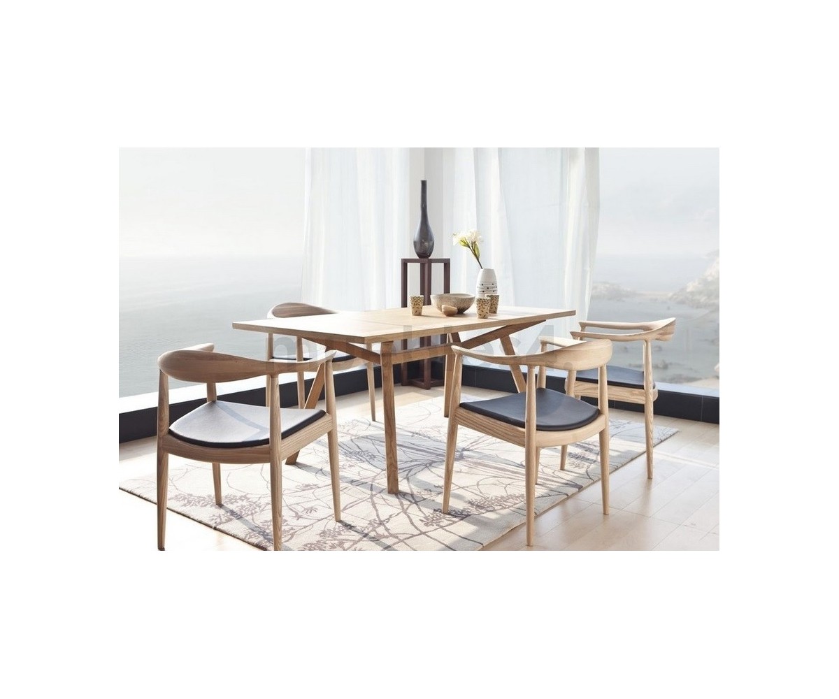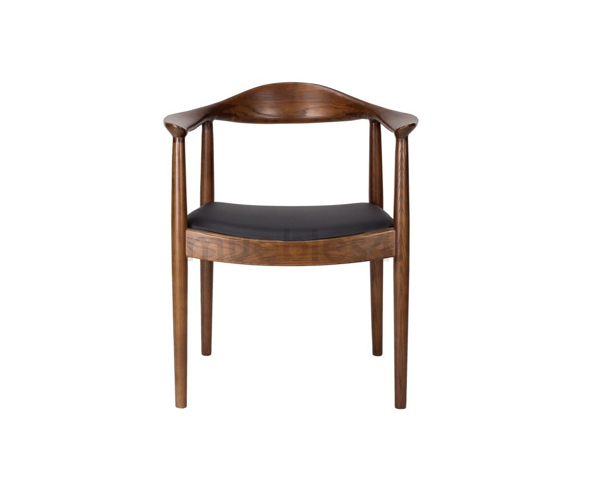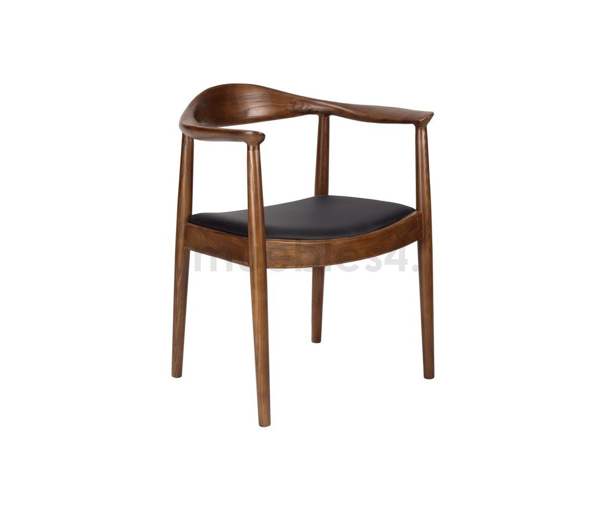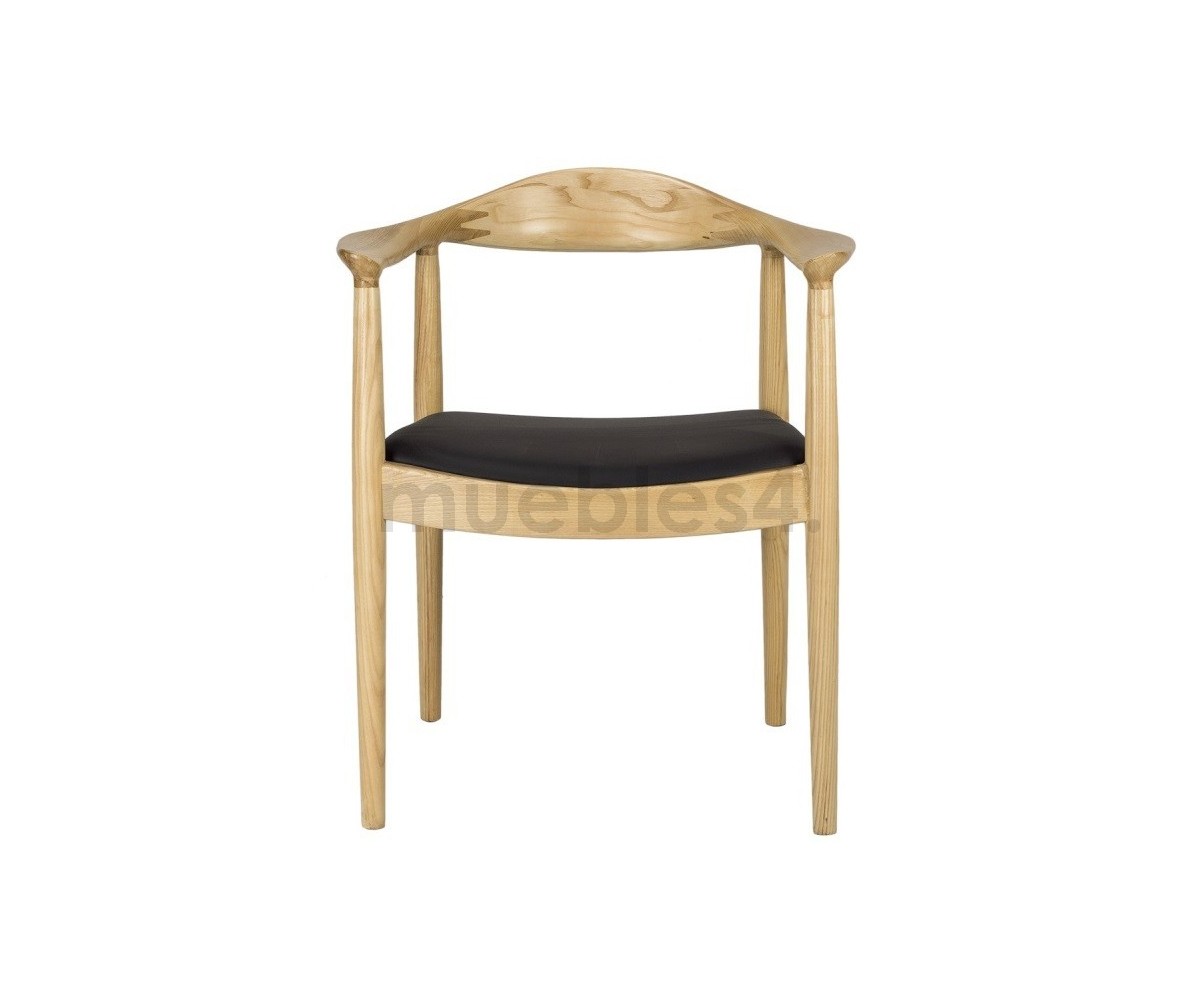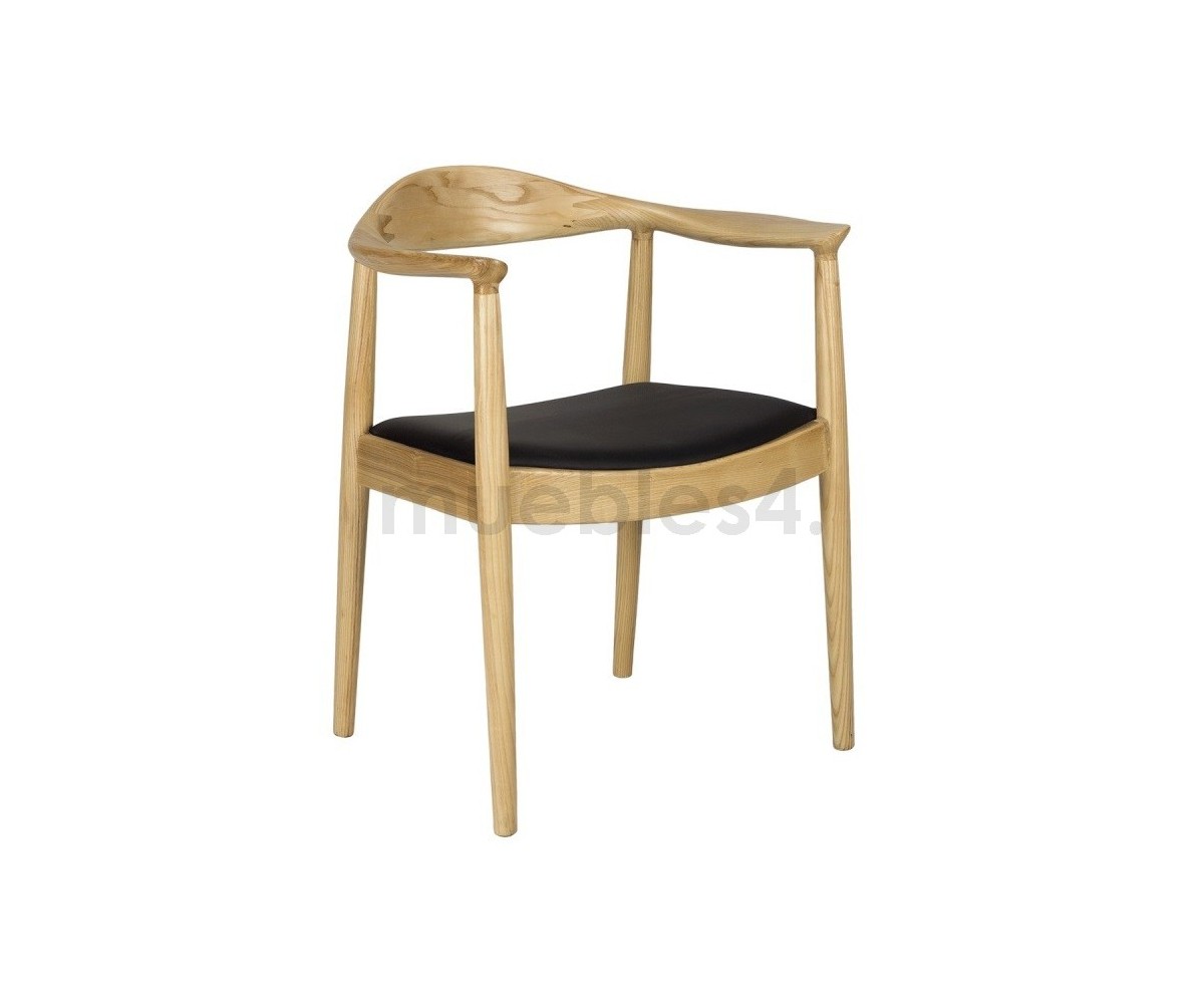 Silla con apoyabrazos inspirada en un diseño de Hans J. Wegner. Estructura fabricada en madera de roble o nogal, asiento tapizado en piel stamdar color negro. Réplica exacta con materiales originales de máxima calidad.