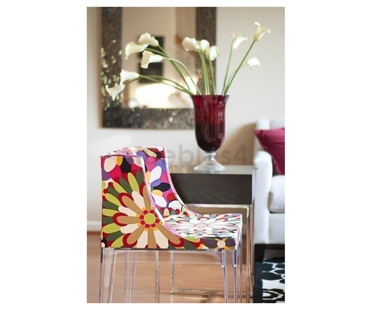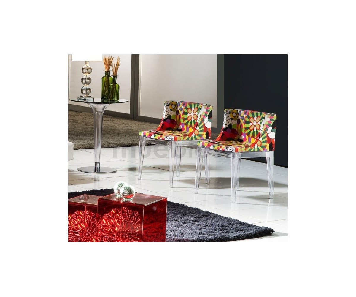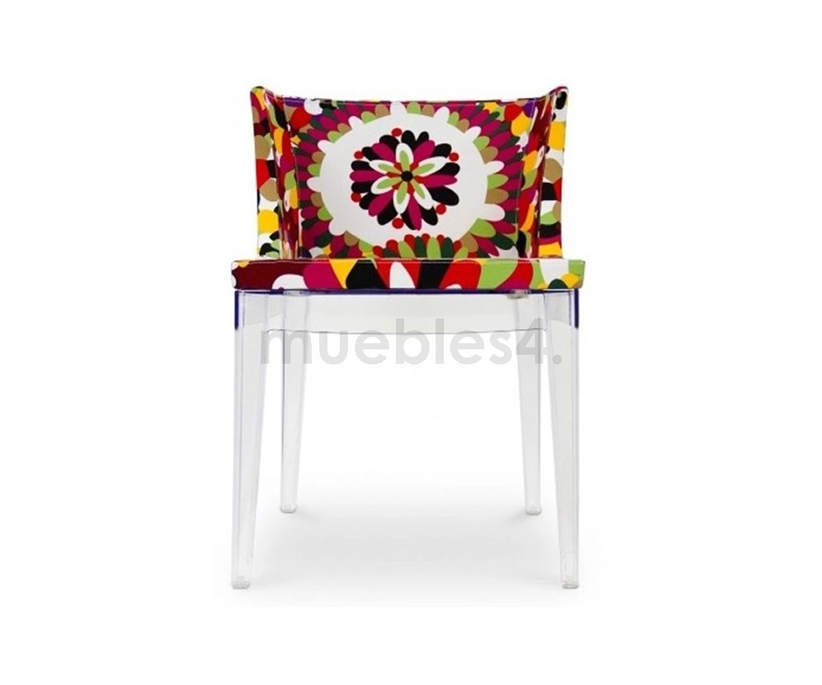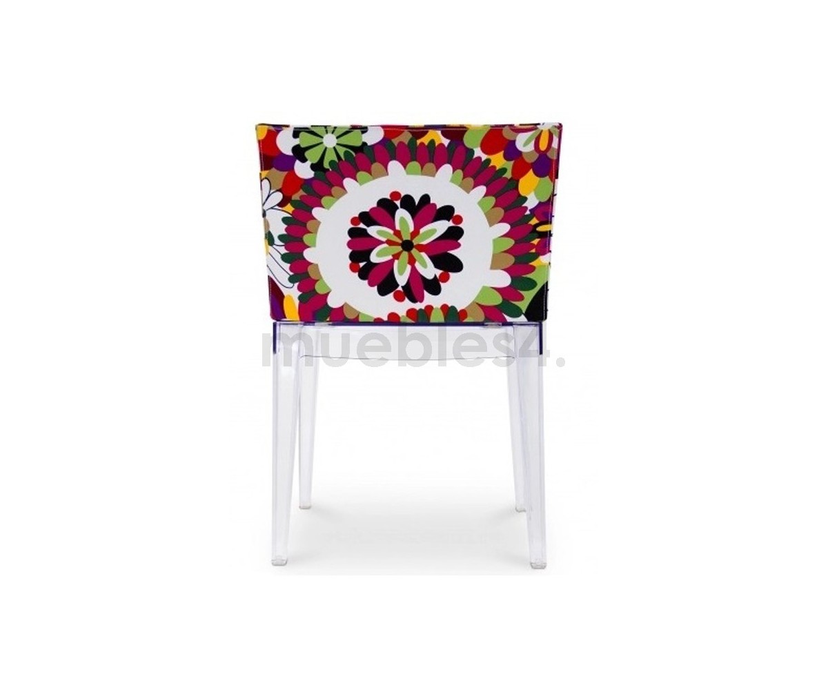 Silla inspirada en un diseño de Philippe Stark. Estructura realizada en policarbonato transparente, tapizada en tejido fantasia multicolor, el estampado puede variar ligeramente. Réplica exacta con materiales originales de máxima calidad.