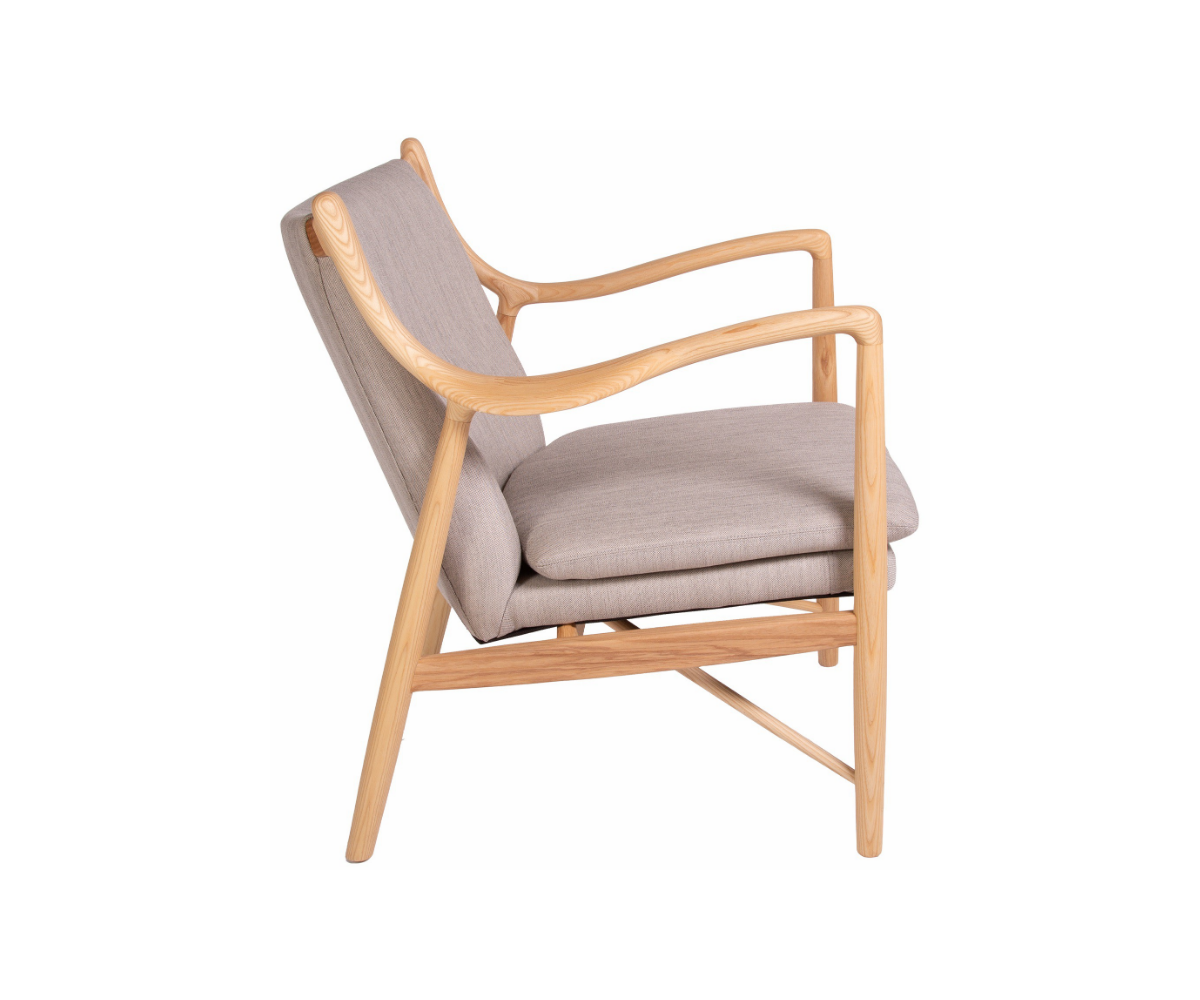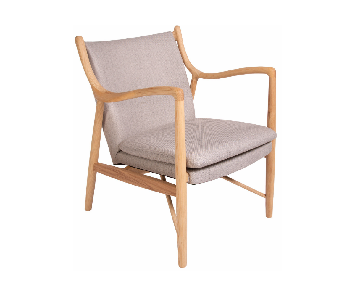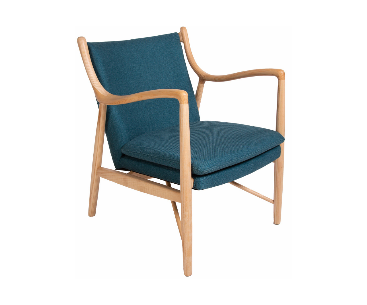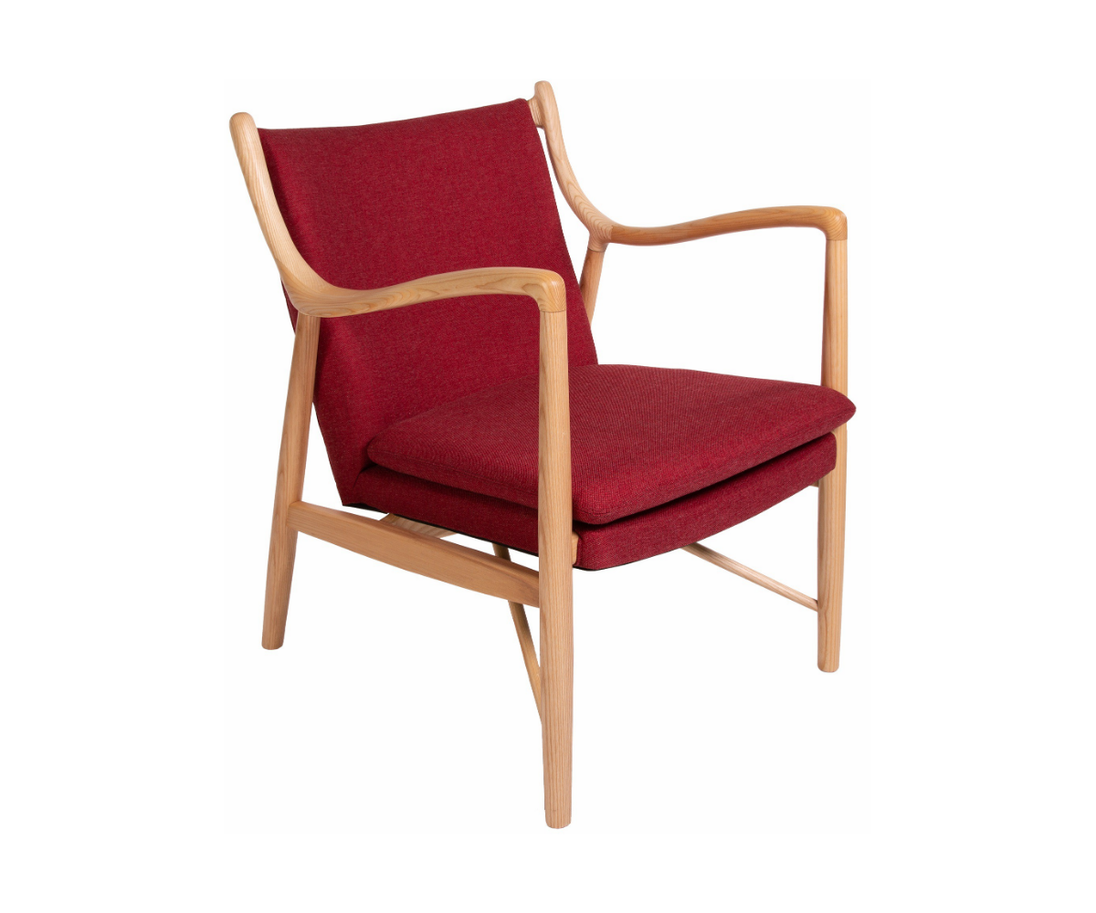 Sillón inspirado en un diseño de Finn Juhl. Tejido: 85% poliéster - 15% algodón Gramaje: 450Gr./m2 Relleno: esponja Densidad: 30-20 Kgr./m3. Disponible en color azul, rojo o beige. Madera de fresno americano. No apilable. Réplica exacta con materiales originales de máxima calidad.