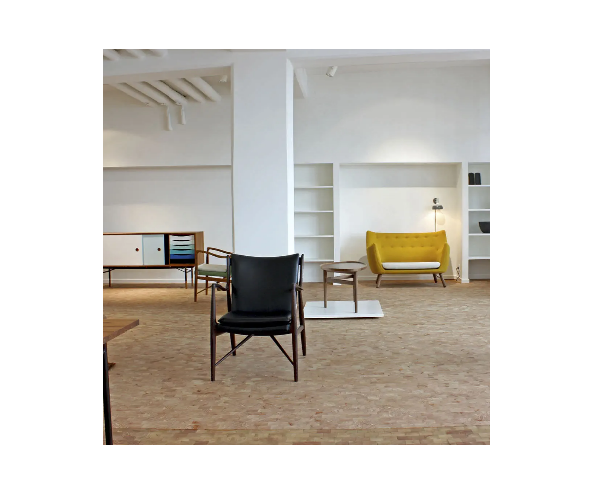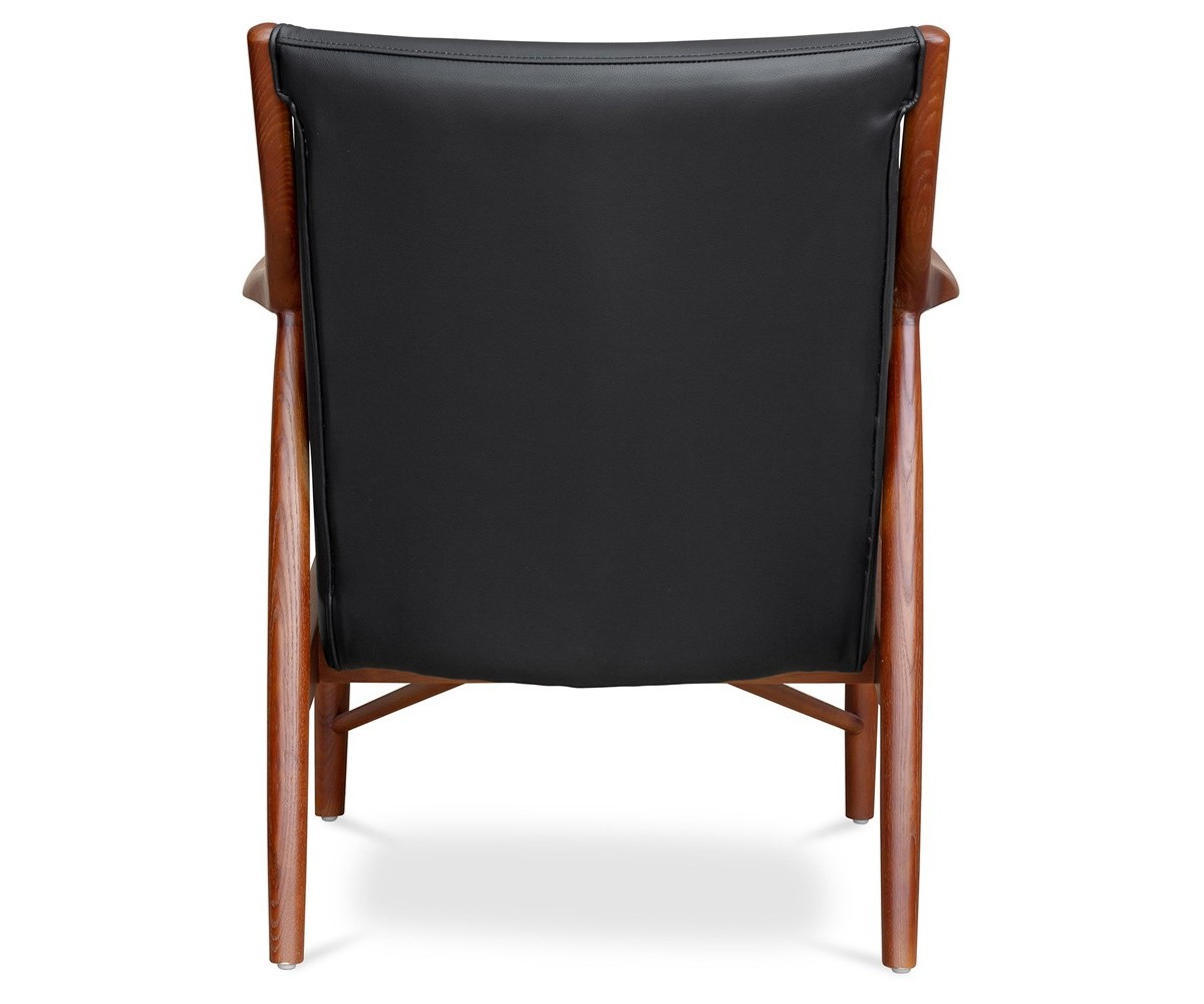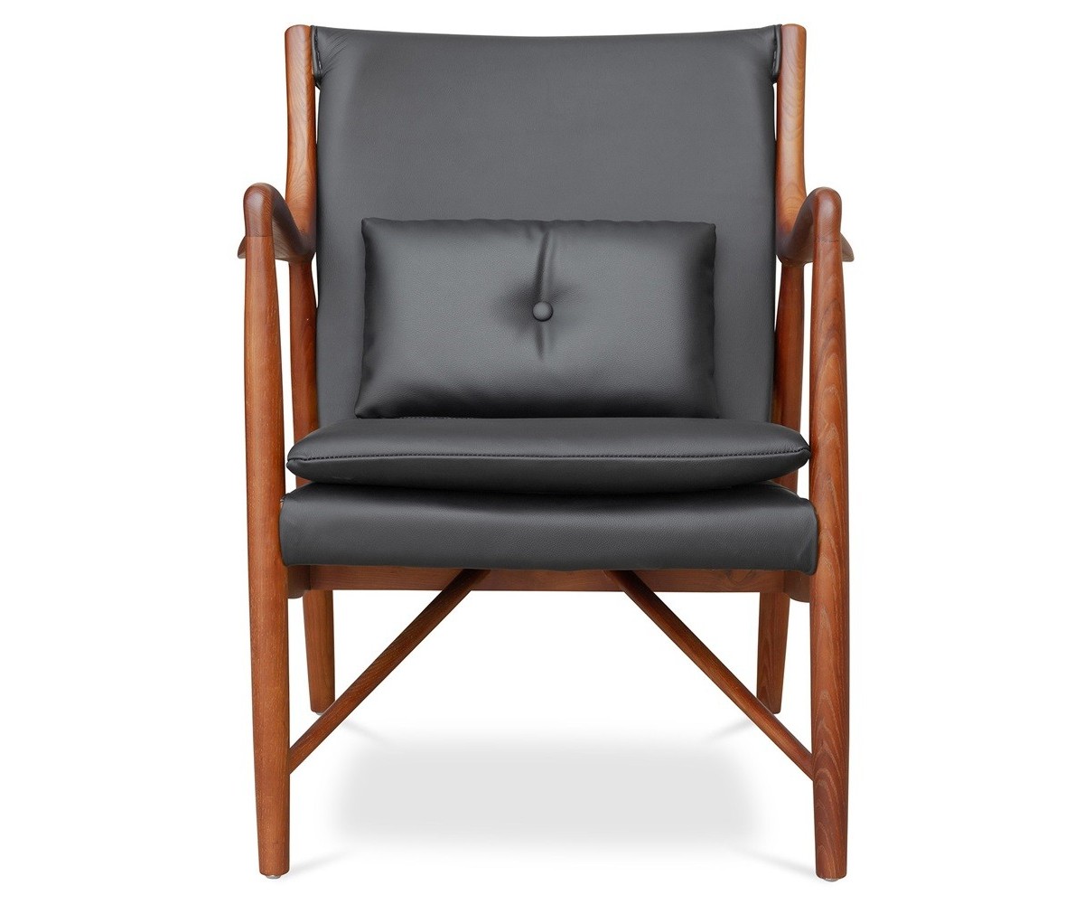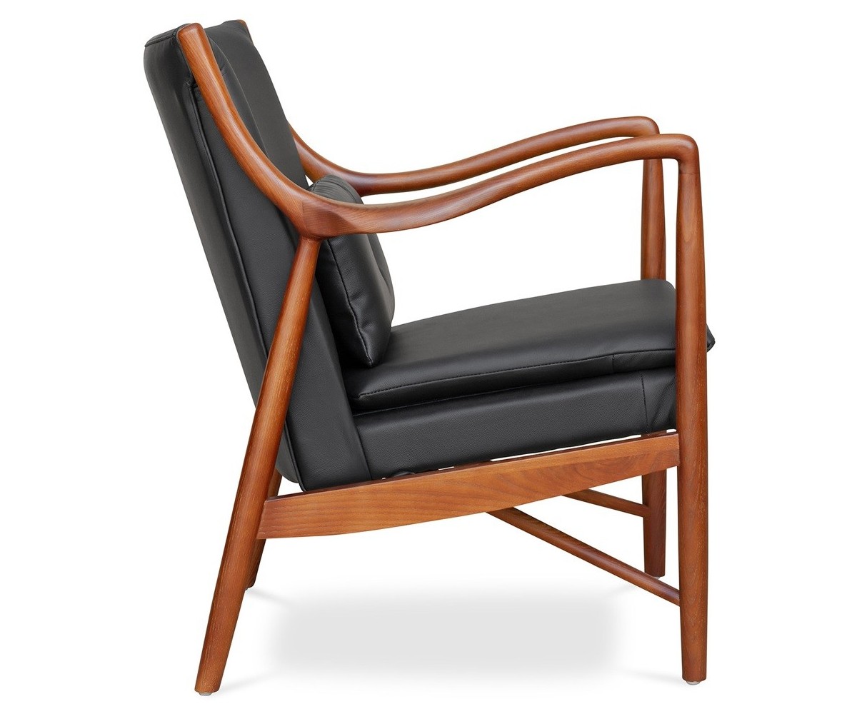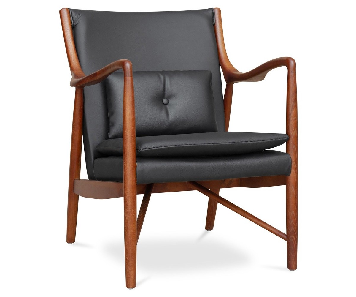 Sillón inspirado en un diseño de Finn Juhl. Estructura fabricada en madera de nogal macizo, tapizado en cuero italiano color negro. Gramaje: 450Gr./m2 Relleno: esponja Densidad: 30-20 Kgr./m3. Réplica exacta con materiales originales de máxima calidad.
