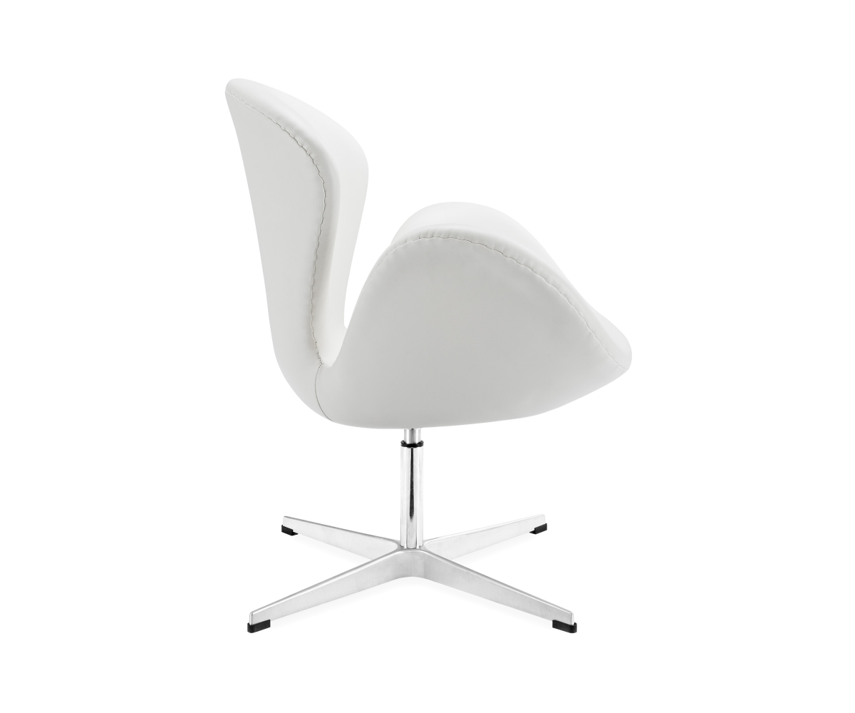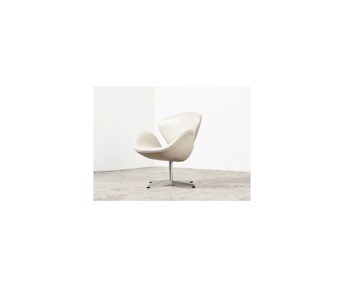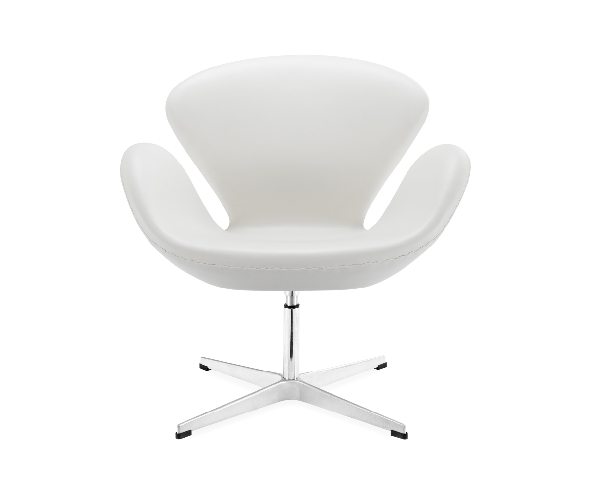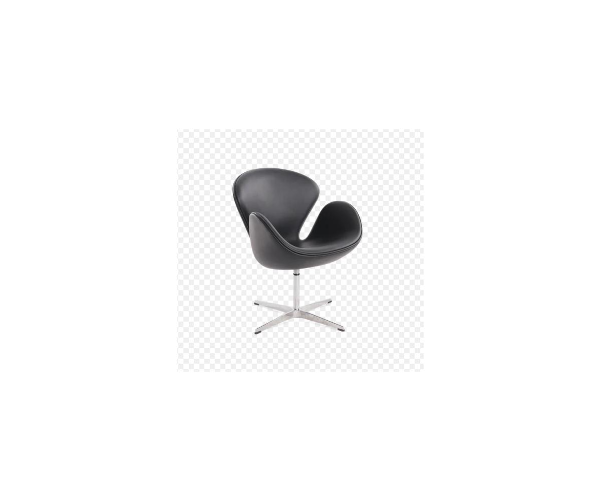 El sillón Cisne fué diseñado por Arne Jacobsen en 1958 para el vestíbulo y las áreas de descanso del SAS Royal Hotel en Copenhague. Es uno de los sillones más populares dentro de la colección de sillas de Fritz Hansen. Base de aluminio y acero satinado con cuerpo central tubular y cuatro aspas. Carcasa de acero con espuma inyectada de poliuretano y fibra de vidrio, tapizado en Cuero ecológico terminación color blanco o negro, para otros colores consultar disponibilidad. Modelo giratorio. También está disponible el sillón de respaldo algo (EGG) y la mesa centro con la misma base (SWAN Table). Réplica exacta con materiales originales de máxima calidad.