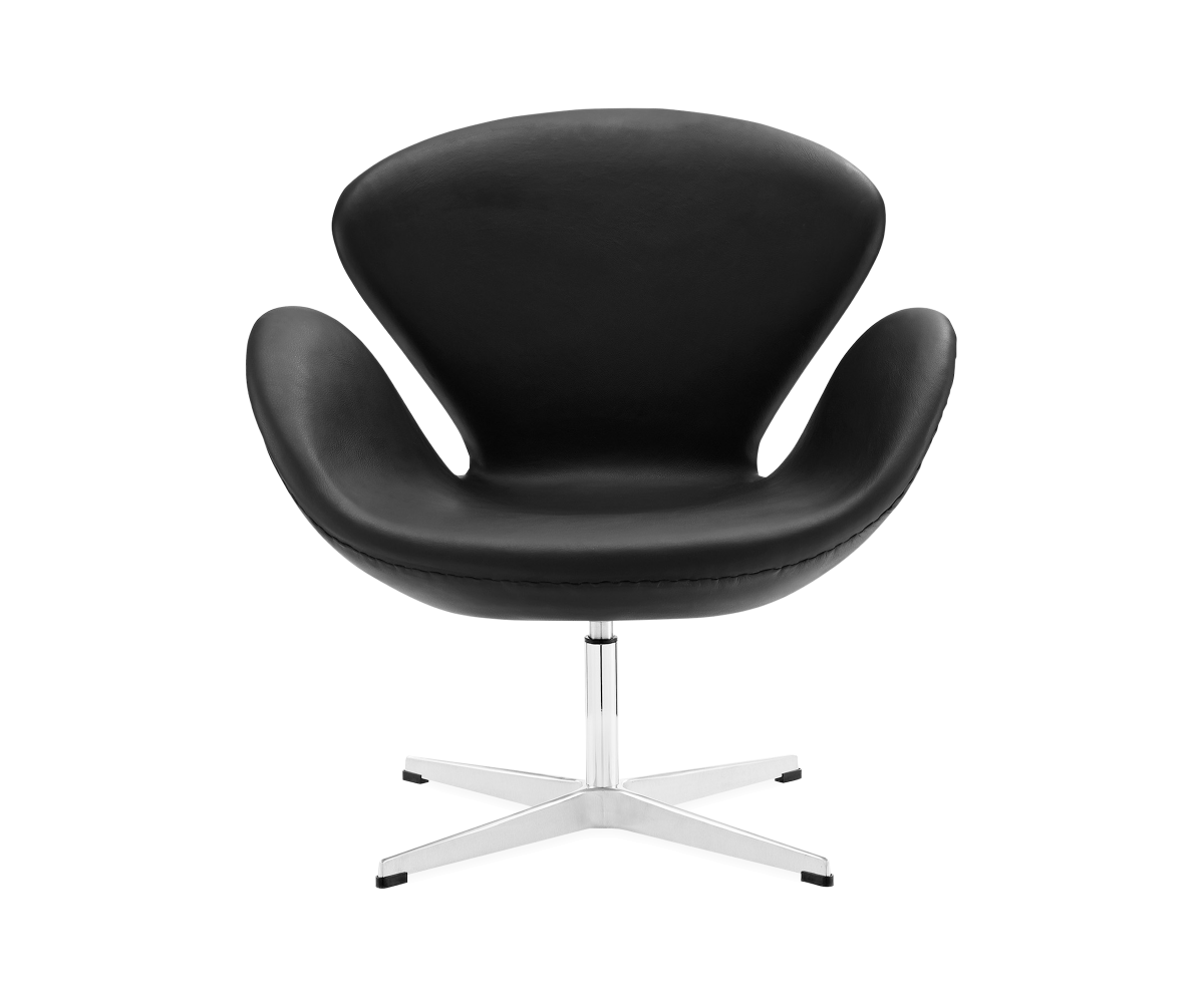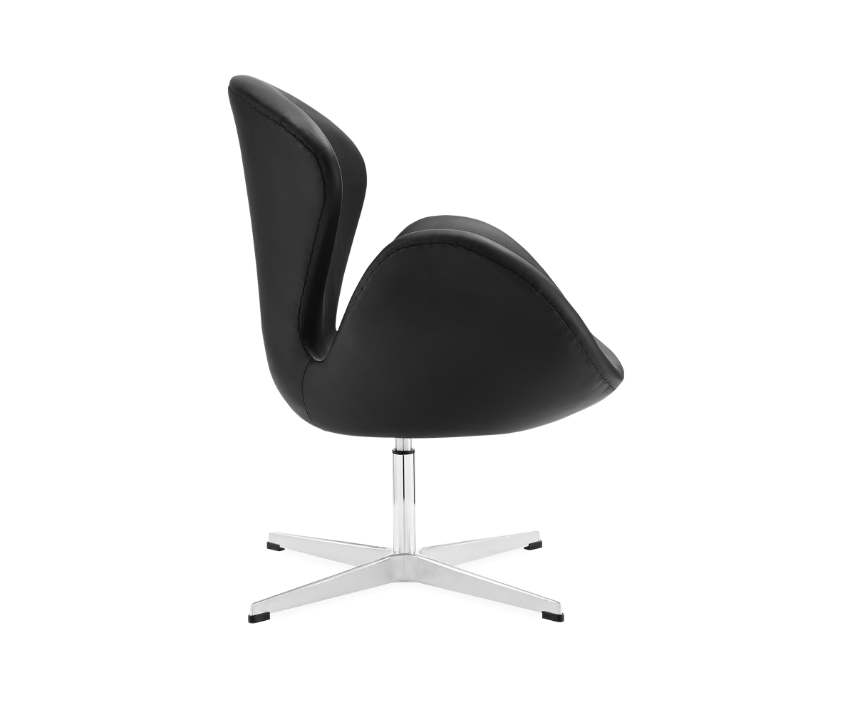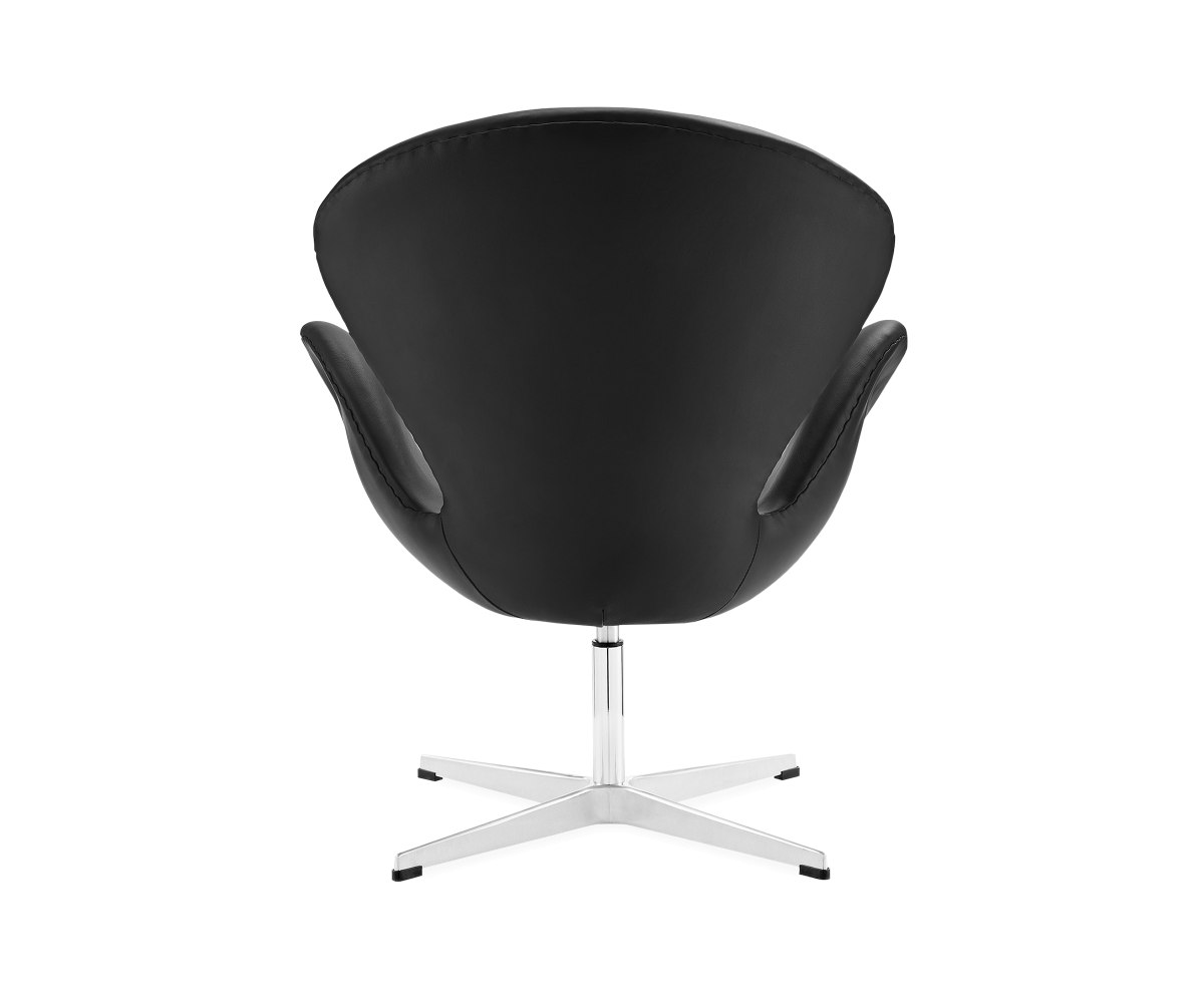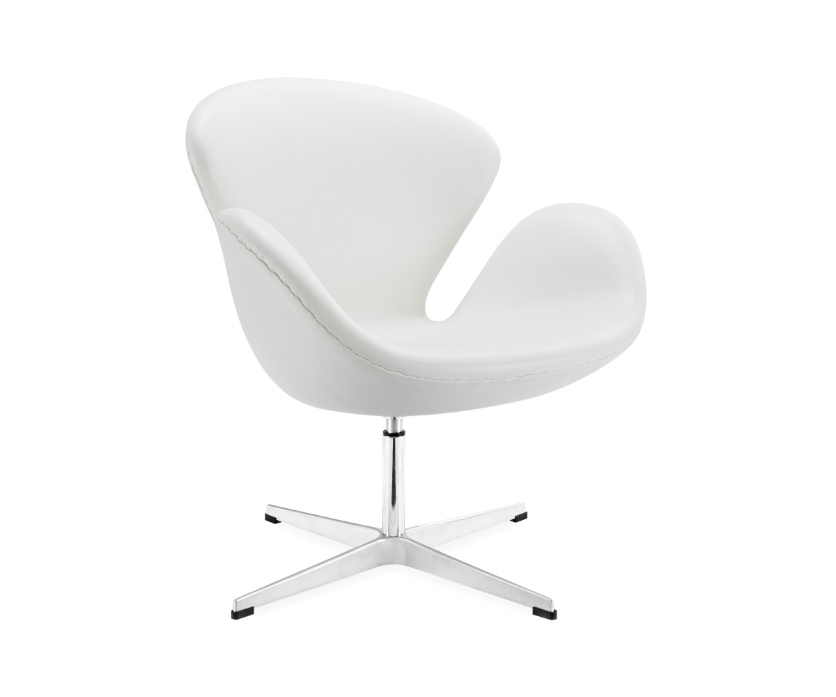 El sillón Cisne fué diseñado por Arne Jacobsen en 1958 para el vestíbulo y las áreas de descanso del SAS Royal Hotel en Copenhague. Es uno de los sillones más populares dentro de la colección de sillas de Fritz Hansen. Base de aluminio y acero satinado con cuerpo central tubular y cuatro aspas. Carcasa de acero con espuma inyectada de poliuretano y fibra de vidrio, tapizado en Cuero ecológico terminación color blanco o negro, para otros colores consultar disponibilidad. Modelo giratorio. También está disponible el sillón de respaldo algo (EGG) y la mesa centro con la misma base (SWAN Table). Réplica exacta con materiales originales de máxima calidad.
