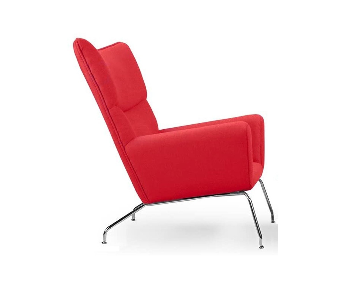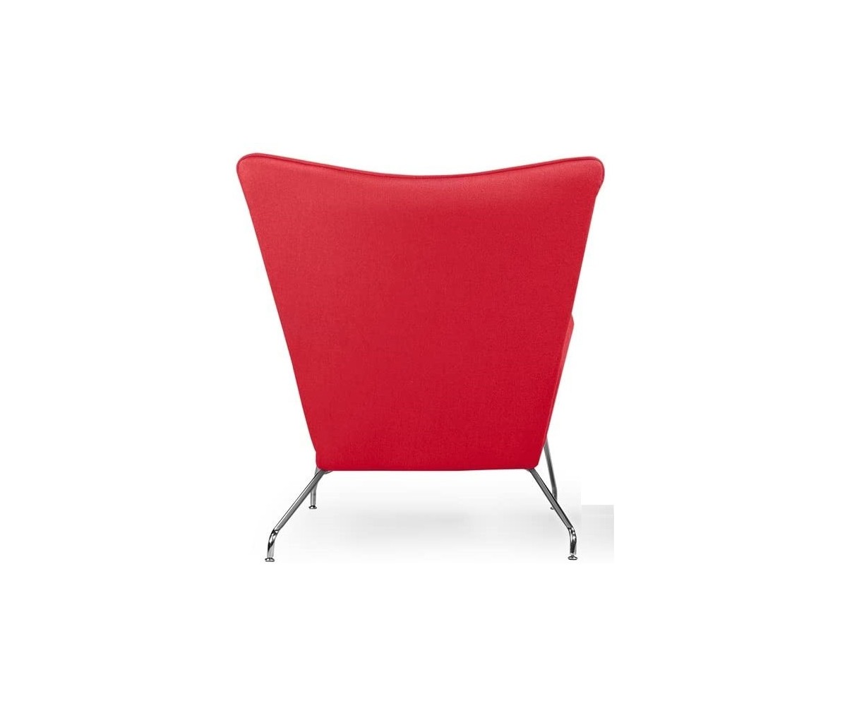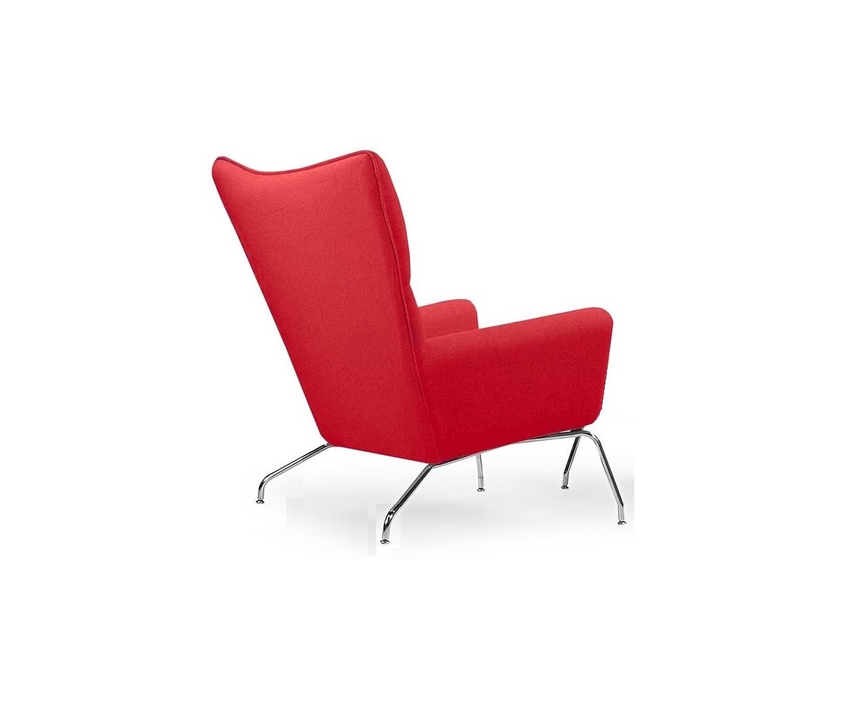 Sillón inspirado en un diseño de Hans J. Wegner. Estructura de acero inoxidable tubular terminación brillo, tapizado en tejido cachemire color rojo. Réplica exacta con materiales originales de máxima calidad.