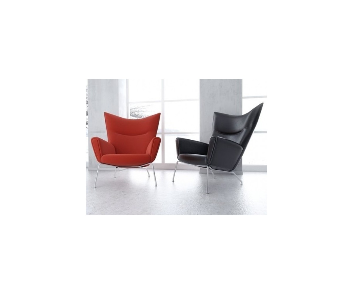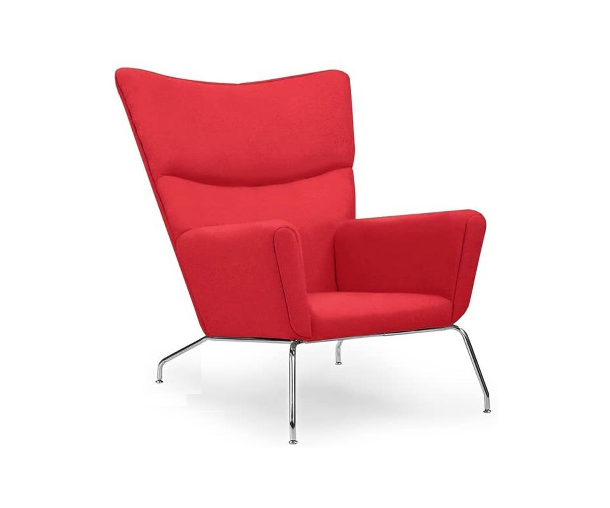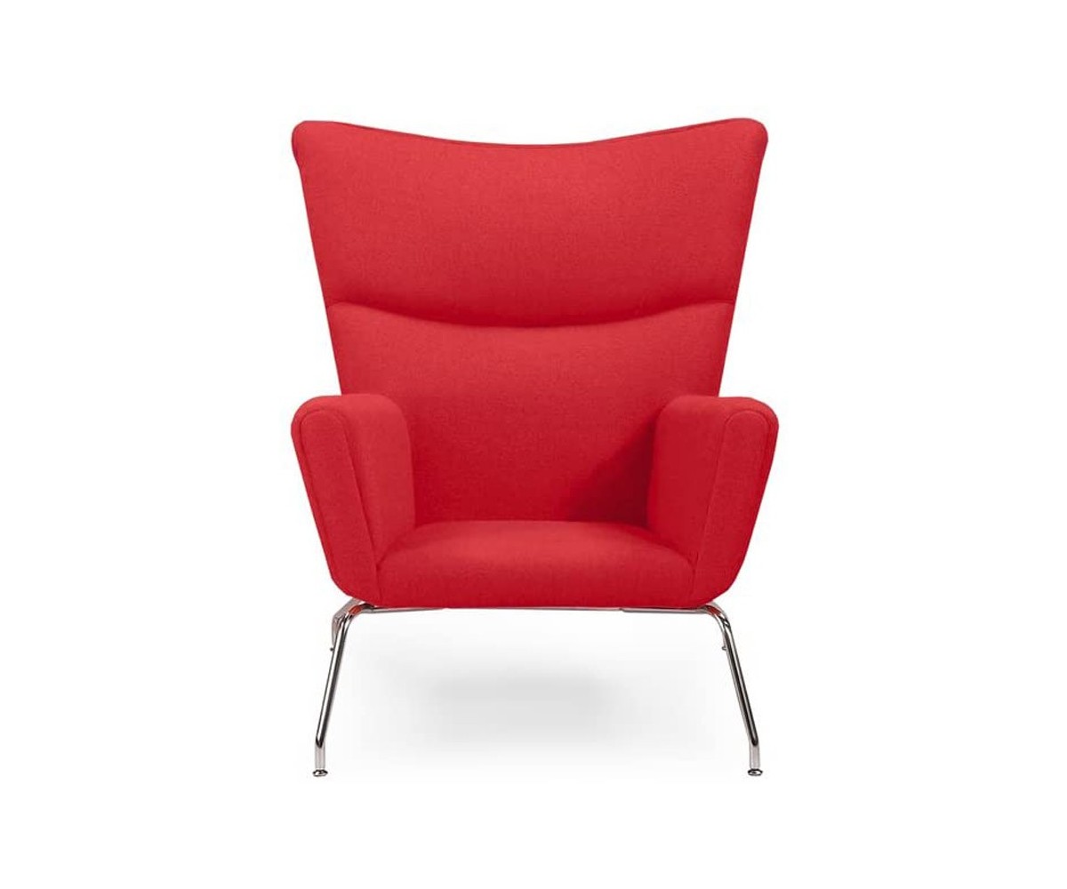 Sillón inspirado en un diseño de Hans J. Wegner. Estructura de acero inoxidable tubular terminación brillo, tapizado en tejido cachemire color rojo. Réplica exacta con materiales originales de máxima calidad.