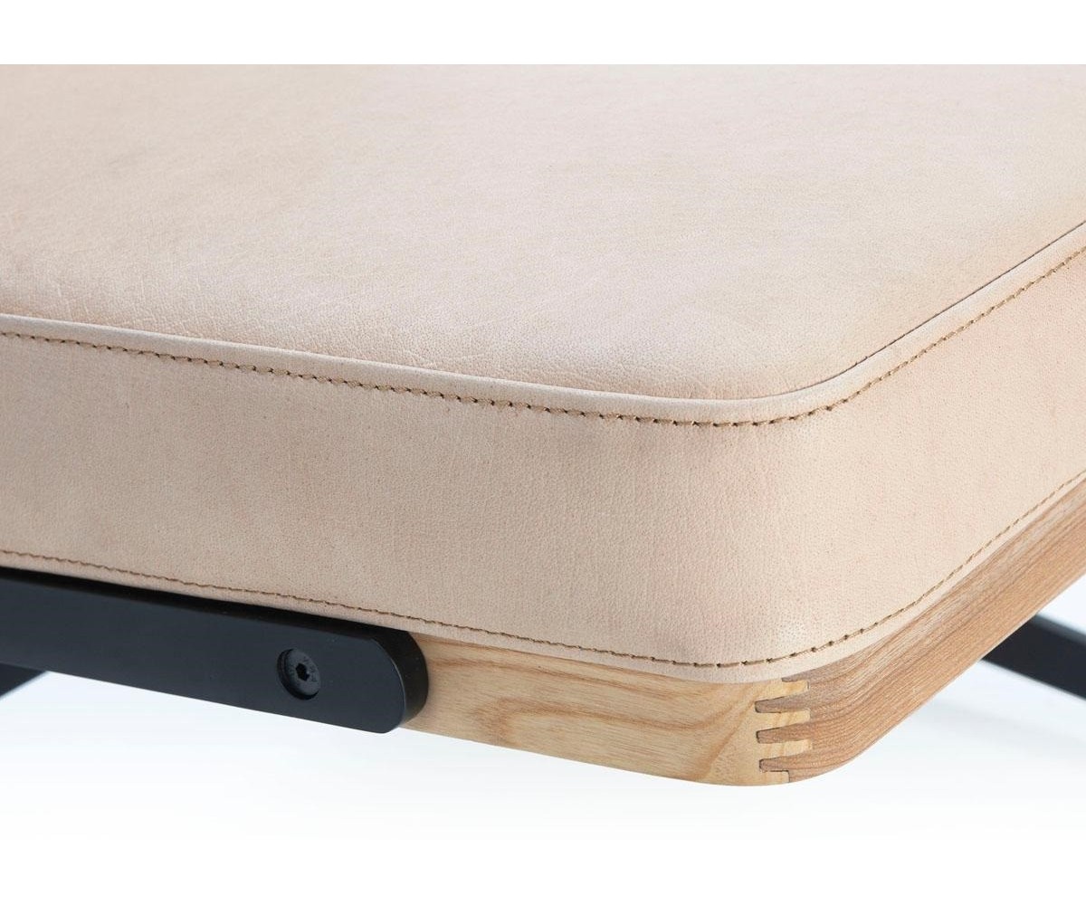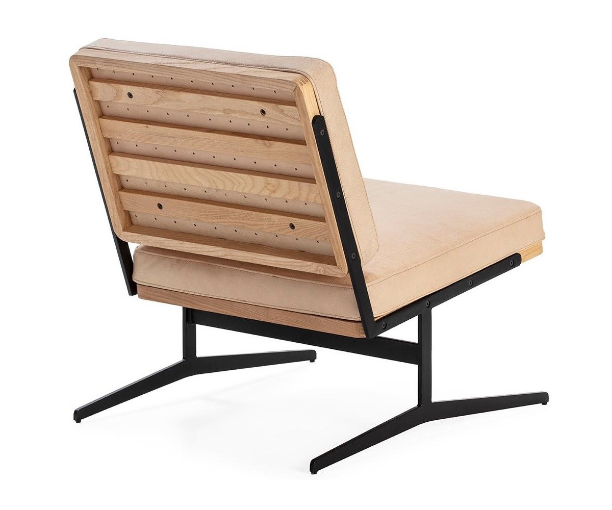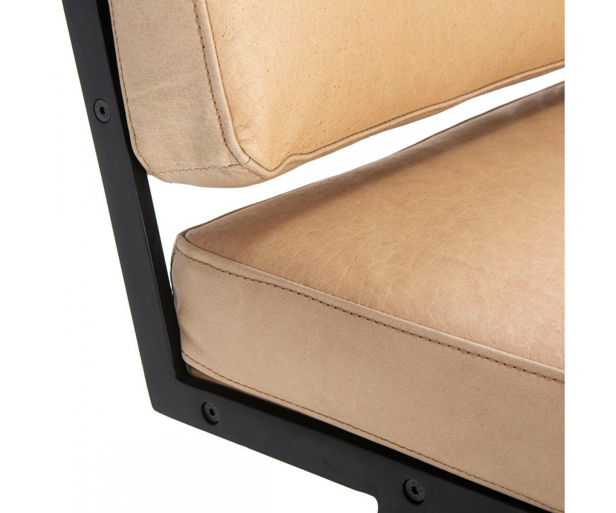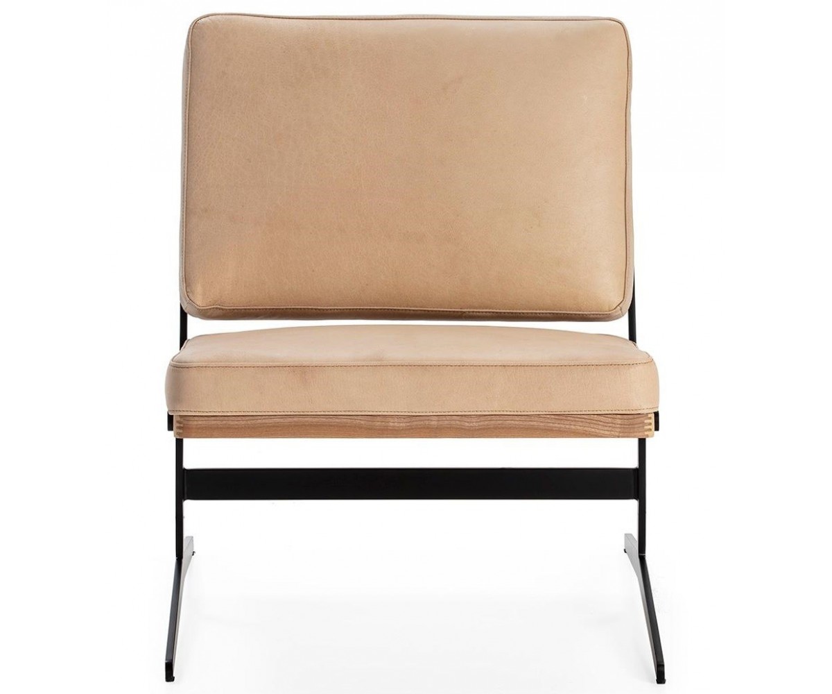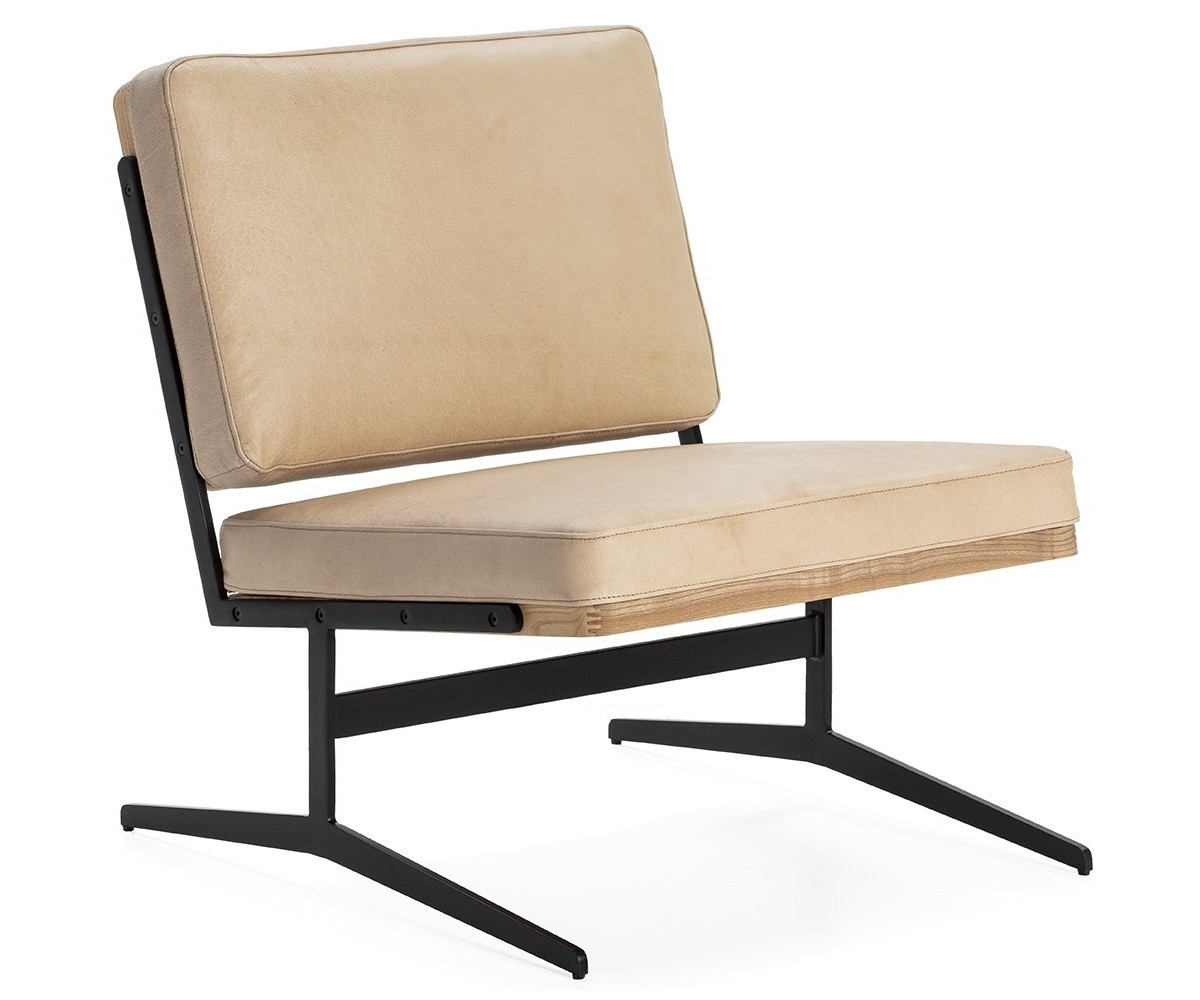 Sillón inspirado en un diseño de David Löhr. Estructura en acero lacado al horno color negro, asiento y respaldo en madera maciza de pino natural. Cojín en asiento y respaldo relleno de poliuretano indeformable y tapizado en piel de máxima calidad color crema. Réplica exacta con materiales originales de máxima calidad.
