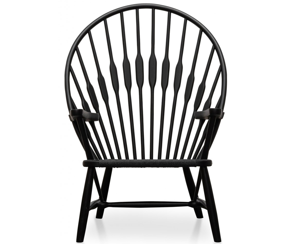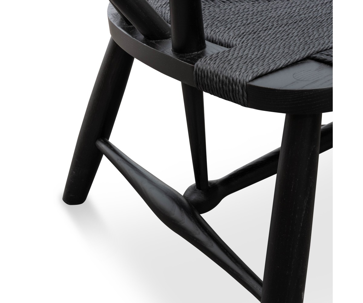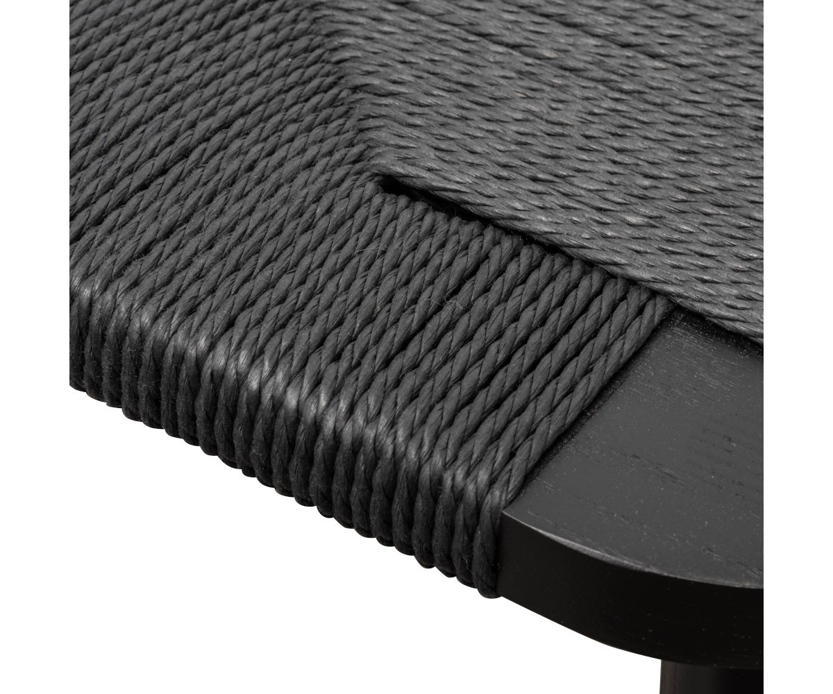 Sillón inspirado en un diseño de Hans J. Wegne. Estructura fabricada en madera de nogal macizo, terminación teñido color negro, asiento en fibra de cuerda trenzada hecho artesanalmente color negro. Réplica exacta con materiales originales de máxima calidad