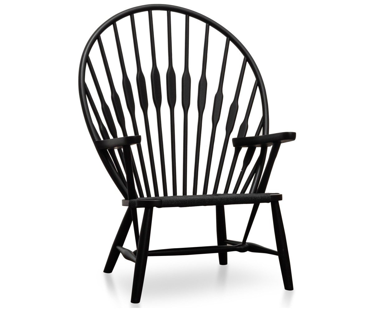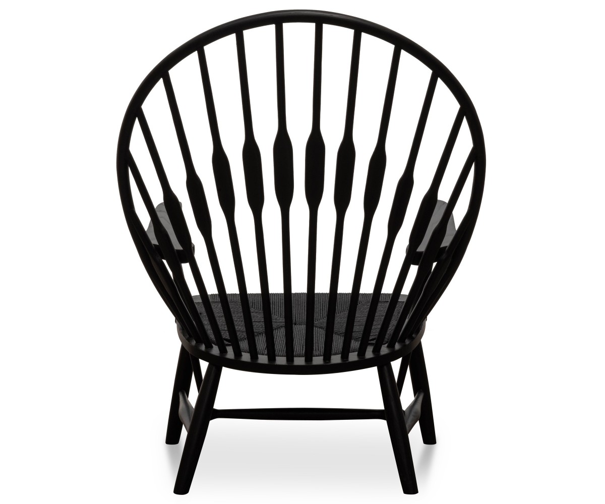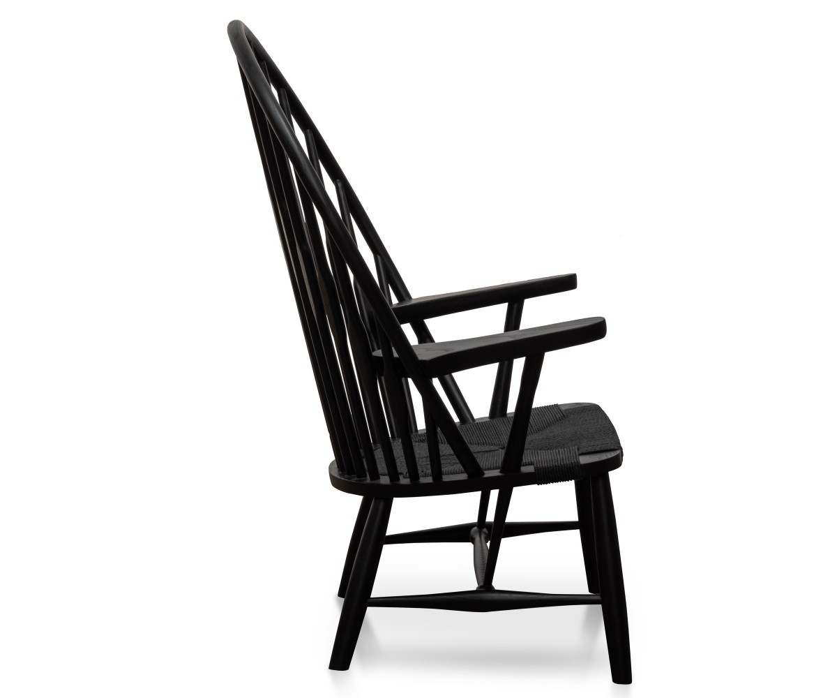 Sillón inspirado en un diseño de Hans J. Wegne. Estructura fabricada en madera de nogal macizo, terminación teñido color negro, asiento en fibra de cuerda trenzada hecho artesanalmente color negro. Réplica exacta con materiales originales de máxima calidad
