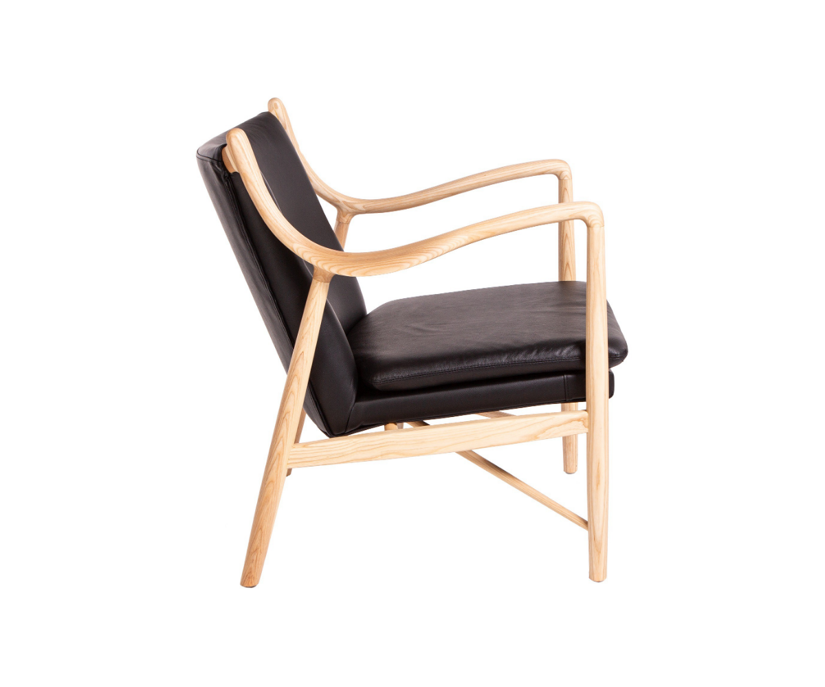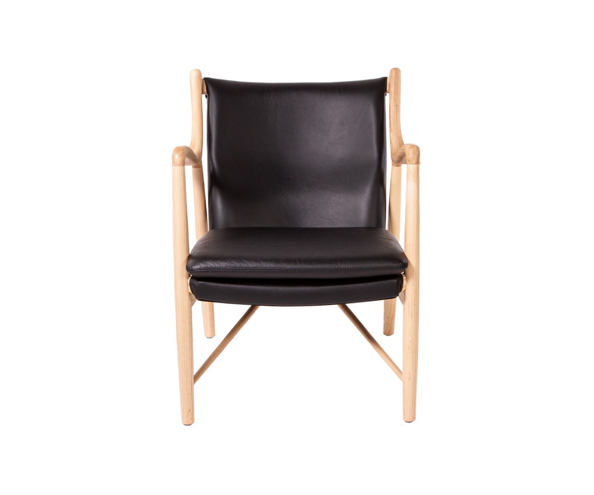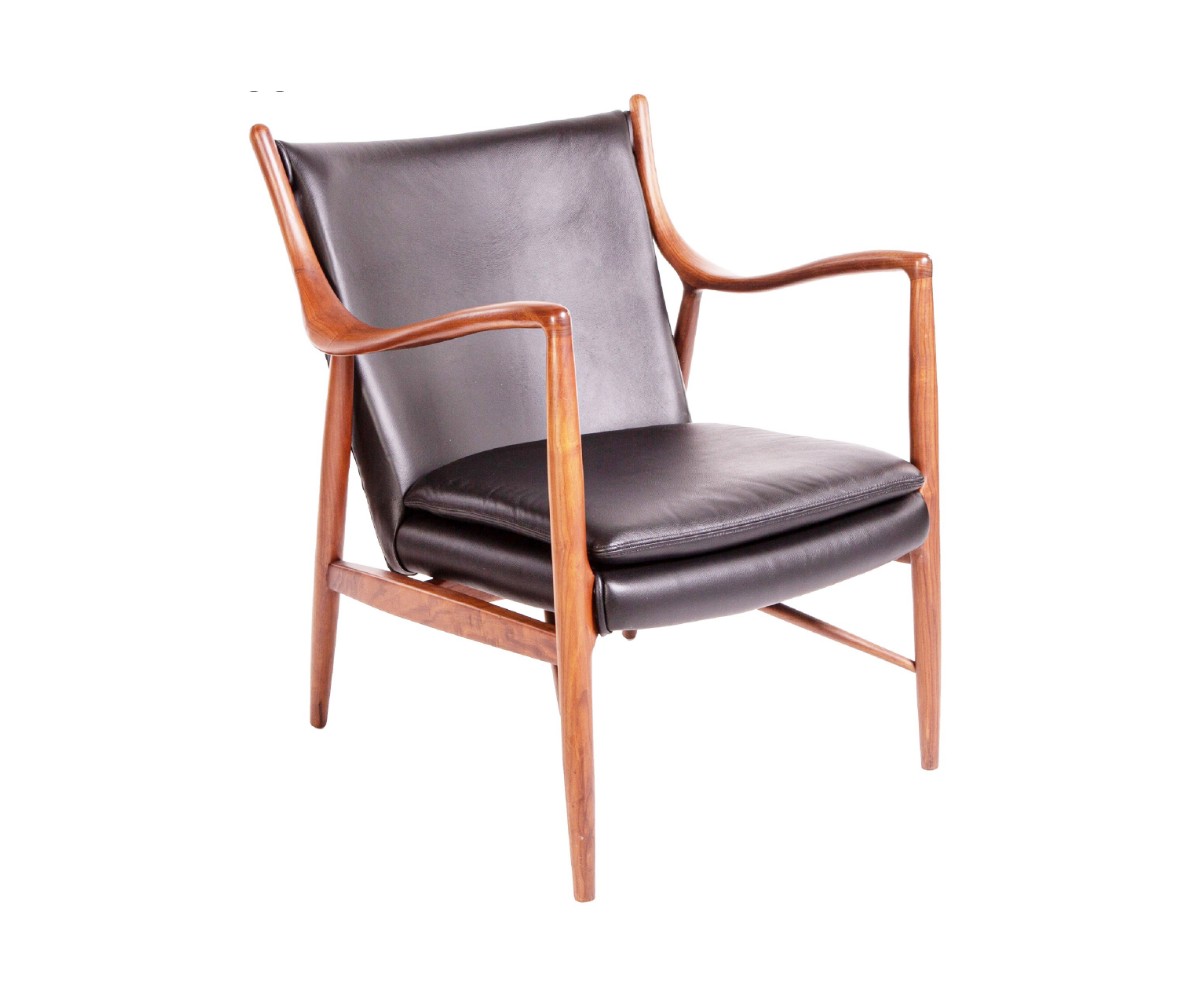 Sillón inspirado en un diseño de Finn Juhl. Tapizado en cuero color negro, relleno: esponja Densidad: 30-20 Kgr./m3. Madera de fresno americano, terminación natural o nogal. No apilable. Réplica exacta con materiales originales de máxima calidad.