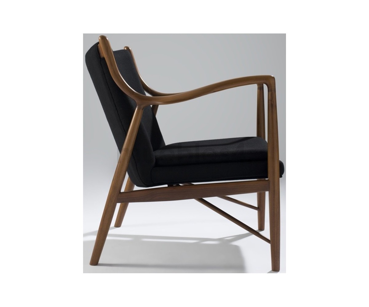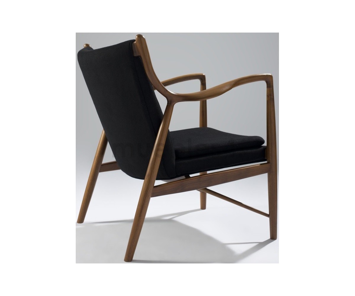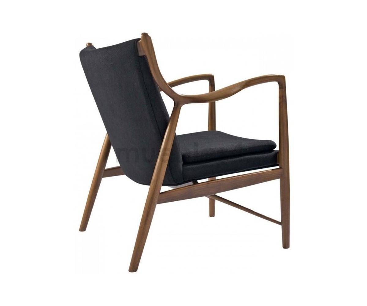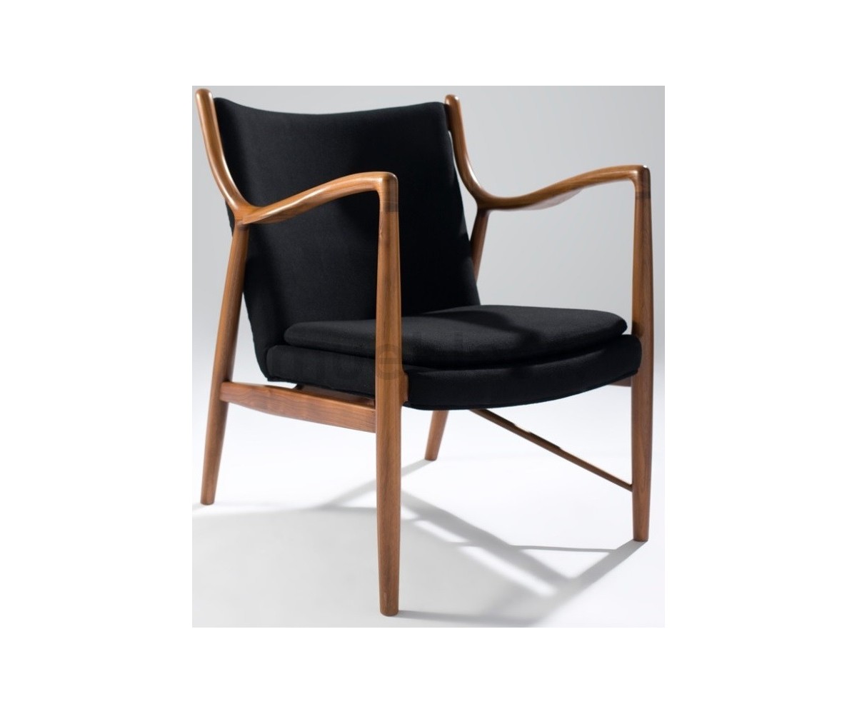 Sillón de 1 plazas inspirado en un diseño de Finn Juhl. Fabricado en madera de nogal americano, tapizado en tejido 75% de lana y 25% viscose, color negro. Réplica exacta con materiales originales de máxima calidad.