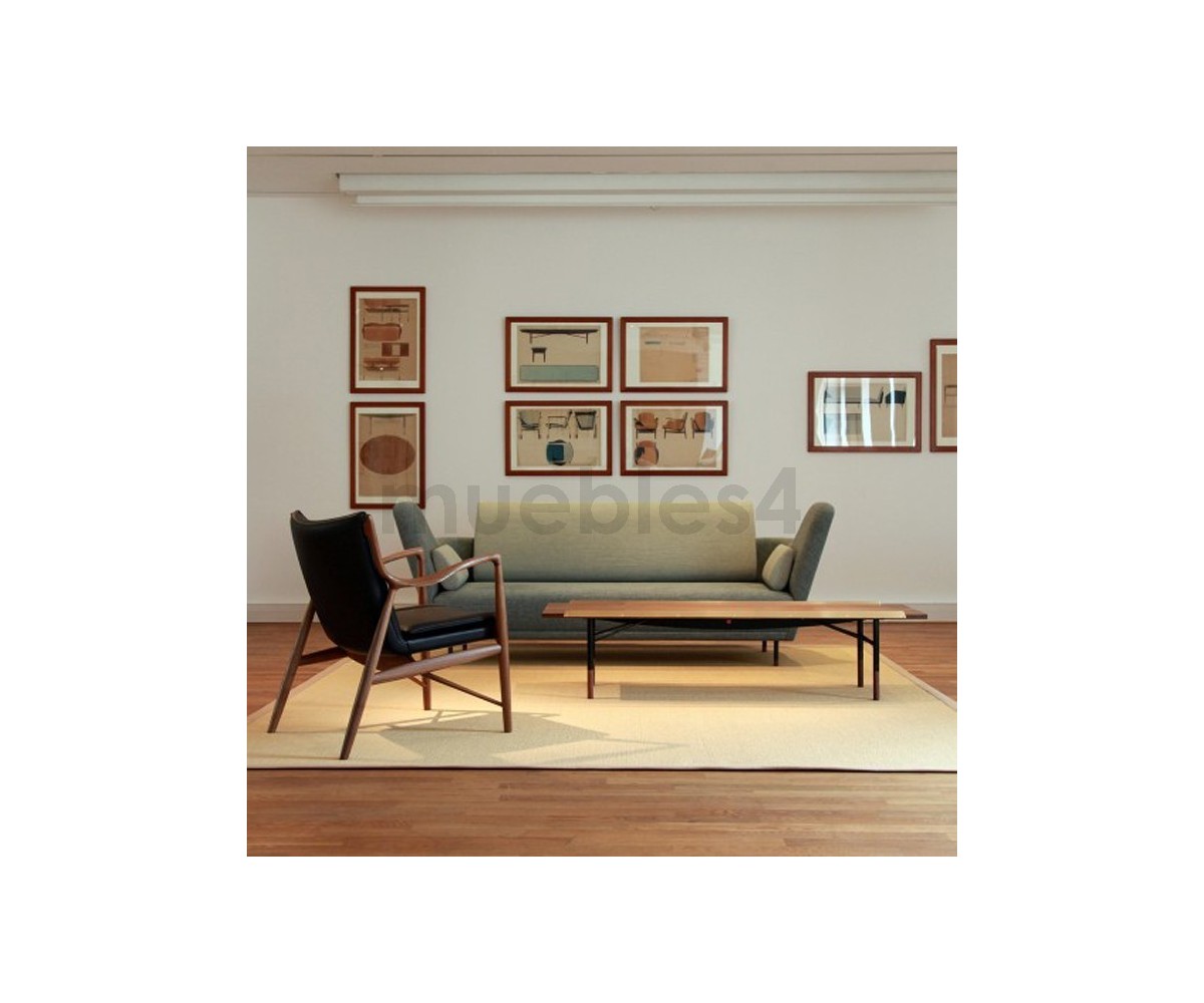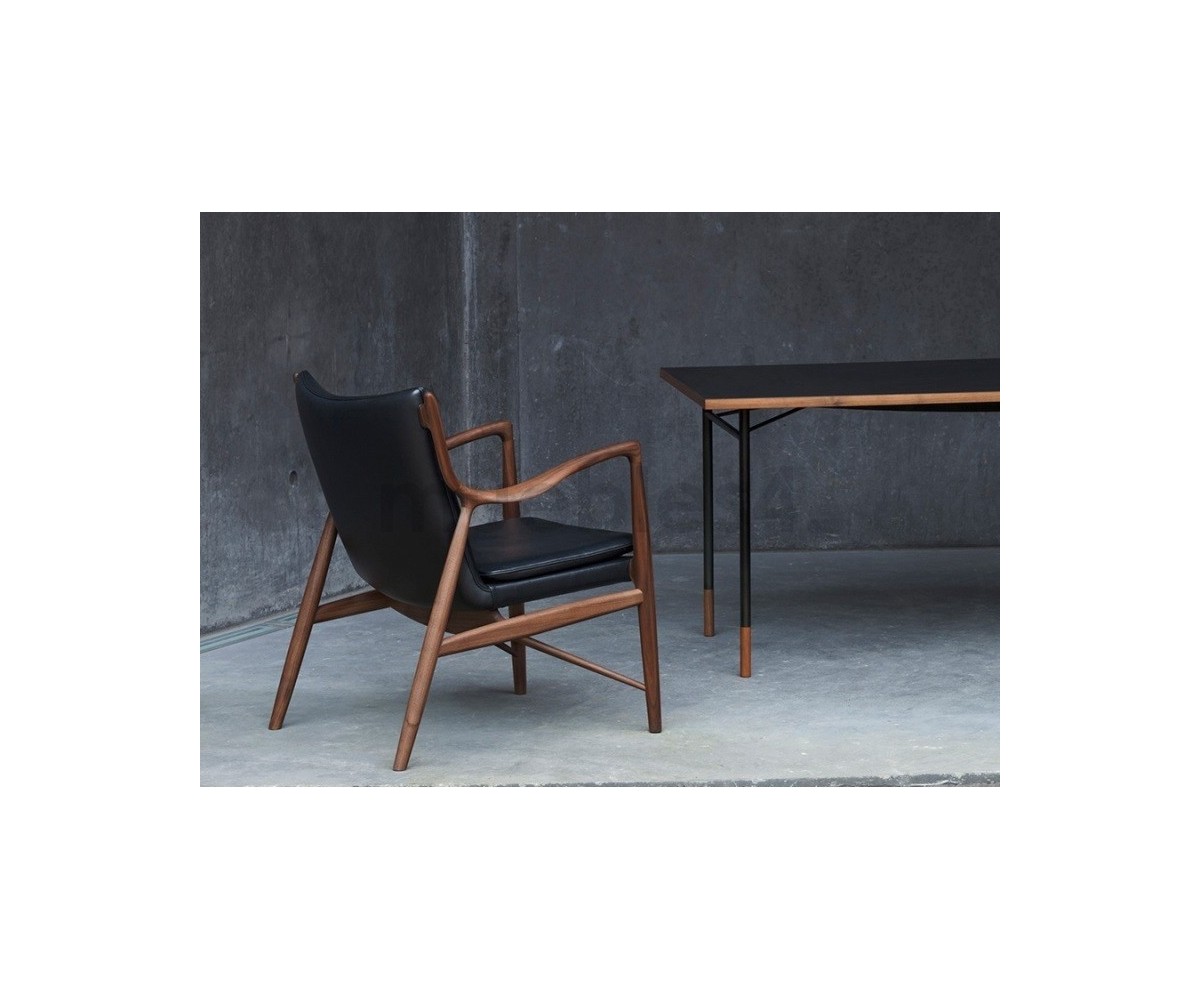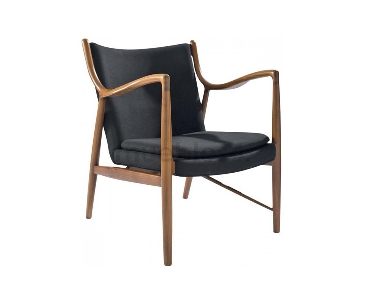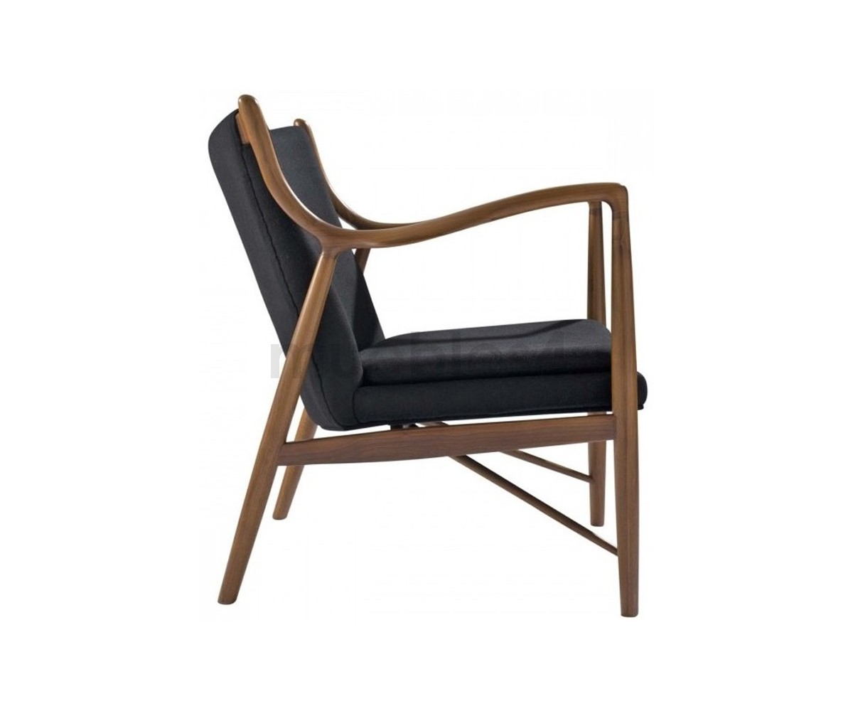 Sillón de 1 plazas inspirado en un diseño de Finn Juhl. Fabricado en madera de nogal americano, tapizado en tejido 75% de lana y 25% viscose, color negro. Réplica exacta con materiales originales de máxima calidad.