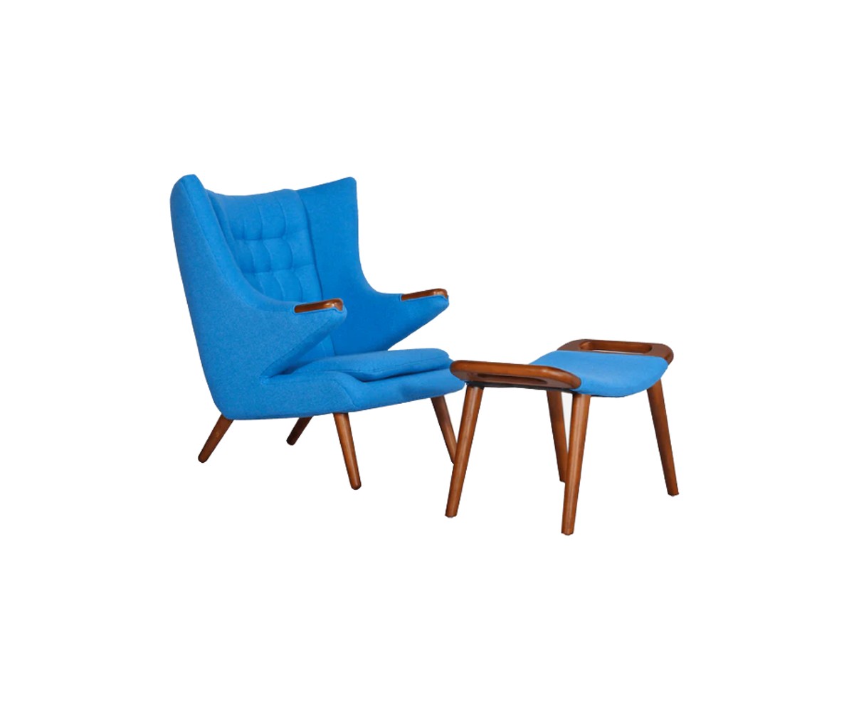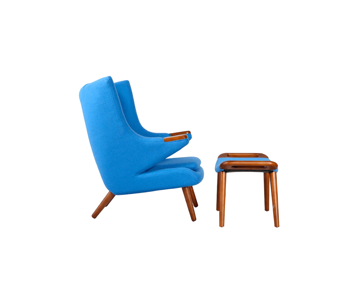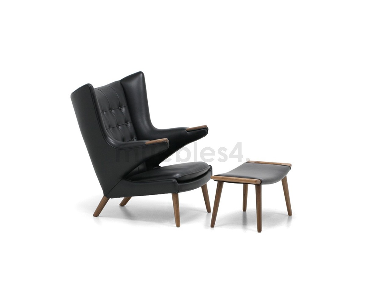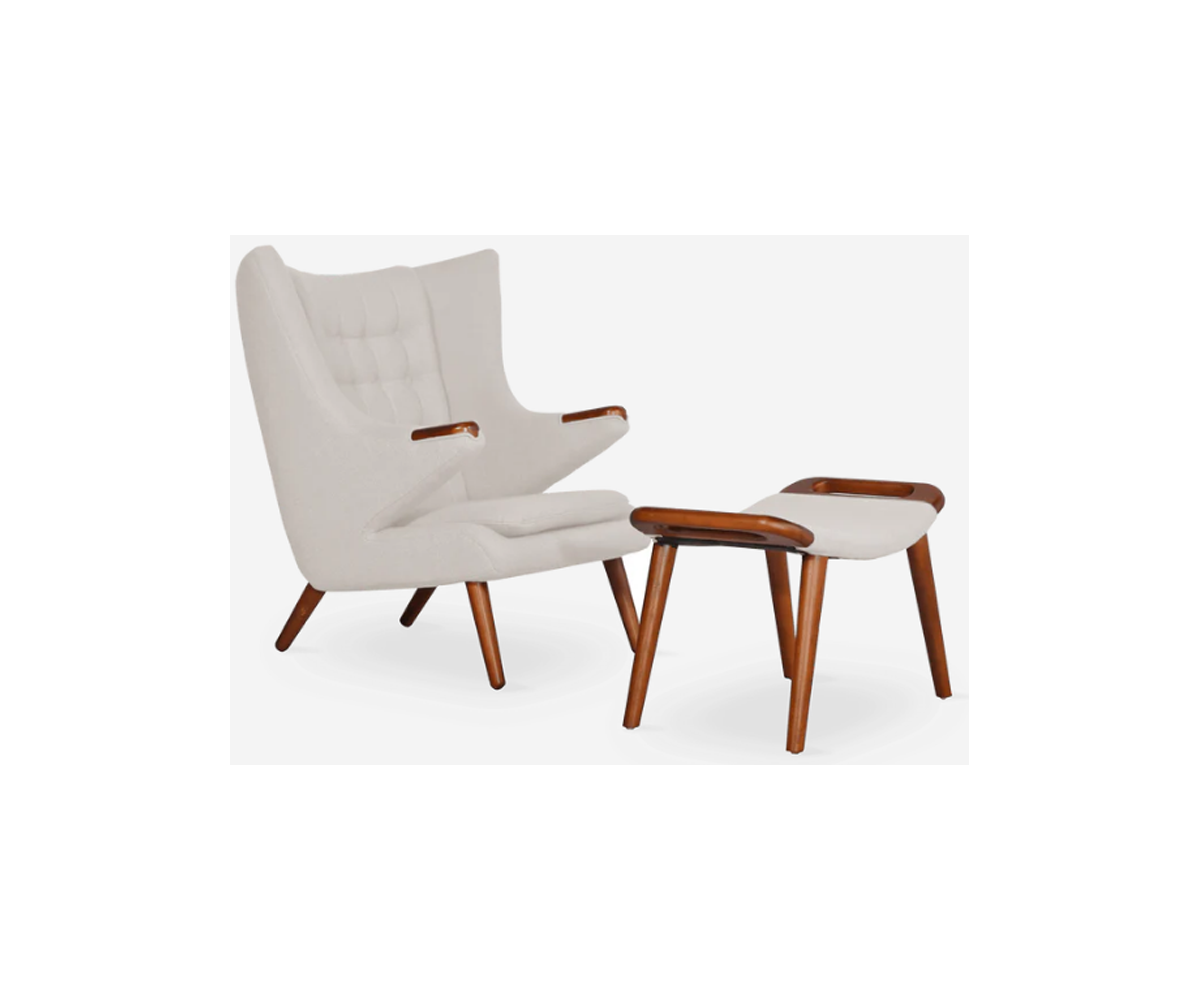 Sillón + ottoman inspirado en un diseño de Hans J. Werner editada por PP Møbler. Estructura fabricada en madera de nogal, recubierto de espuma de polipropileno de alta densidad, tapizado en tela tela Standard Exclusive Coda. El marco de madera maciza está fuertemente unido y moldeado para formar una base sólida para el trabajo integral de tapicería tradicional. Todos los materiales empleados en el sillón son naturales y han sido cuidadosamente seleccionados. Réplica exacta con materiales originales de máxima calidad.