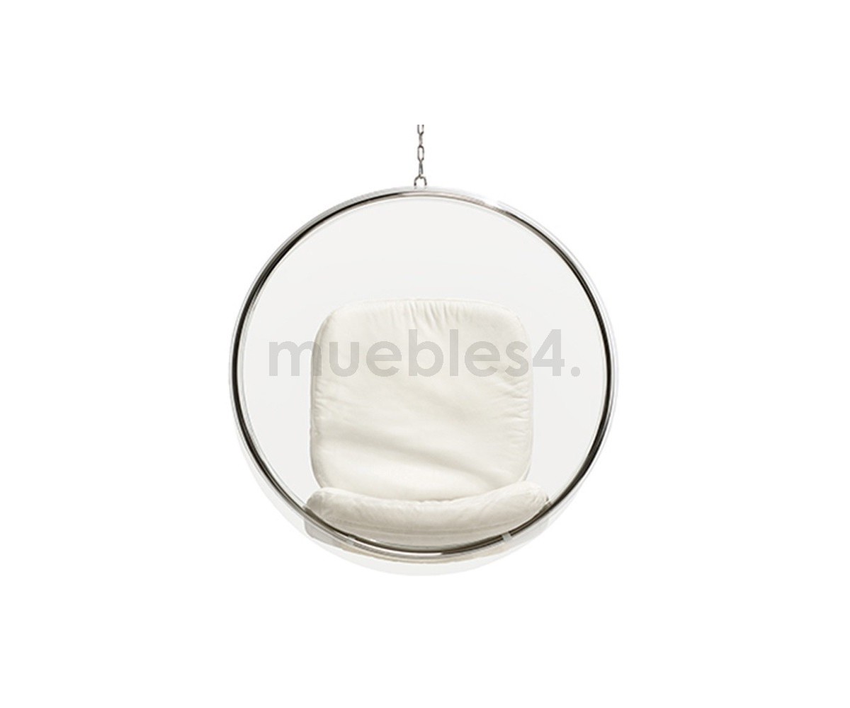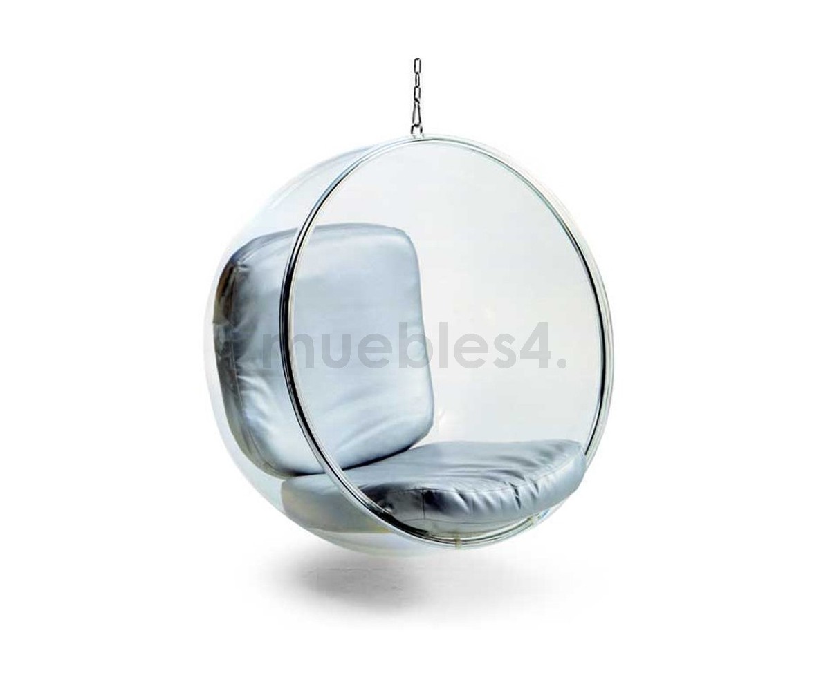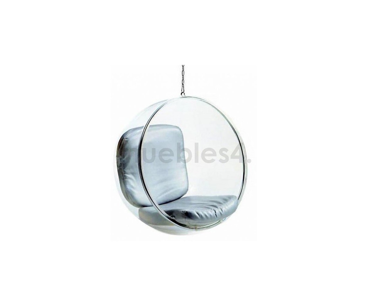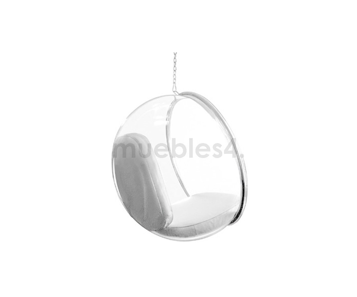 Sillón Finlandés colgante inspirado en un diseño de Eero Aarnio. Esfera transparente de vidrio acrílico y marco tubular en acero con un asiento en su interior, diseñada para ser colgada del techo. Cojines color blanco o gris, cadena acero de largo 2 metros. Se fabrica proyectando aire a una hoja de acrílico caliente, por lo que no hay necesidad de molde y la forma siempre sale igual, siguiendo las leyes de la naturaleza, como una burbuja de jabón. Modelo insonorizado, impresiona a quien está dentro, el efecto de aislamiento acústico tiene un fuerte impacto especialmente cuando estás en lugares concurridos. Réplica exacta con materiales originales de máxima calidad.
