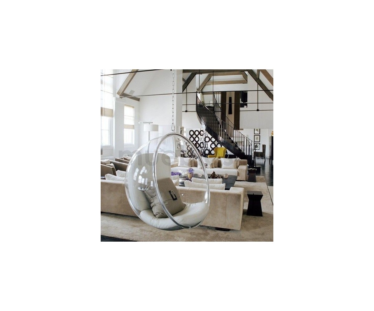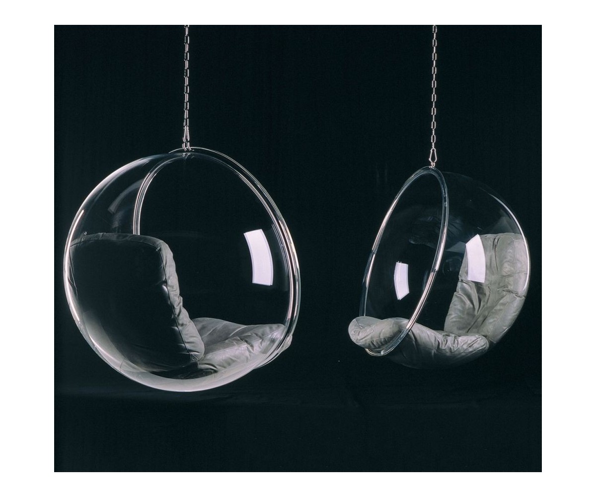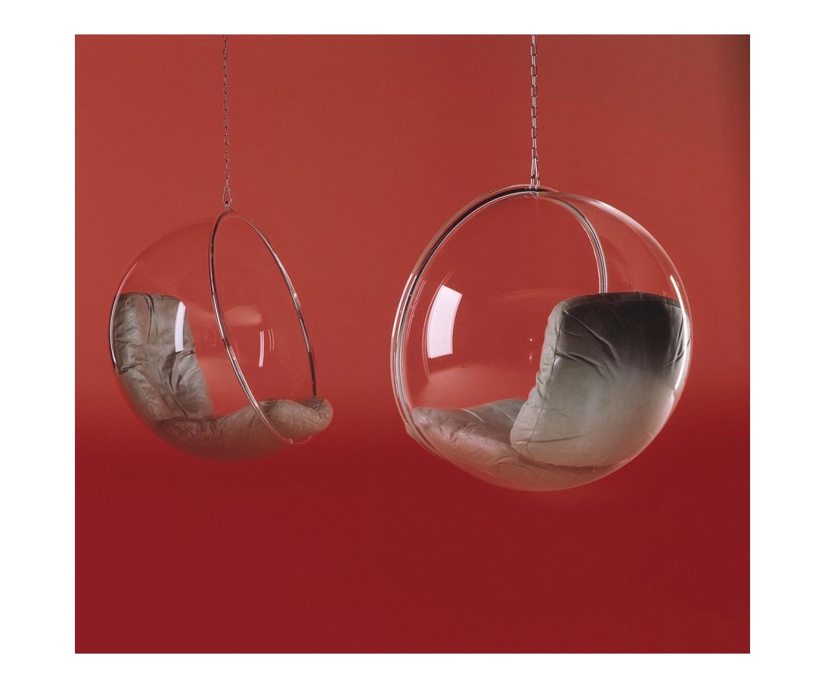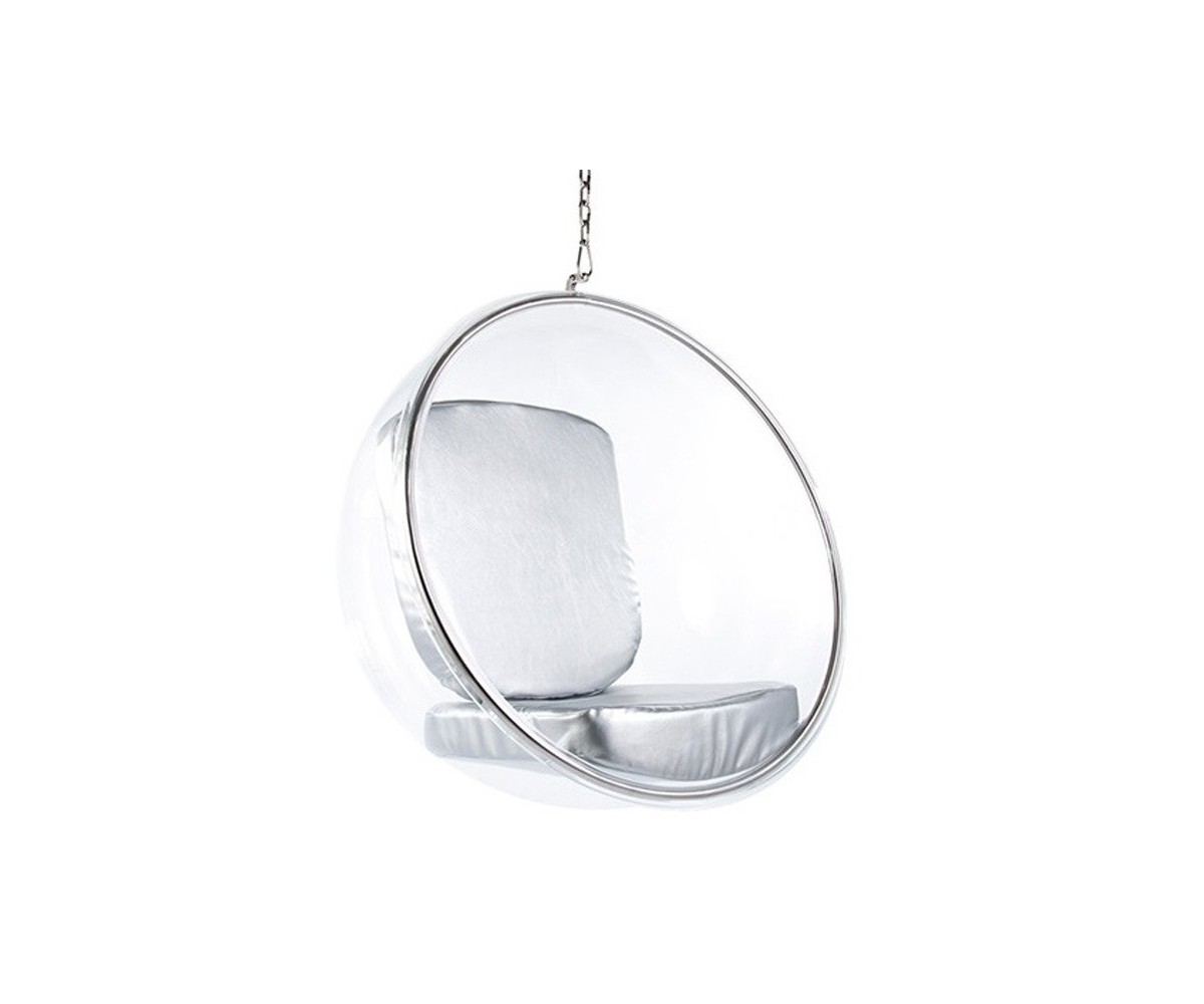 Sillón Finlandés colgante inspirado en un diseño de Eero Aarnio. Esfera transparente de vidrio acrílico y marco tubular en acero con un asiento en su interior, diseñada para ser colgada del techo. Cojines color blanco o gris, cadena acero de largo 2 metros. Se fabrica proyectando aire a una hoja de acrílico caliente, por lo que no hay necesidad de molde y la forma siempre sale igual, siguiendo las leyes de la naturaleza, como una burbuja de jabón. Modelo insonorizado, impresiona a quien está dentro, el efecto de aislamiento acústico tiene un fuerte impacto especialmente cuando estás en lugares concurridos. Réplica exacta con materiales originales de máxima calidad.