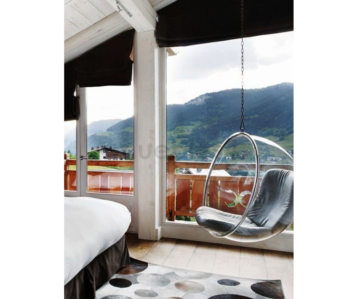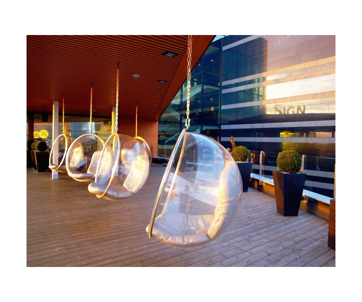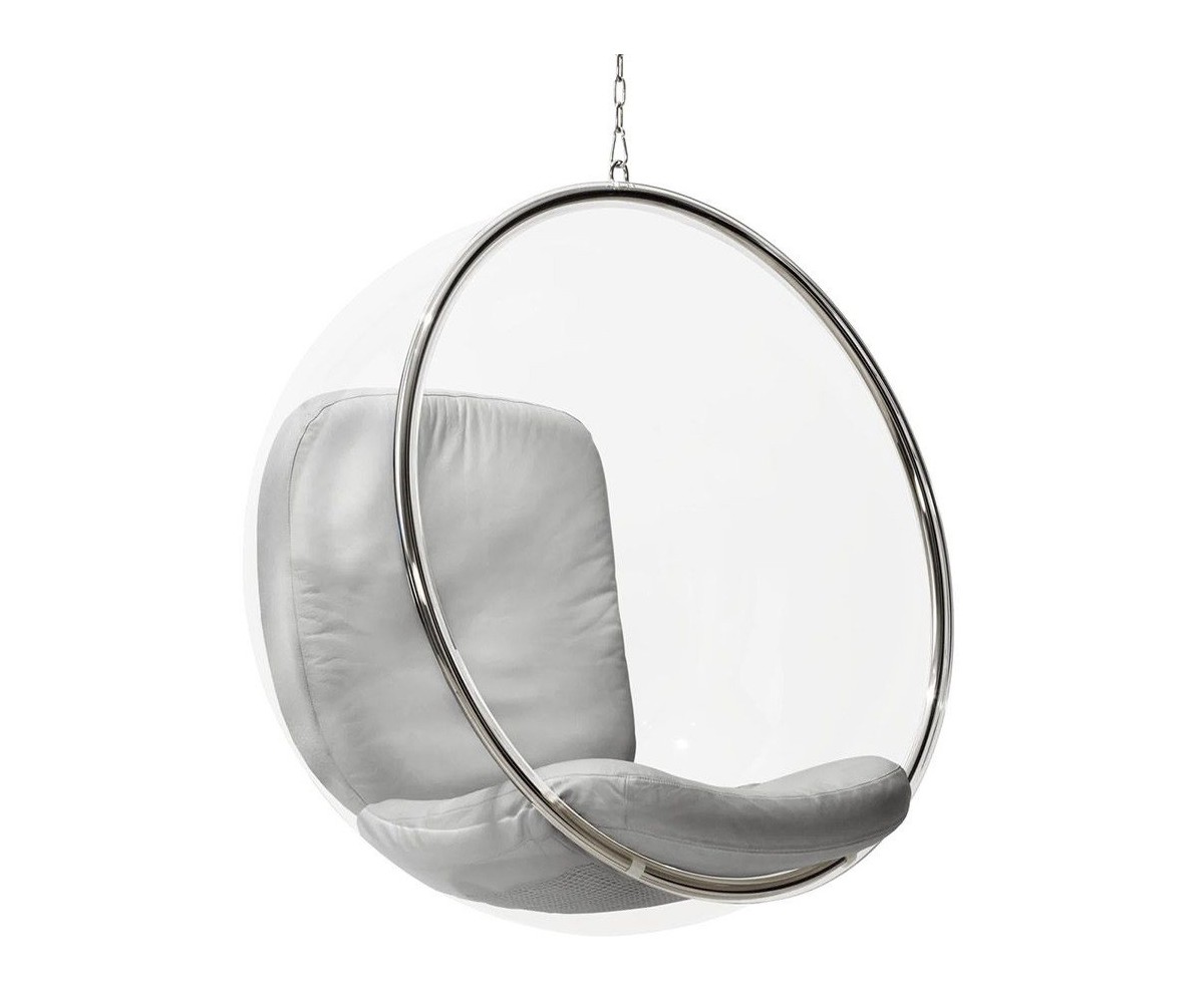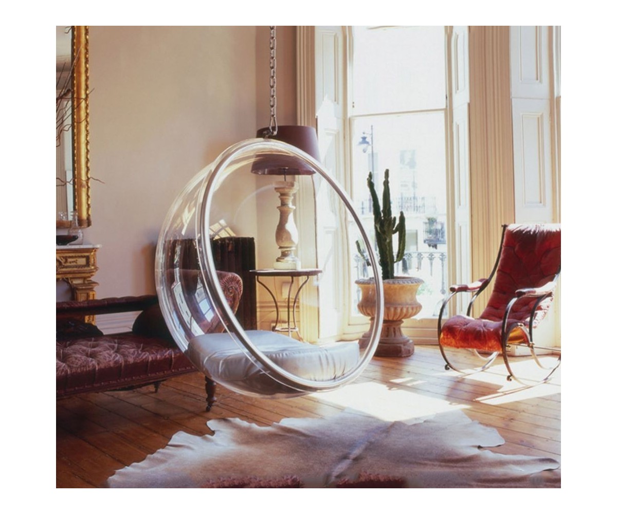 Sillón Finlandés colgante inspirado en un diseño de Eero Aarnio. Esfera transparente de vidrio acrílico y marco tubular en acero con un asiento en su interior, diseñada para ser colgada del techo. Cojines color blanco o gris, cadena acero de largo 2 metros. Se fabrica proyectando aire a una hoja de acrílico caliente, por lo que no hay necesidad de molde y la forma siempre sale igual, siguiendo las leyes de la naturaleza, como una burbuja de jabón. Modelo insonorizado, impresiona a quien está dentro, el efecto de aislamiento acústico tiene un fuerte impacto especialmente cuando estás en lugares concurridos. Réplica exacta con materiales originales de máxima calidad.