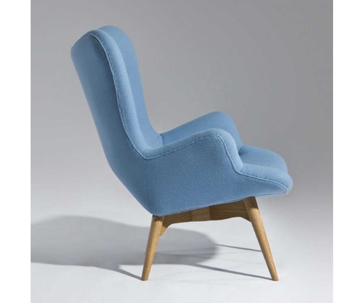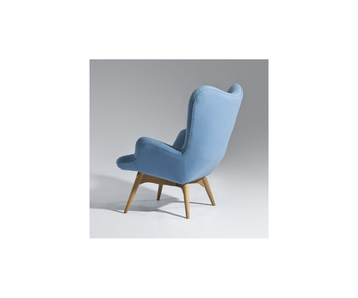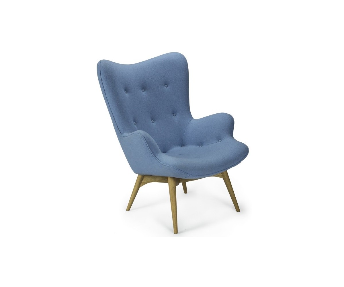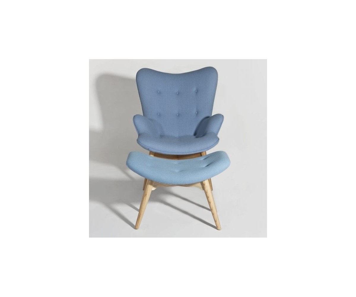 Sillón inspirado en un diseño de Grant Featherston. Hecho para una relajación total, gracias también a su otomana. Está fabricado con una cáscara de fibra de vidrio de calidad premium que esculpe el cuerpo, la tapicería de lana de cashmere y las patas de madera maciza de nogal claro americano. Gran atención a los detalles de las costuras de los botones. Réplica exacta con materiales originales de máxima calidad.
