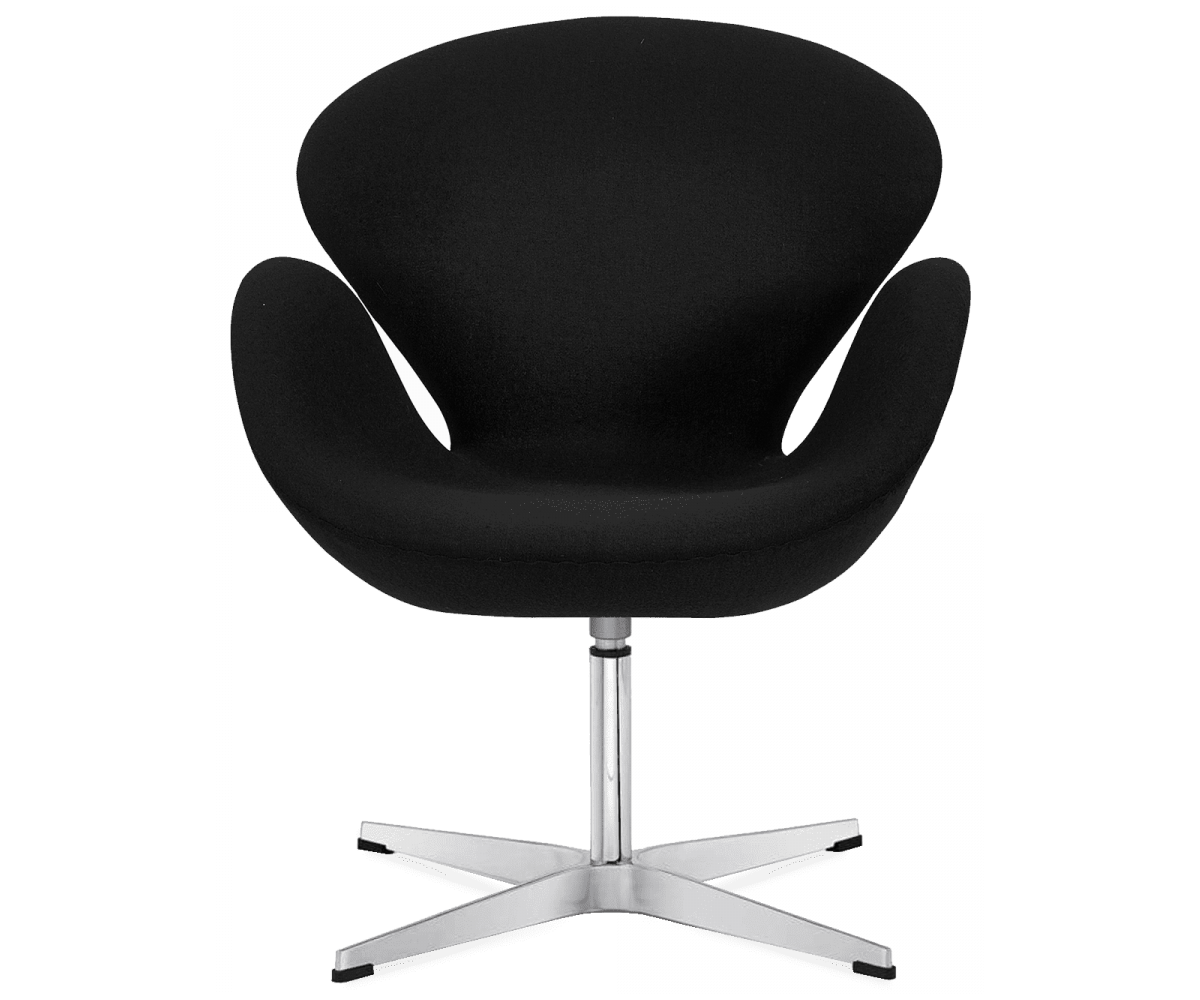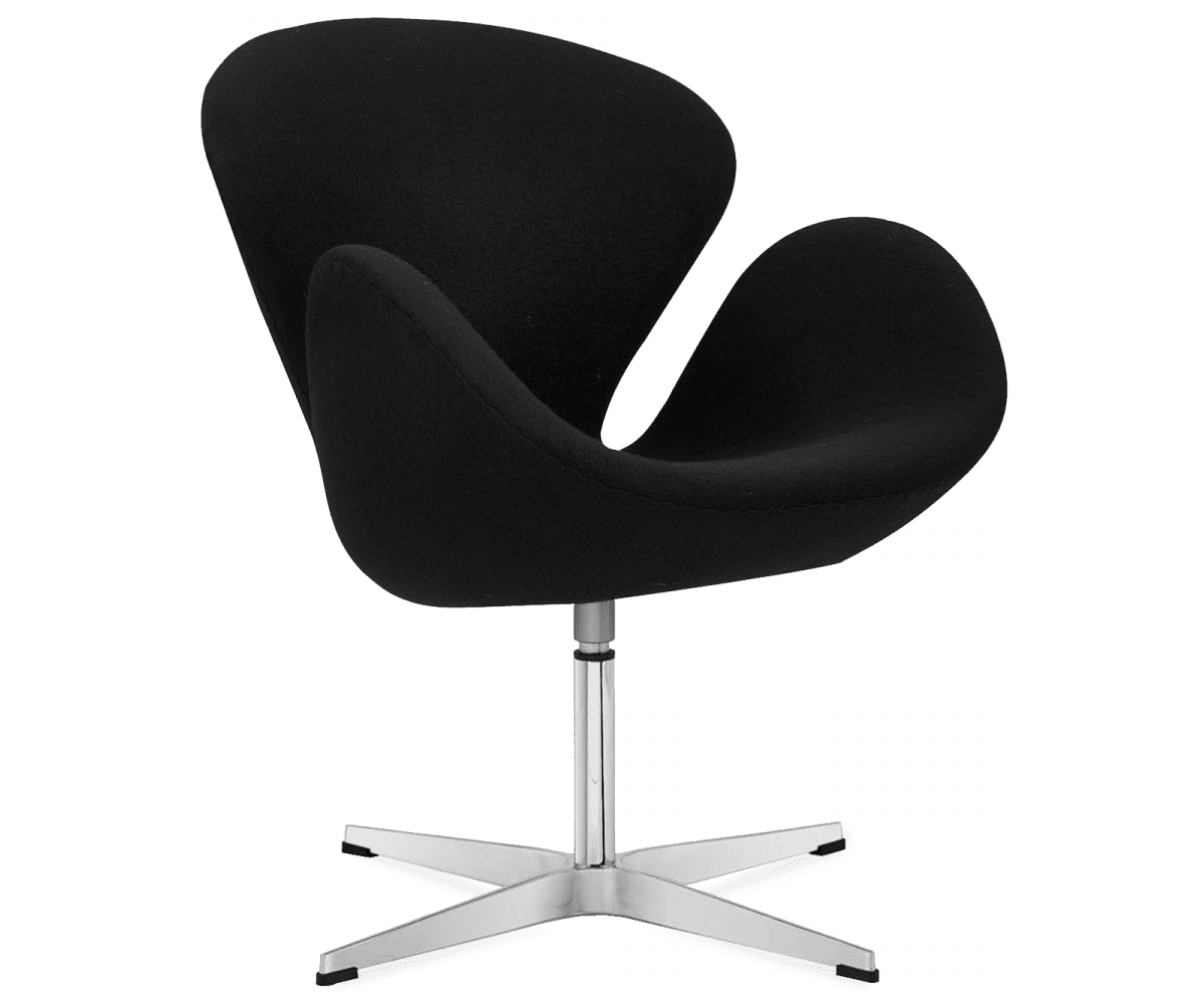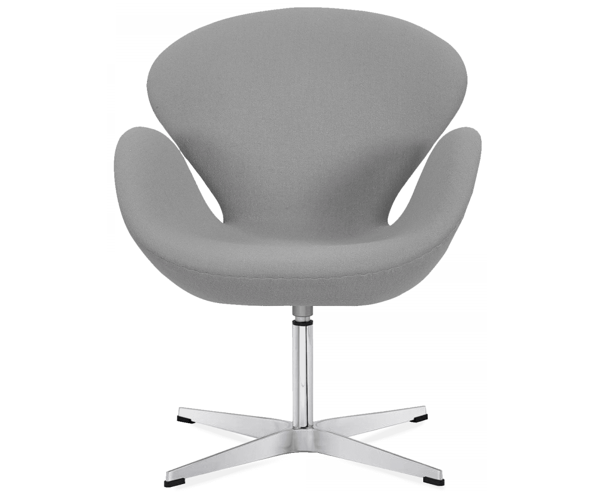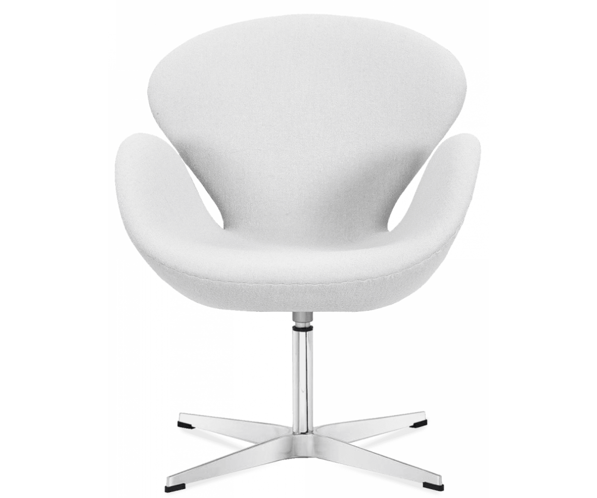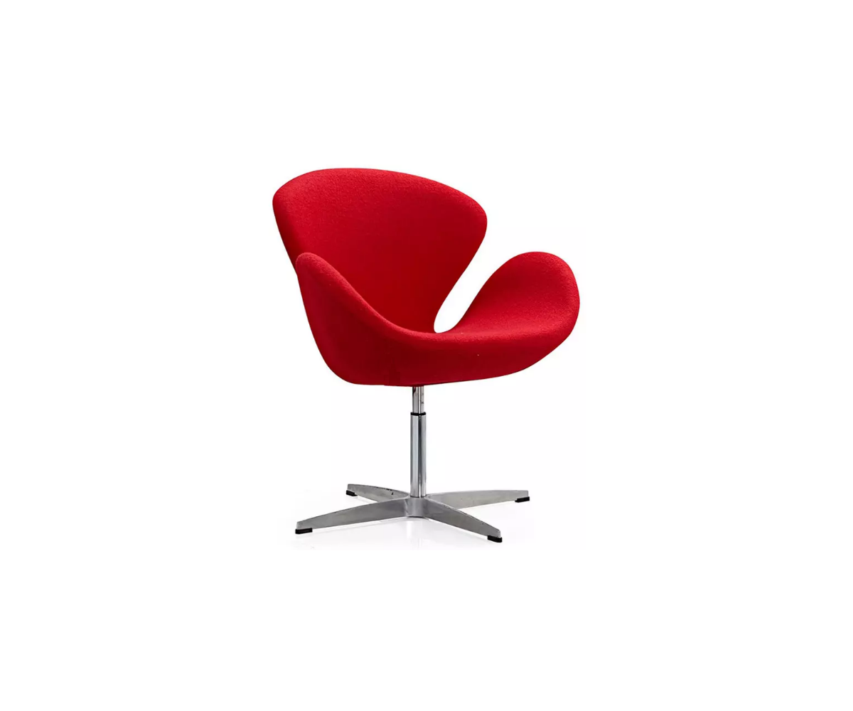 El sillón Cisne fué diseñado por Arne Jacobsen en 1958 para el vestíbulo y las áreas de descanso del SAS Royal Hotel en Copenhague. Es uno de los sillones más populares dentro de la colección de sillas de Fritz Hansen. Base de aluminio y acero satinado con cuerpo central tubular y cuatro aspas. Carcasa de acero con espuma inyectada de poliuretano y fibra de vidrio, tapizado en 100% LANA CASHMERE terminación color blanco, rojo, gris o negro, para otros colores consultar disponibilidad. También está disponible el sillón de respaldo algo (EGG) y la mesa centro con la misma base. Réplica exacta con materiales originales de máxima calidad.