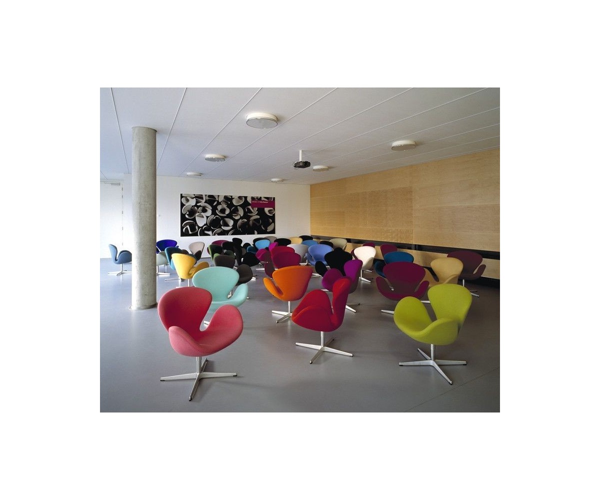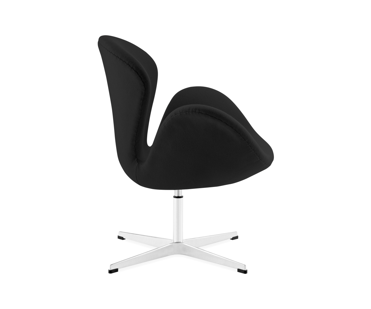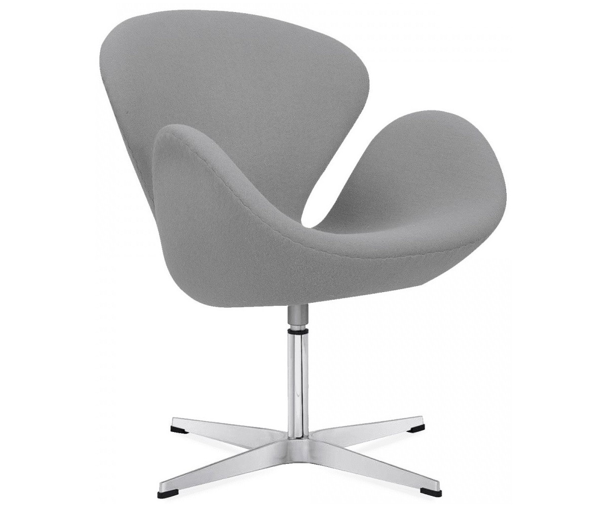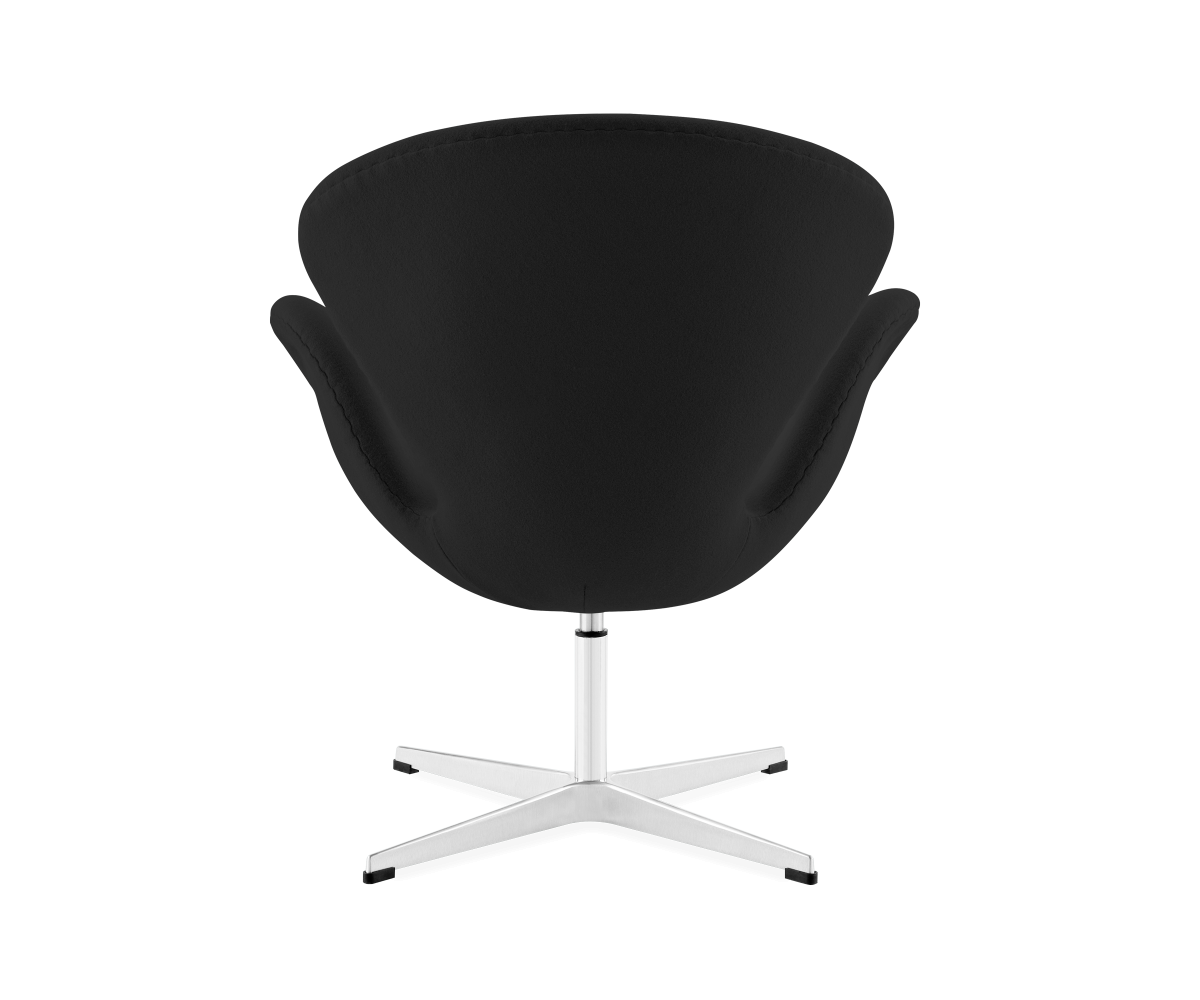 El sillón Cisne fué diseñado por Arne Jacobsen en 1958 para el vestíbulo y las áreas de descanso del SAS Royal Hotel en Copenhague. Es uno de los sillones más populares dentro de la colección de sillas de Fritz Hansen. Base de aluminio y acero satinado con cuerpo central tubular y cuatro aspas. Carcasa de acero con espuma inyectada de poliuretano y fibra de vidrio, tapizado en 100% LANA CASHMERE terminación color blanco, rojo, gris o negro, para otros colores consultar disponibilidad. También está disponible el sillón de respaldo algo (EGG) y la mesa centro con la misma base. Réplica exacta con materiales originales de máxima calidad.