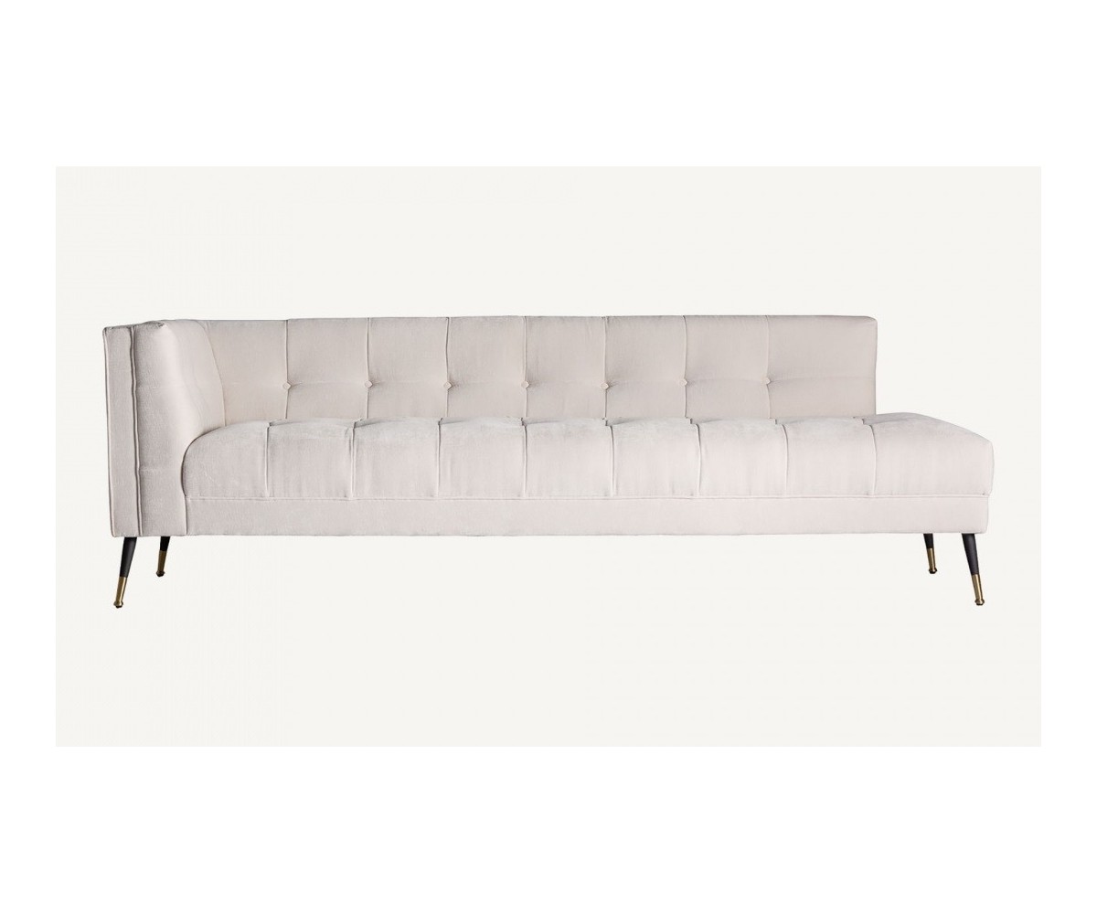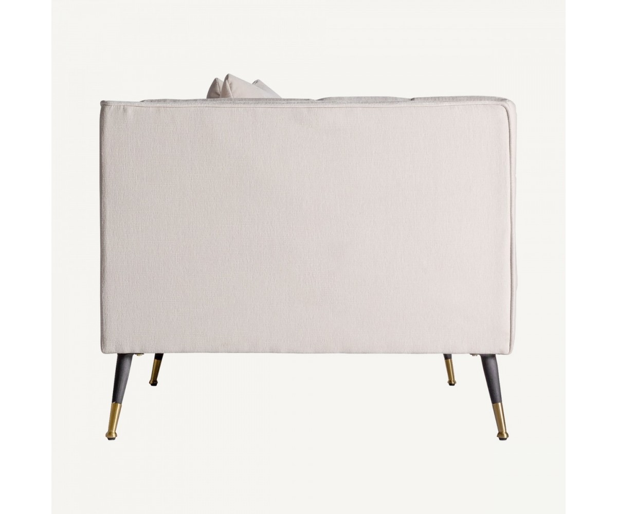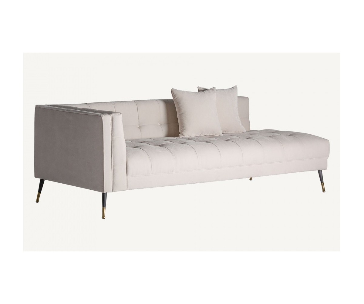Sofá Lounge inspirado en un diseño de Eichholtz. Estructura de roble macizo de una pieza, relleno de polipropileno indeformable. Tapizado en tejido color blanco 100% poliéster, desenfundable. Patas cónica en acero lacado en negro y dorado.