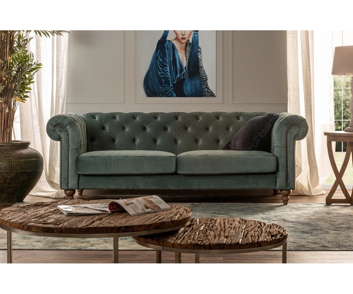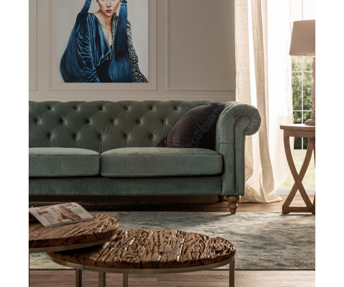 Sofá inspirado en un diseño de Fleming & Howland. Su origen histórico documentado, data de la Inglaterra de principios del siglo XIX, se emplearon para ambientar los exclusivos y elitistas clubes sociales londinenses, donde sólo se permitía la entrada a socios del género masculino. Con el tiempo, pasó a los salones de las casas británicas de la alta sociedad y posteriormente se popularizó hasta convertirse en un icono de la decoración británica y el sofá clásico inglés por excelencia.