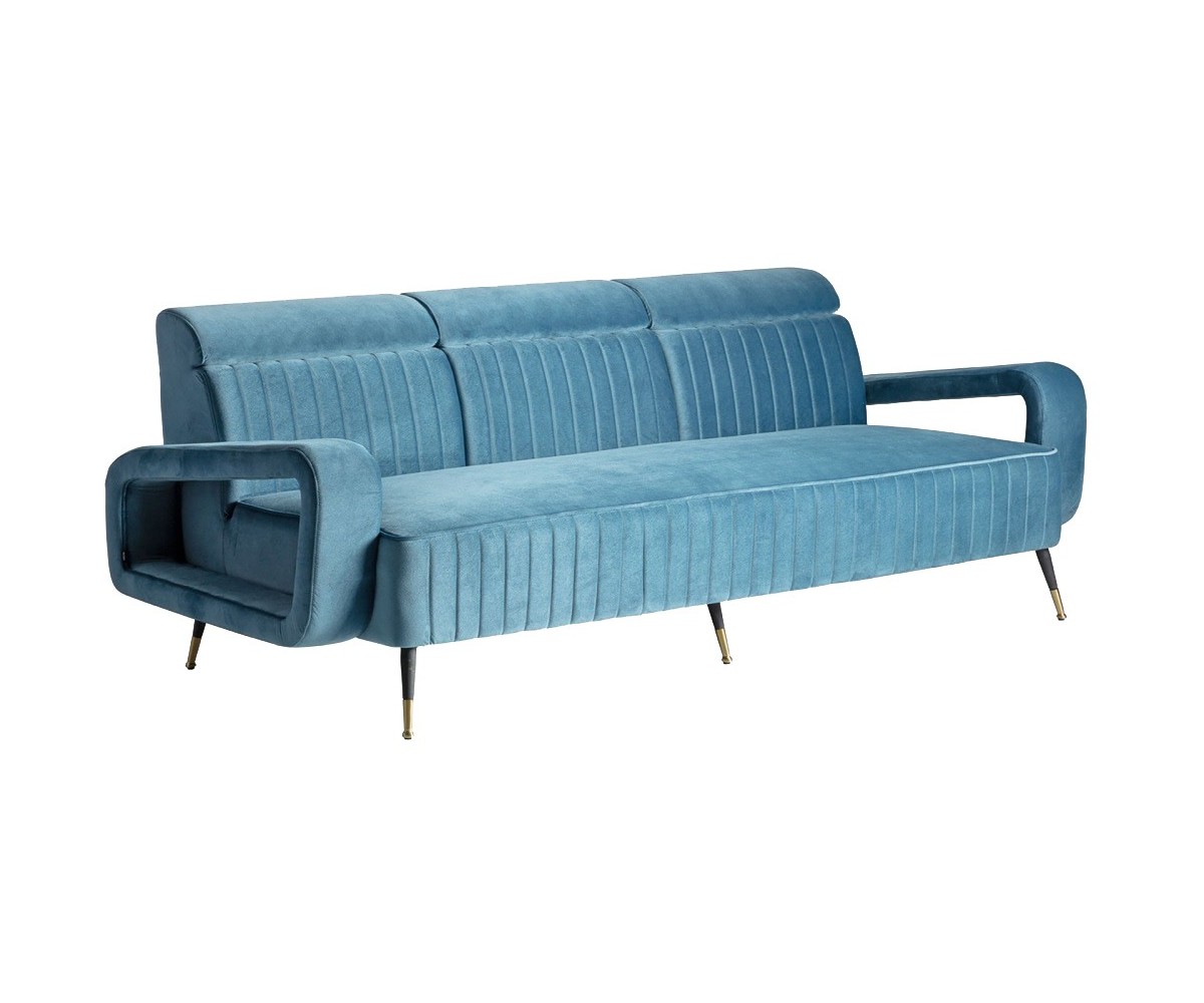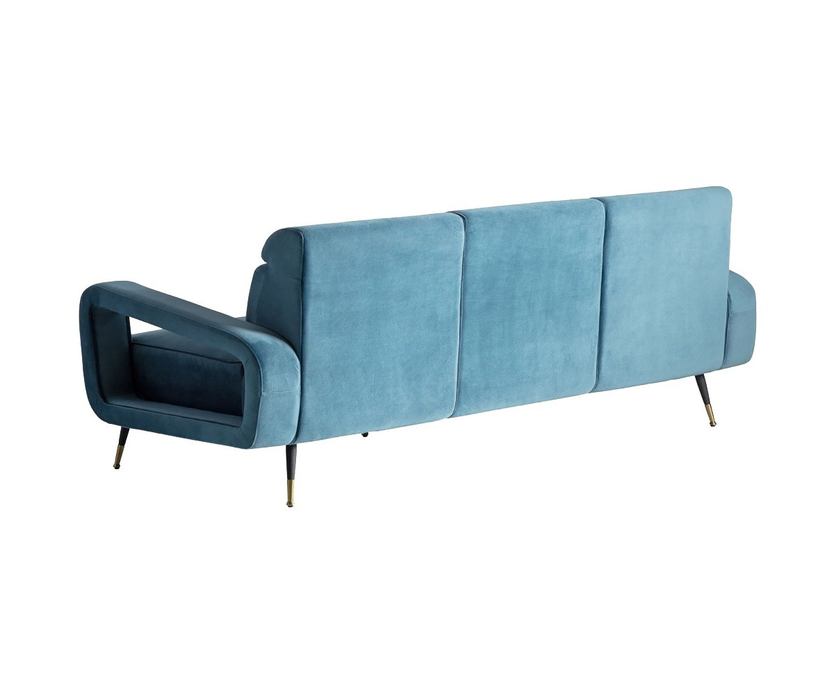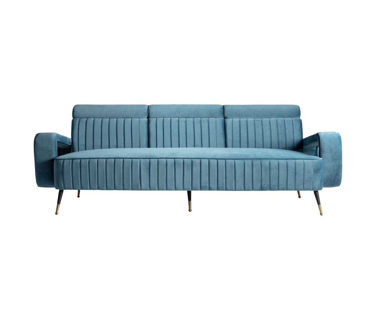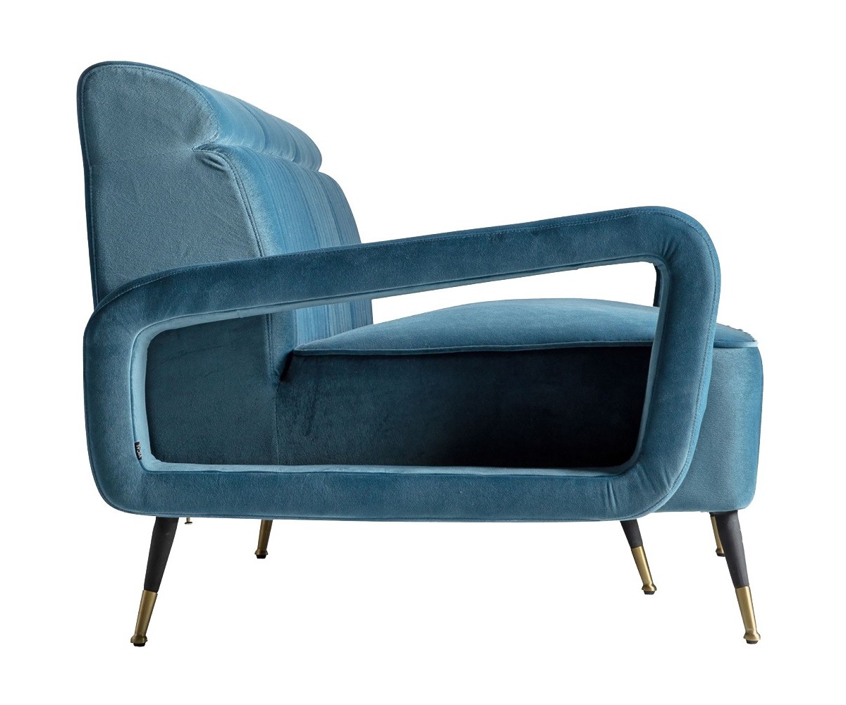 Sofá años 50, inspirado en un diseño de Fleming & Howland. Estructura de roble macizo de una pieza, relleno de polipropileno indeformable. Tapizado en tejido color turquesa 100% poliéster, terciopelo. Producto desmontable. Patas en acero cónico en negro y dorado.