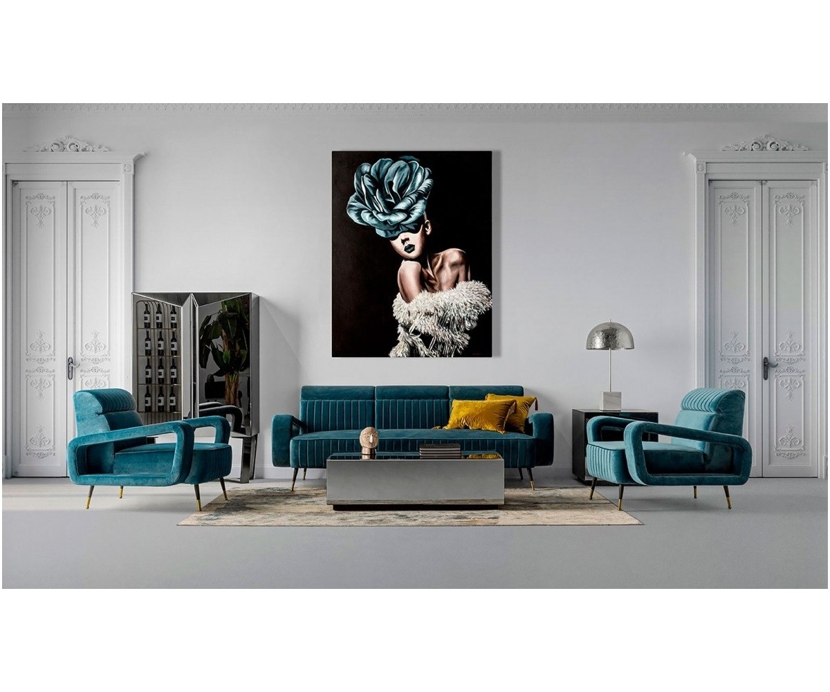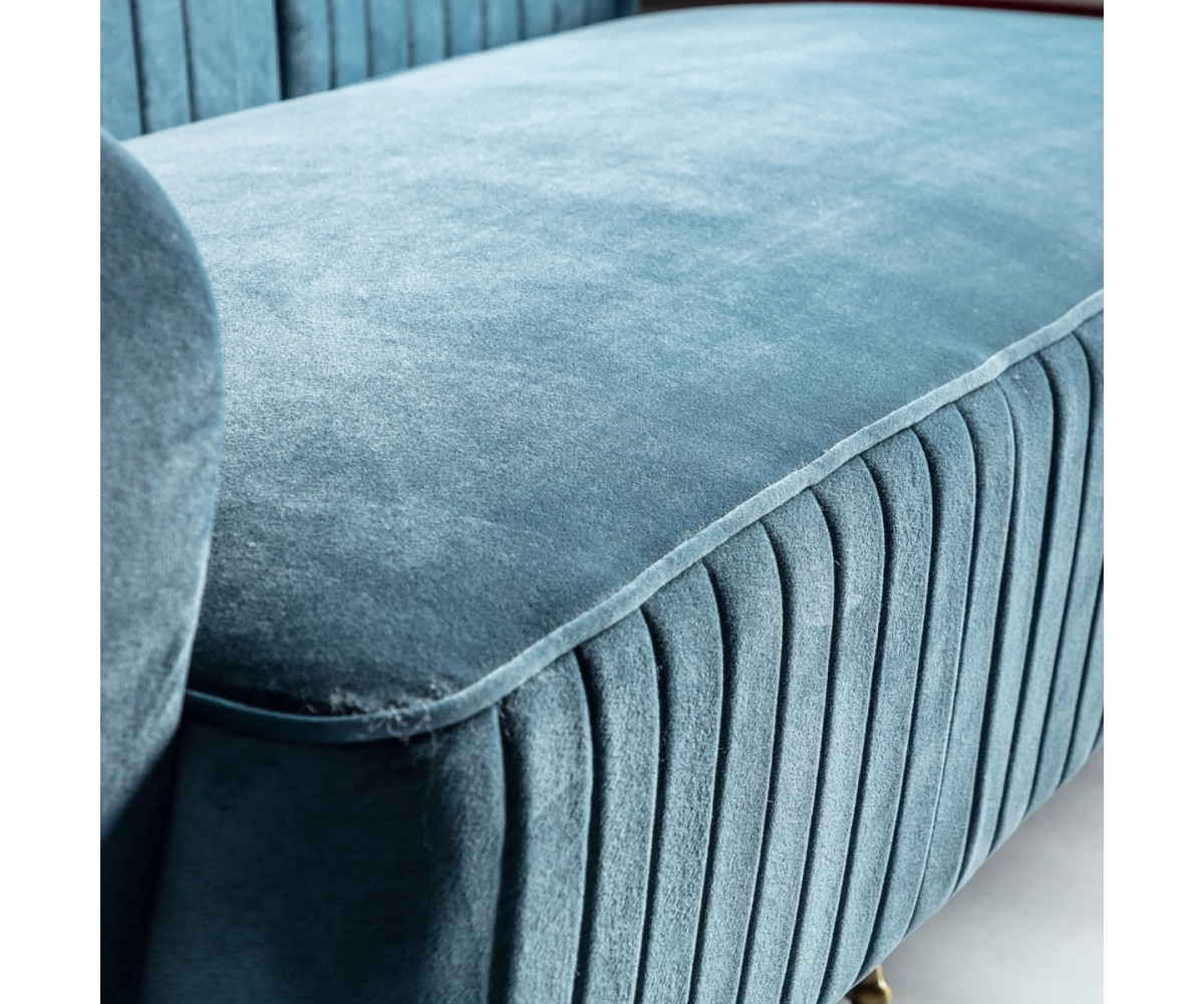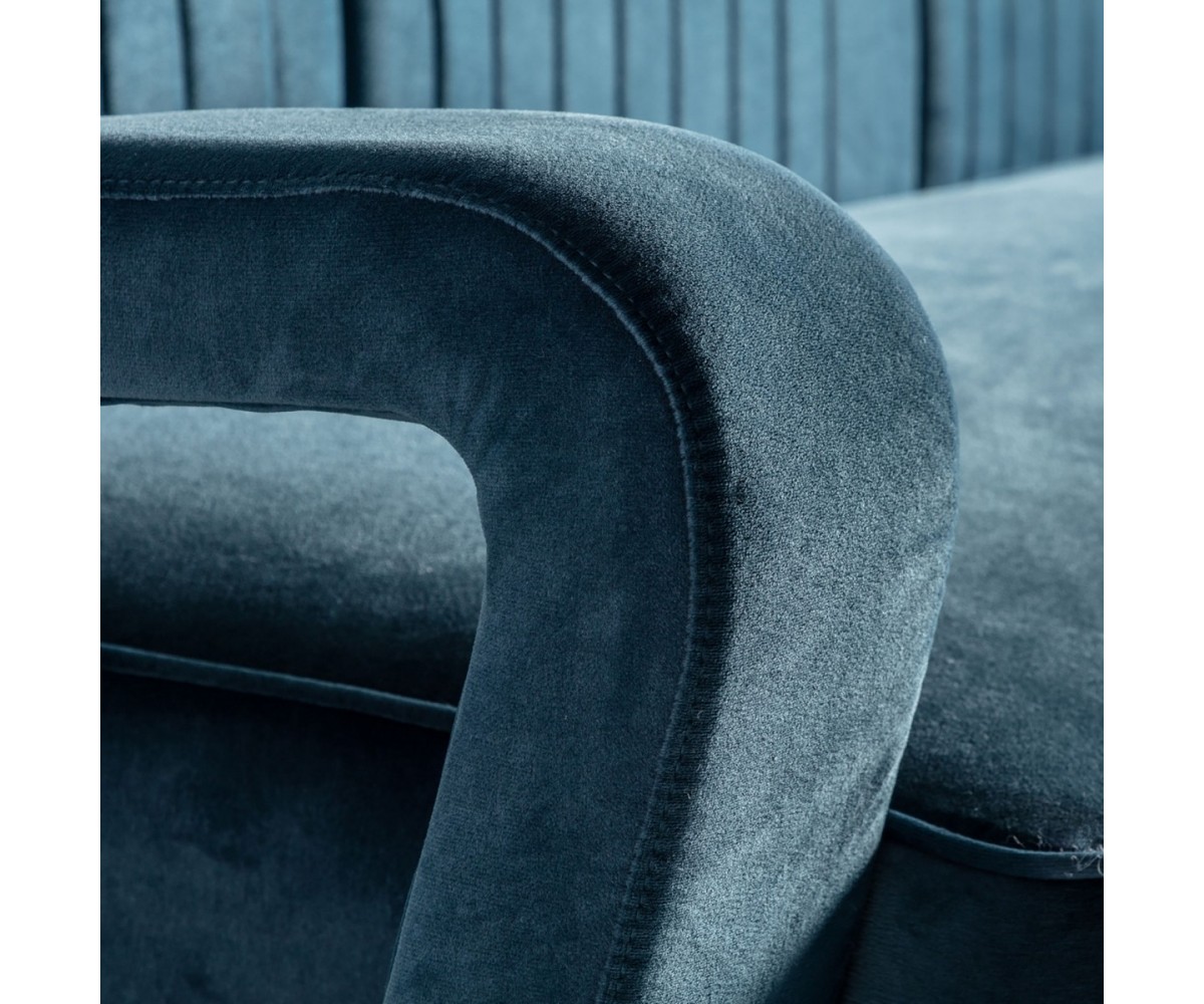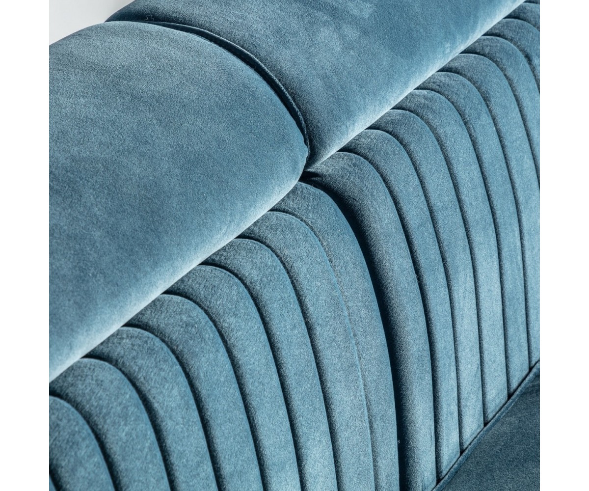 Sofá años 50, inspirado en un diseño de Fleming & Howland. Estructura de roble macizo de una pieza, relleno de polipropileno indeformable. Tapizado en tejido color turquesa 100% poliéster, terciopelo. Producto desmontable. Patas en acero cónico en negro y dorado.